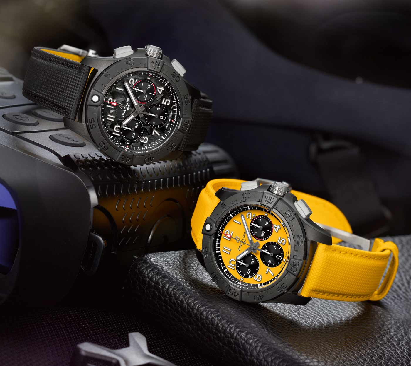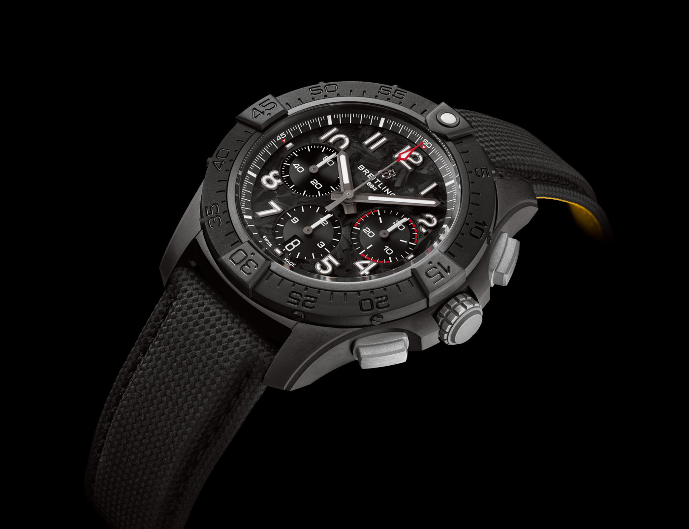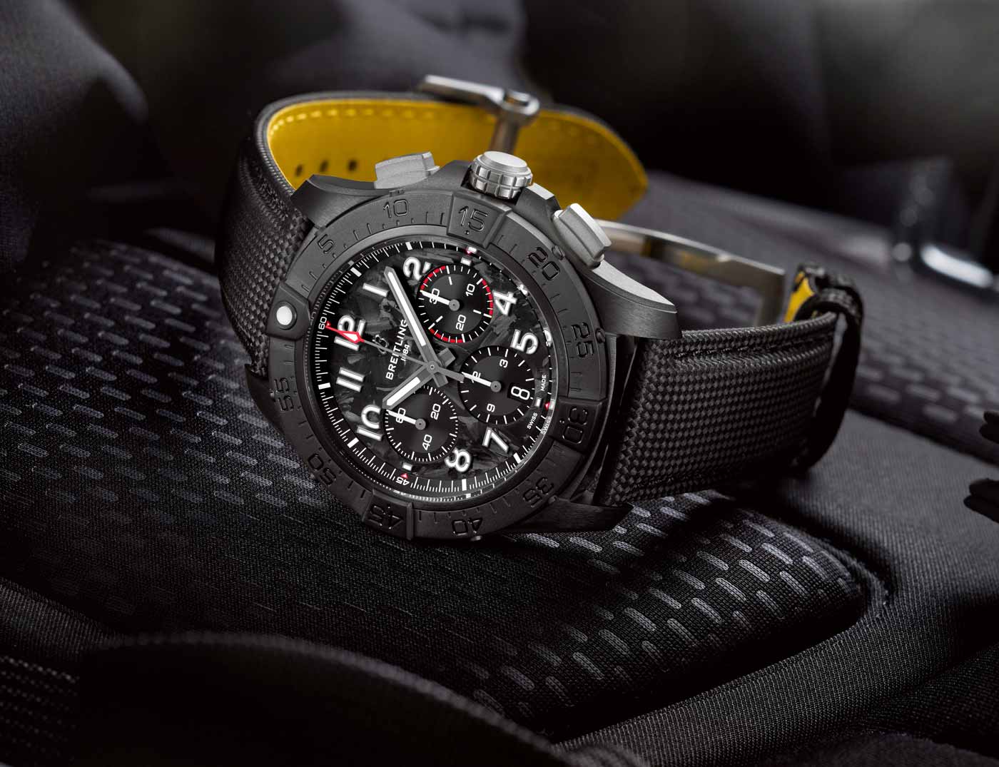 The lineups standout design is the Avenger Night Mission chronograph, available with a vibrant yellow or carbon black dial. It has a case constructed entirely of scratch-resistant ceramic, while the case-back, crown, pushers and buckle are crafted in solid titanium – providing the highest strength-to-weight ratio of any metal. On the dial, lume filled numerals made of carbon fiber provide superior legibility.
