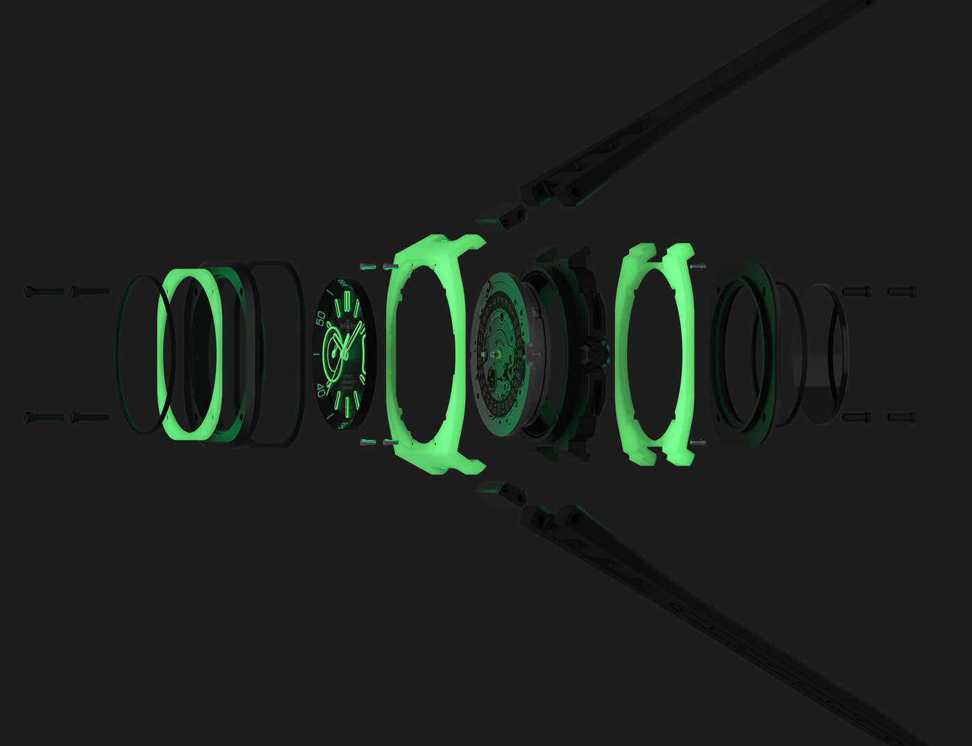While every Bell & Ross watch displays time even in the dark, the BR-X5 Green Lum goes further. To this day, luminescence has been applied to watch hands, numerals, indices and dials. On this new version of the BR-X5, it is the 41mm case that glows in the dark. The multi-component case alternates black DLC coated titanium with LM3D, a photo-luminescent composite material made from quartz fibers and specially developed for Bell & Ross. This multi-layer assembly emits an intense green glow reminiscent of runway landing strip lights. In the dark, green emission Super-LumiNova outlines the matte black dial’s indications: hours, minutes, seconds, date and power reserve. Green lume also highlights key components of the Kenissi-designed Calibre BR-CAL.323 automatic movement, which has a power reserve of 70 hours. Available for pre-order in a limited edition of 500 pieces.
