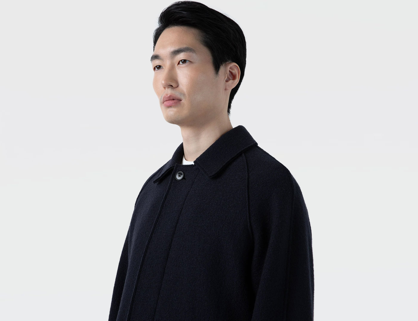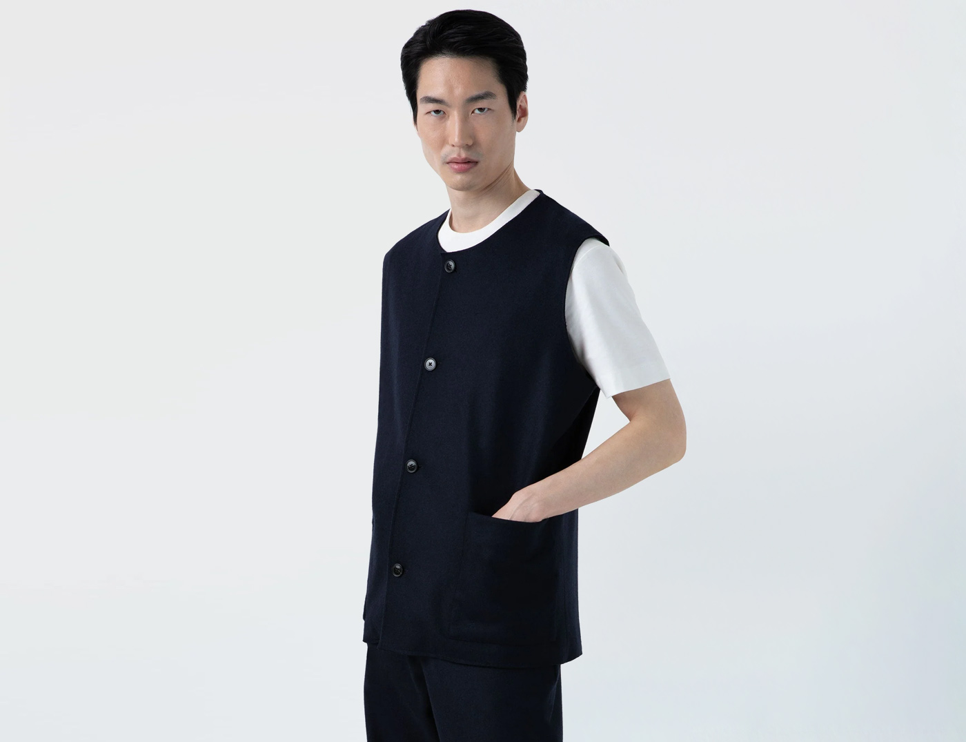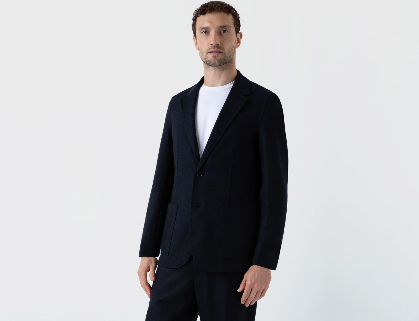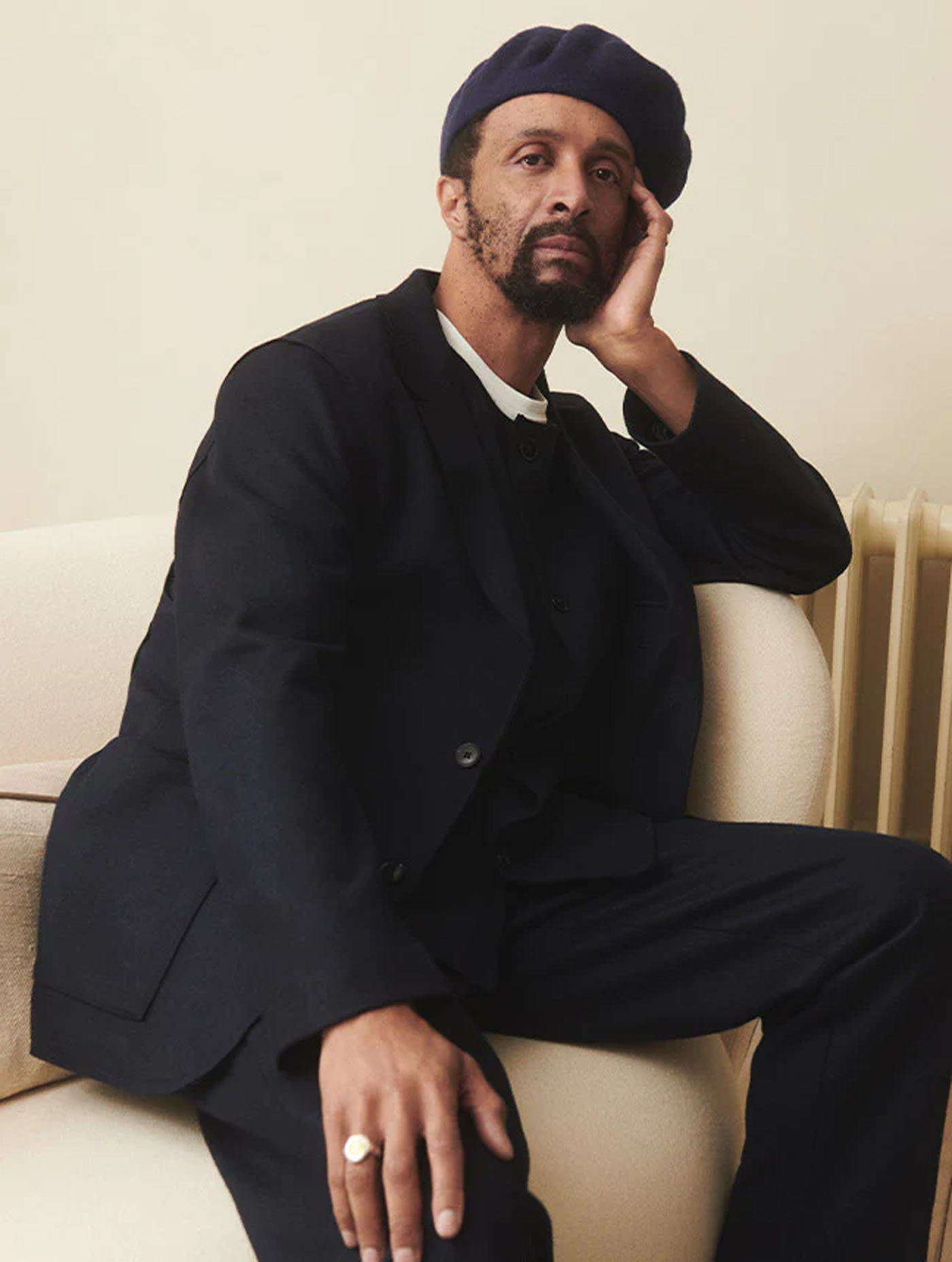Two years after their first collaboration, Sunspel and Casely-Hayford teamed up again to explore how the three-piece suit fits into the modern wardrobe. “Despite all the headlines in the tailoring and fashion world, a lot of guys do want to wear suits,” says Charlie Casely-Hayford. “They’re just wearing them in a different way. The suit doesn’t need to be this separate thing in the wardrobe that you only wear for special occasions. It can be integrated into it.” This integration requires a considered approach to suit separates, ensuring that each piece is versatile enough to wear independently in a variety of situations. To do this, Sunspel developed a boiled wool jersey inspired by fabrics from their archive. The lightweight, super-soft fabric “doesn’t feel like suiting at all when you’re wearing it but looks smart enough that it can be dressed up,” Charlie explains. With visible raw edge hems, the five interchangeable pieces have an easy, deconstructed look. The trouser has a full fit while the suit jacket is unstructured with a relaxed silhouette and is interchangeable with the waistcoat. Rounding out the collection is a cropped jacket and an oversized topcoat, both made from a denser, more textured boiled wool jersey.