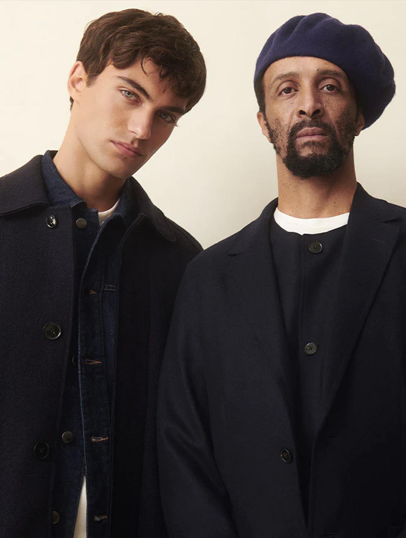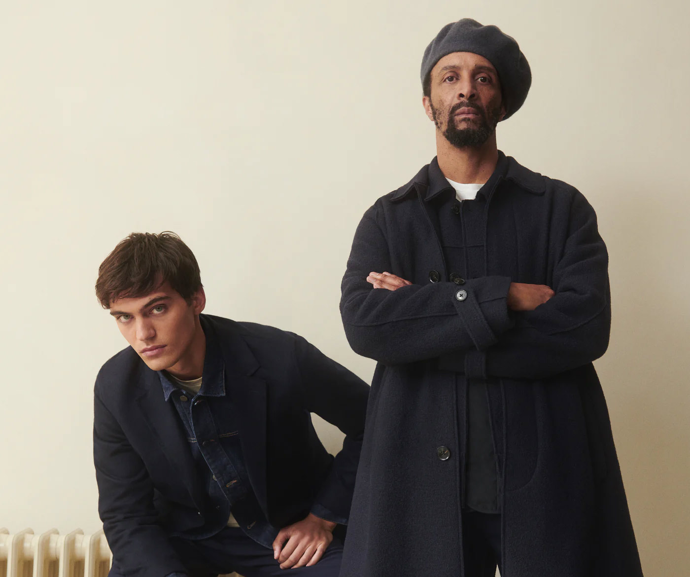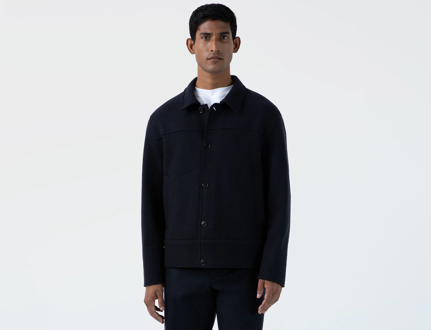 Two years after their first collaboration, Sunspel and Casely-Hayford teamed up again to explore how the three-piece suit fits into the modern wardrobe. “Despite all the headlines in the tailoring and fashion world, a lot of guys do want to wear suits,” says Charlie Casely-Hayford. “They’re just wearing them in a different way. The suit doesn’t need to be this separate thing in the wardrobe that you only wear for special occasions. It can be integrated into it.” This integration requires a considered approach to suit separates, ensuring that each piece is versatile enough to wear independently in a variety of situations. To do this, Sunspel developed a boiled wool jersey inspired by fabrics from their archive. The lightweight, super-soft fabric “doesn’t feel like suiting at all when you’re wearing it but looks smart enough that it can be dressed up,” Charlie explains. With visible raw edge hems, the five interchangeable pieces have an easy, deconstructed look. The trouser has a full fit while the suit jacket is unstructured with a relaxed silhouette and is interchangeable with the waistcoat. Rounding out the collection is a cropped jacket and an oversized topcoat, both made from a denser, more textured boiled wool jersey.