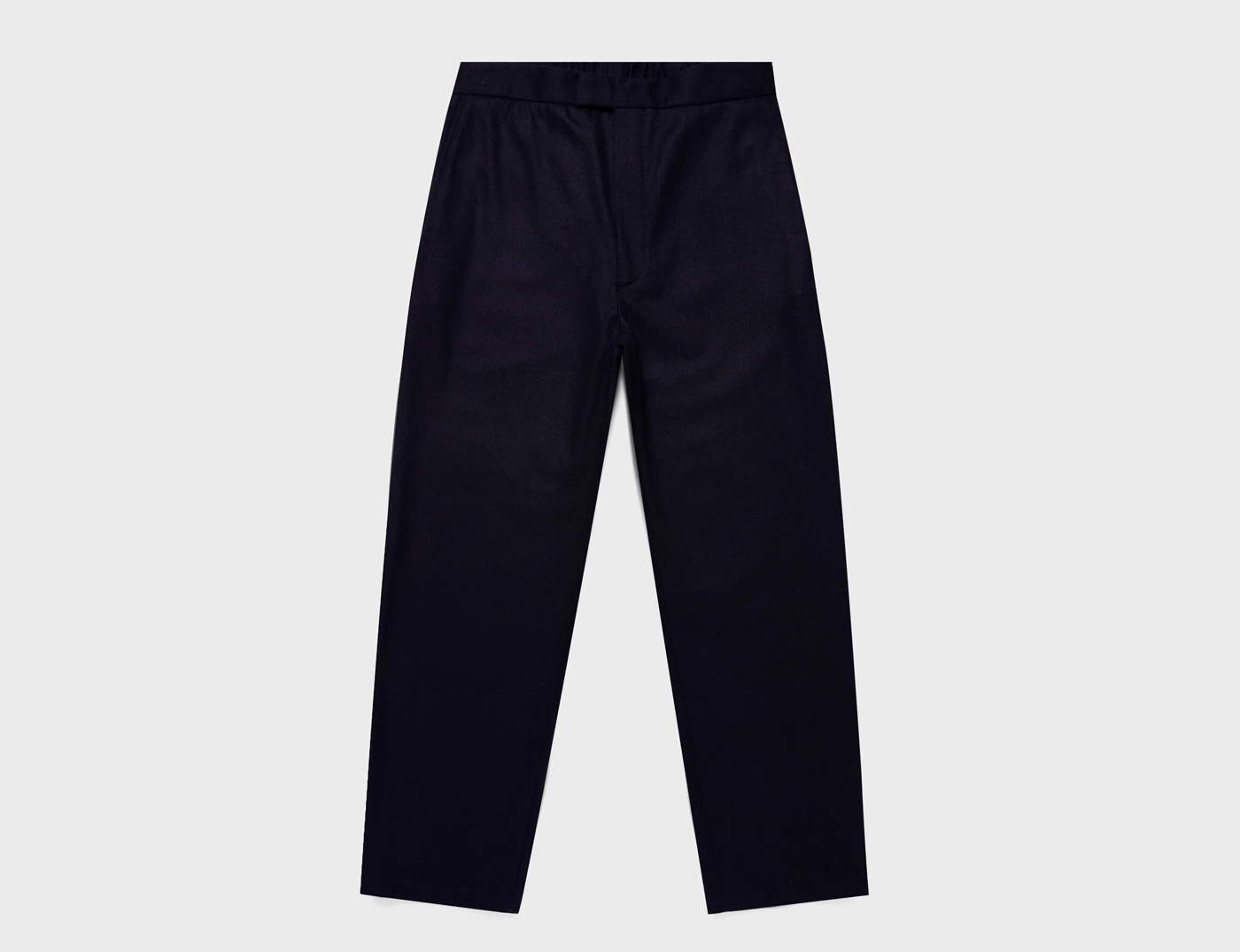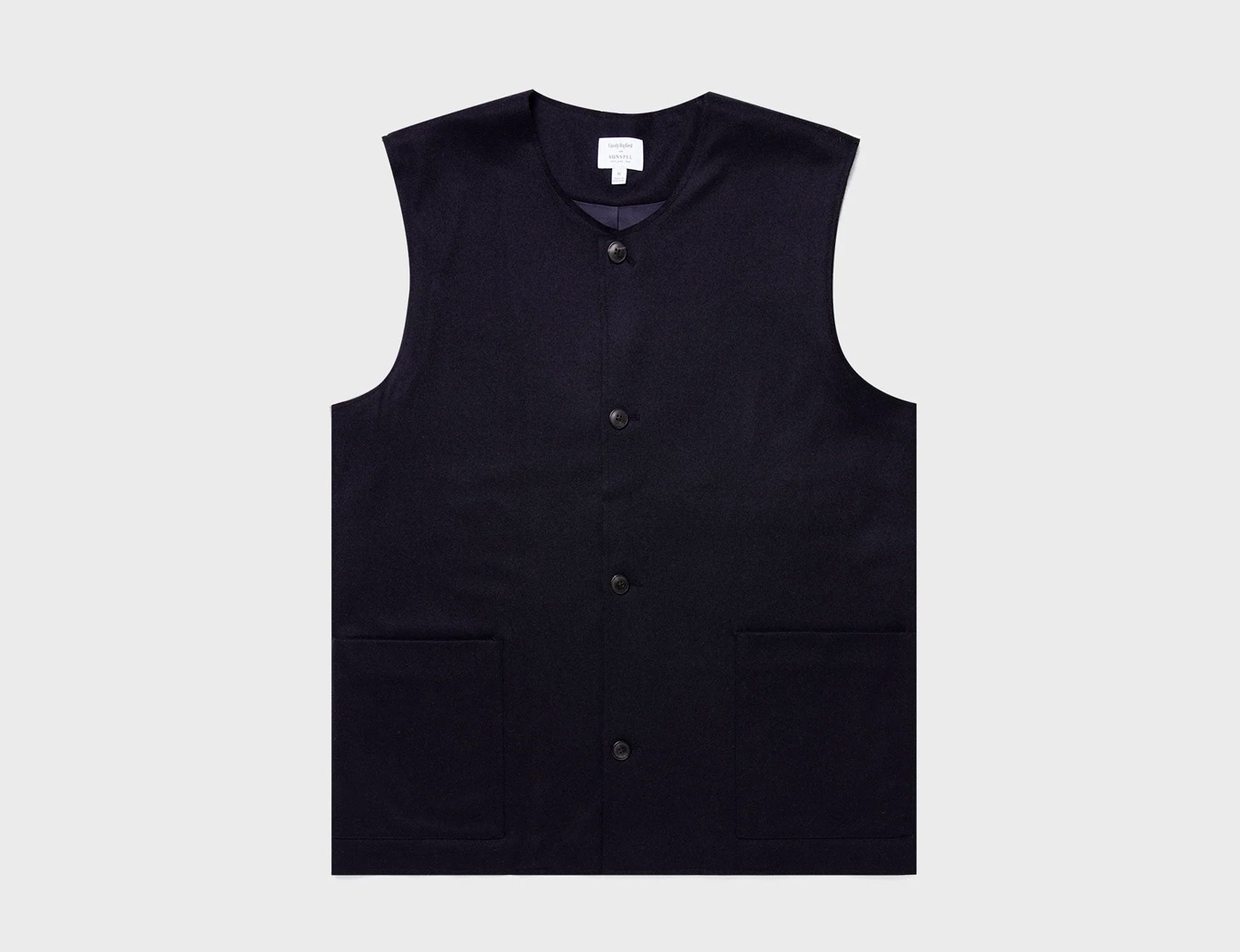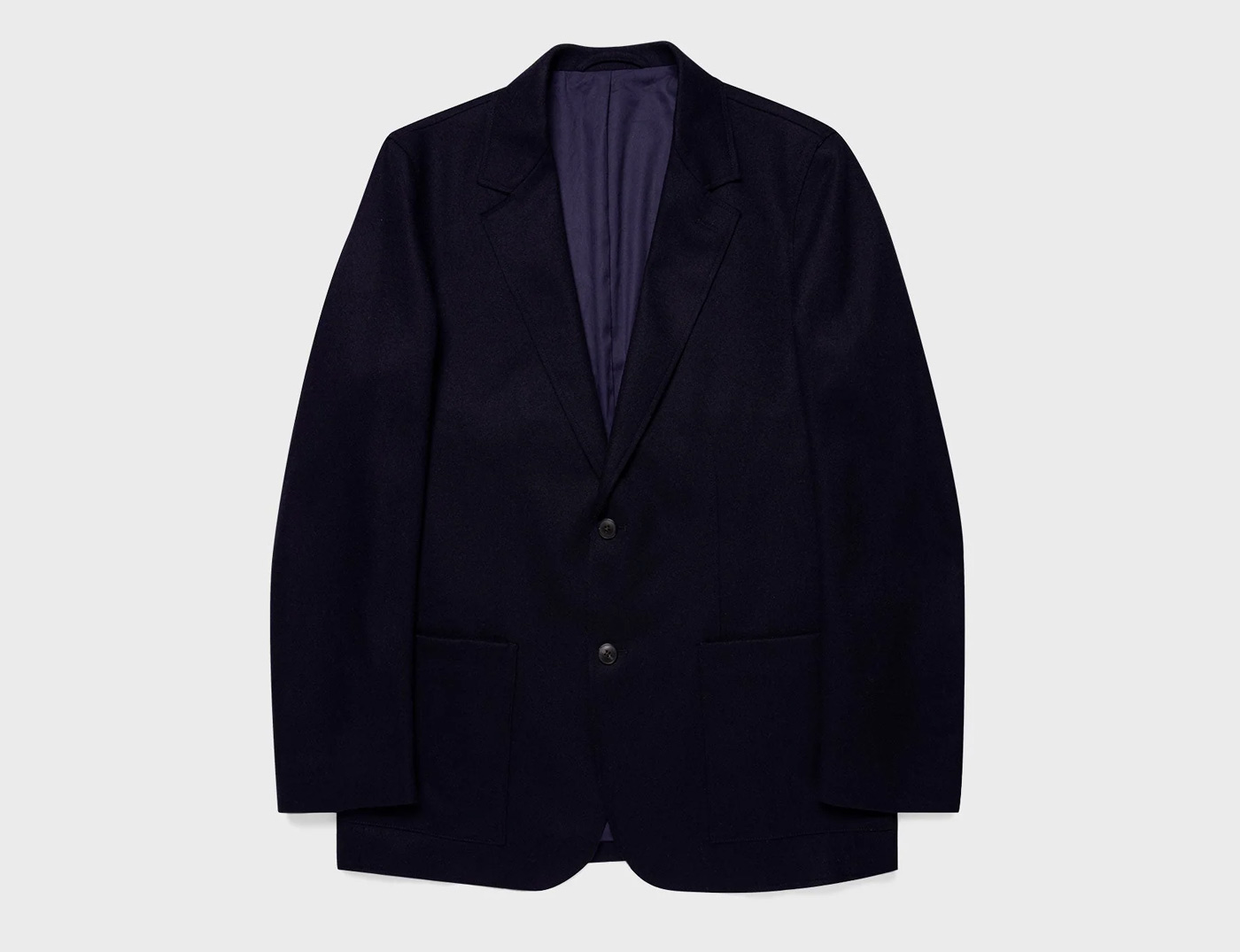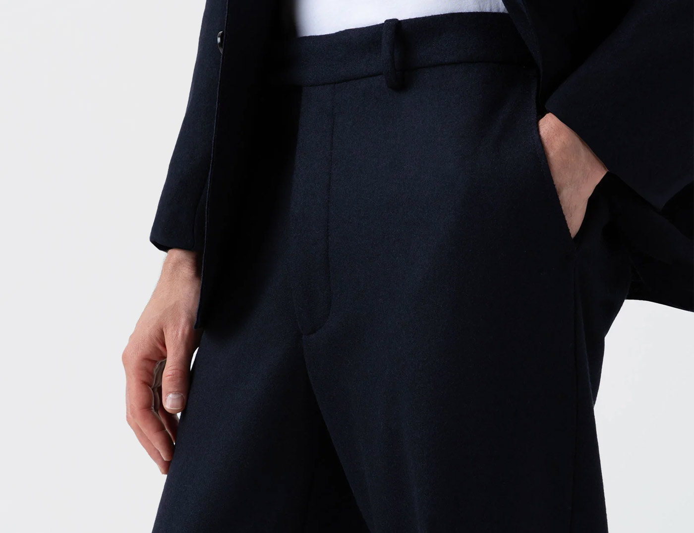 Two years after their first collaboration, Sunspel and Casely-Hayford teamed up again to explore how the three-piece suit fits into the modern wardrobe. “Despite all the headlines in the tailoring and fashion world, a lot of guys do want to wear suits,” says Charlie Casely-Hayford. “They’re just wearing them in a different way. The suit doesn’t need to be this separate thing in the wardrobe that you only wear for special occasions. It can be integrated into it.” This integration requires a considered approach to suit separates, ensuring that each piece is versatile enough to wear independently in a variety of situations. To do this, Sunspel developed a boiled wool jersey inspired by fabrics from their archive. The lightweight, super-soft fabric “doesn’t feel like suiting at all when you’re wearing it but looks smart enough that it can be dressed up,” Charlie explains. With visible raw edge hems, the five interchangeable pieces have an easy, deconstructed look. The trouser has a full fit while the suit jacket is unstructured with a relaxed silhouette and is interchangeable with the waistcoat. Rounding out the collection is a cropped jacket and an oversized topcoat, both made from a denser, more textured boiled wool jersey.