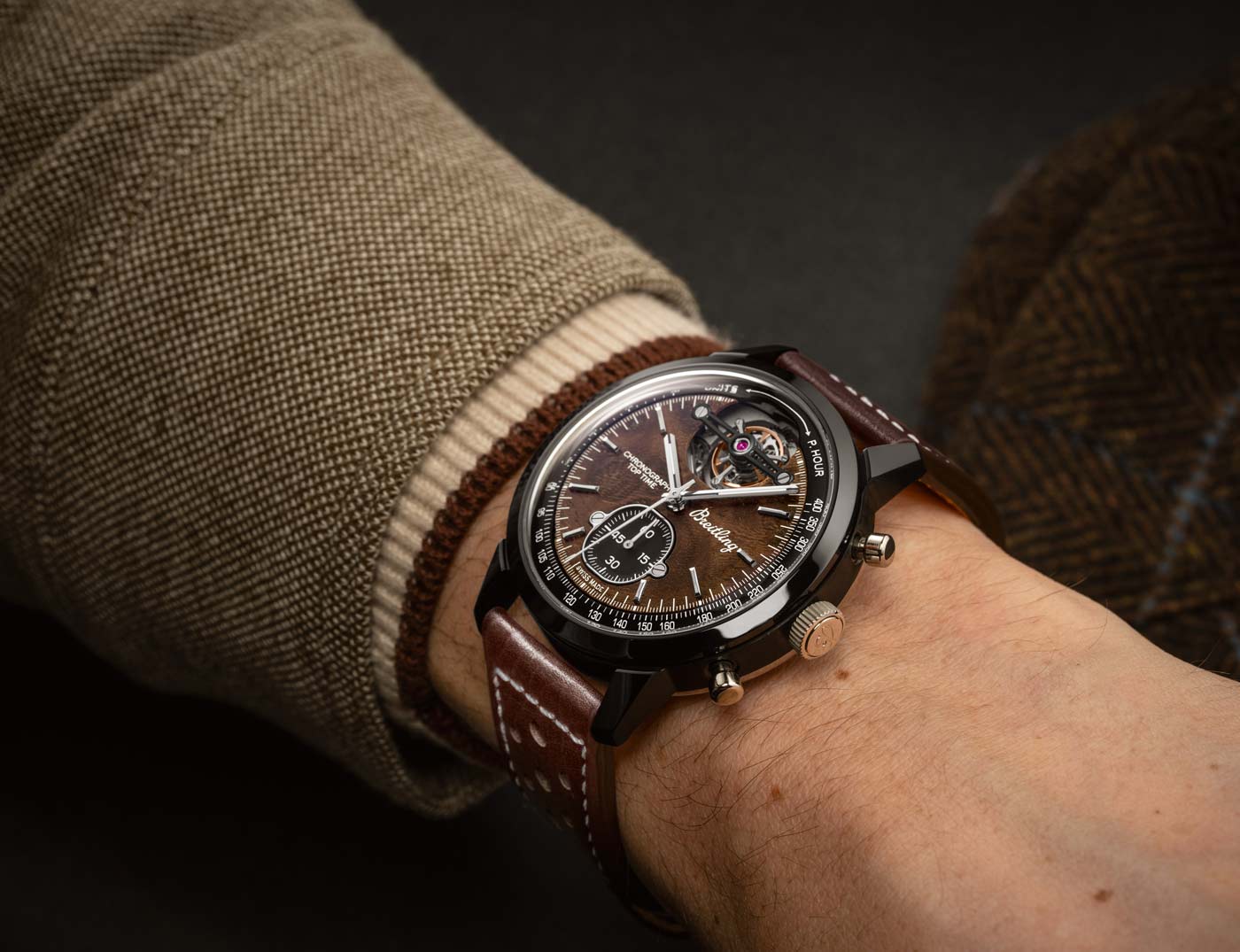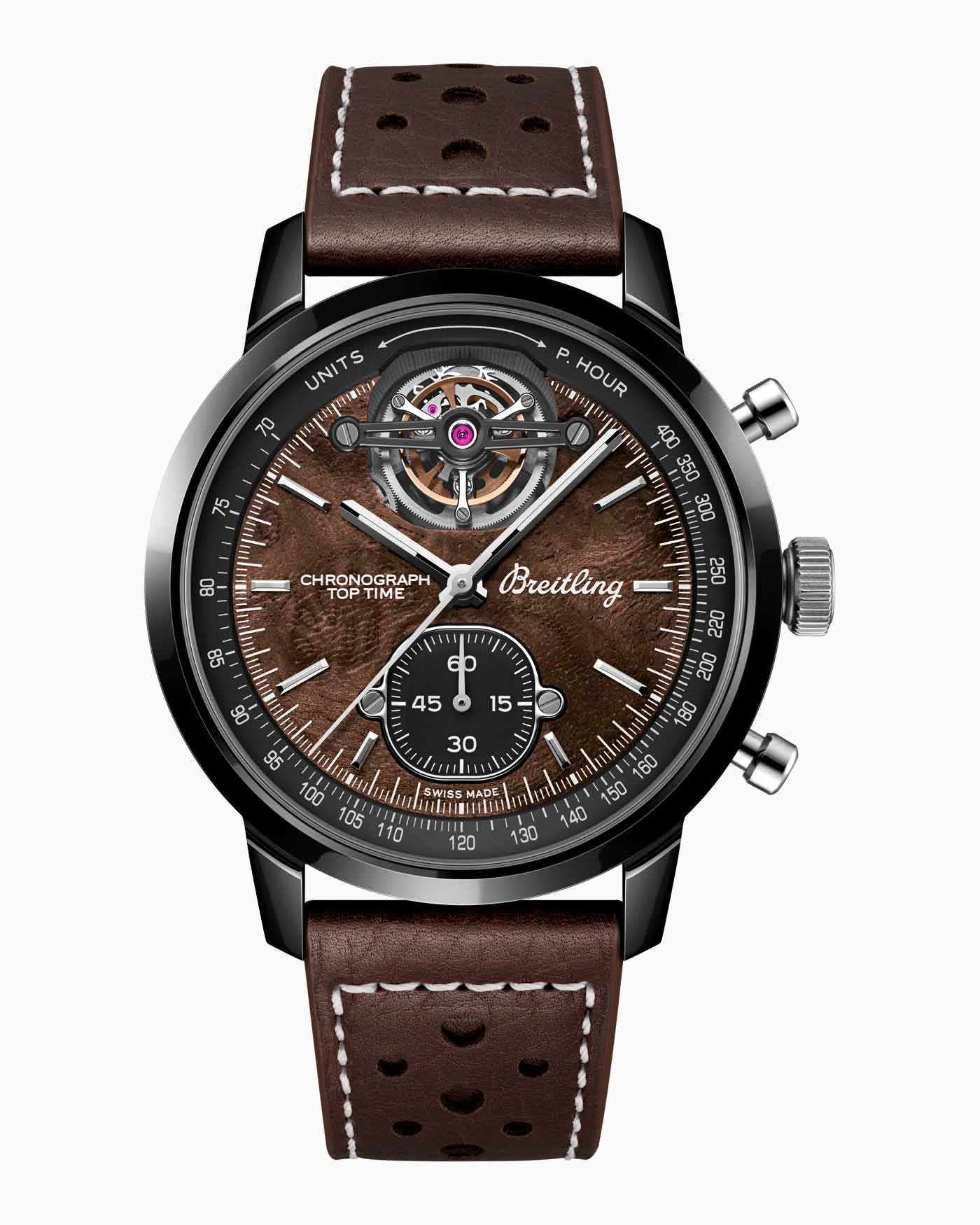 Breitling is adding a tourbillon to the Top Time Classic Cars Collection, the watch series inspired by the Ford Mustang, Chevrolet Corvette, and Shelby Cobra. The Top Time B21 Classic Cars Chronograph Tourbillon is equipped with the same Breitling Caliber B21 that made its debut last year in the Premier Tourbillon. Breitling worked with specialty movement maker Manufacture La Joux-Perret to develop the mechanism, which combines a tourbillon with a chronograph. Cases crafted from exotic materials – combinations of bronze, ceramic, and titanium for the cases, and walnut burl on one of the dials – showcase the unusual mix of complications.