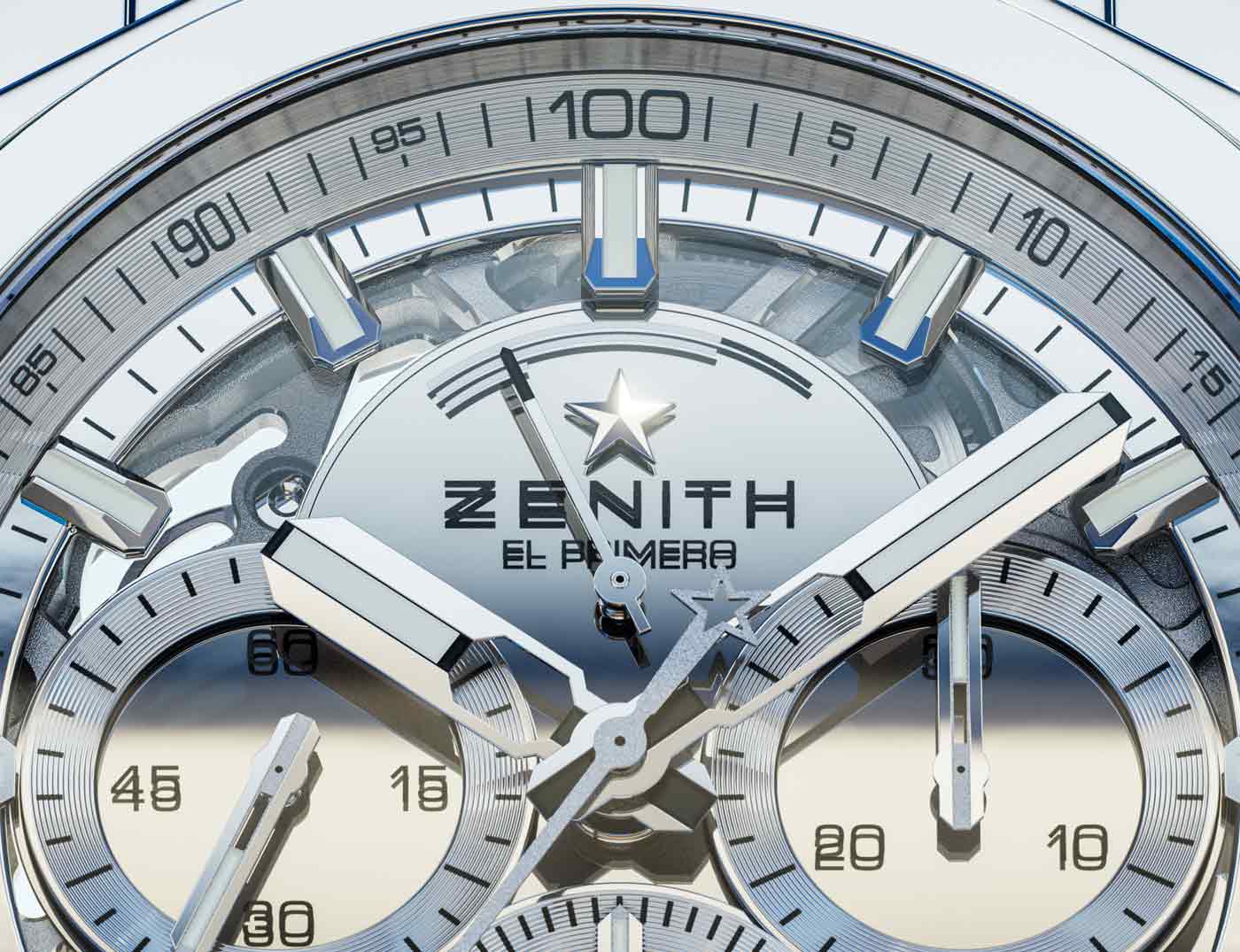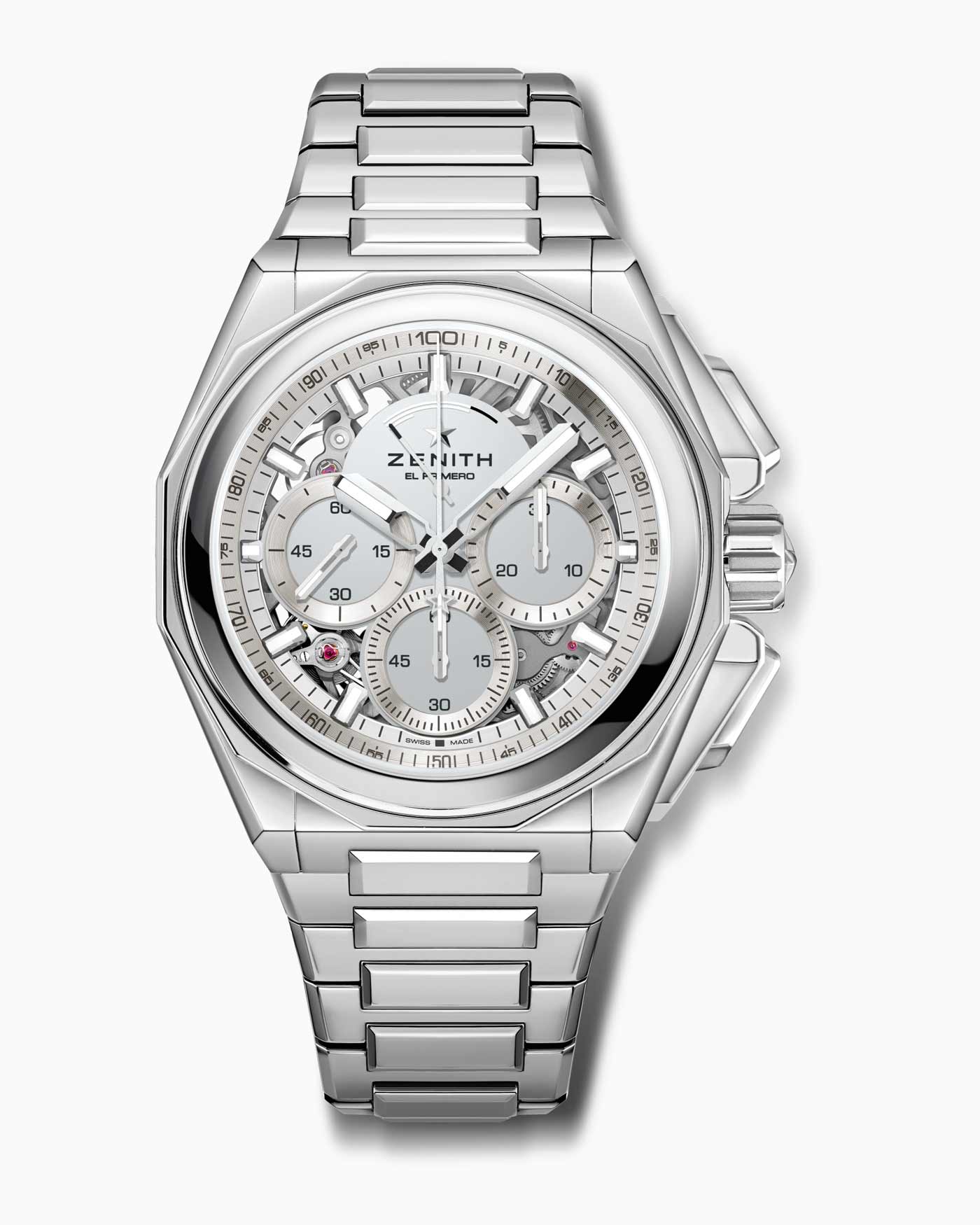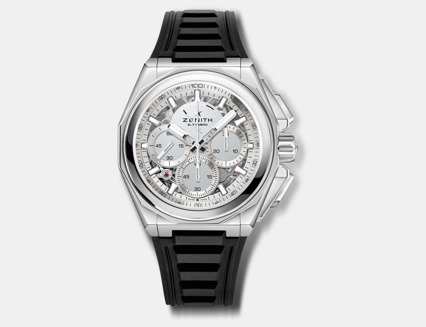 The openwork sapphire crystal dial features a metallic mirrored finish that’s both translucent and reflective. Partially visible through the dial as well as the sapphire case back is Zenith’s high-frequency chronograph calibre, offering 1/100th of a second time measurements by means of two independent escapements beating at the rates of 5Hz (36’000 VpH) for the timekeeping part and 50Hz (360’000 VpH) for the chronograph function. In addition to the mirror-polished stainless steel bracelet, each watch comes with a black rubber strap and a black Velcro strap – both easily swapped using the quick strap-change mechanism on the back of the case.