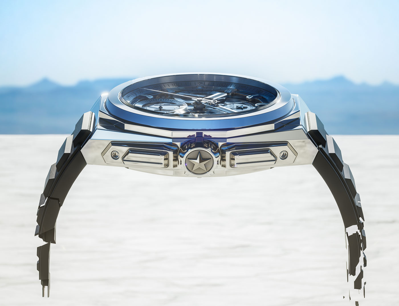 The newest addition to Zenith’s Defy Extreme collection is crafted in mirror-polished stainless steel. From the gleaming 45-mm steel case and integrated bracelet to the open dial with a mirrored sapphire crystal element, the Defy Extreme Mirror is designed to reflect the light and colors of its surrounding without distortion. Zenith describes the optical effect as conceptual camouflage.
