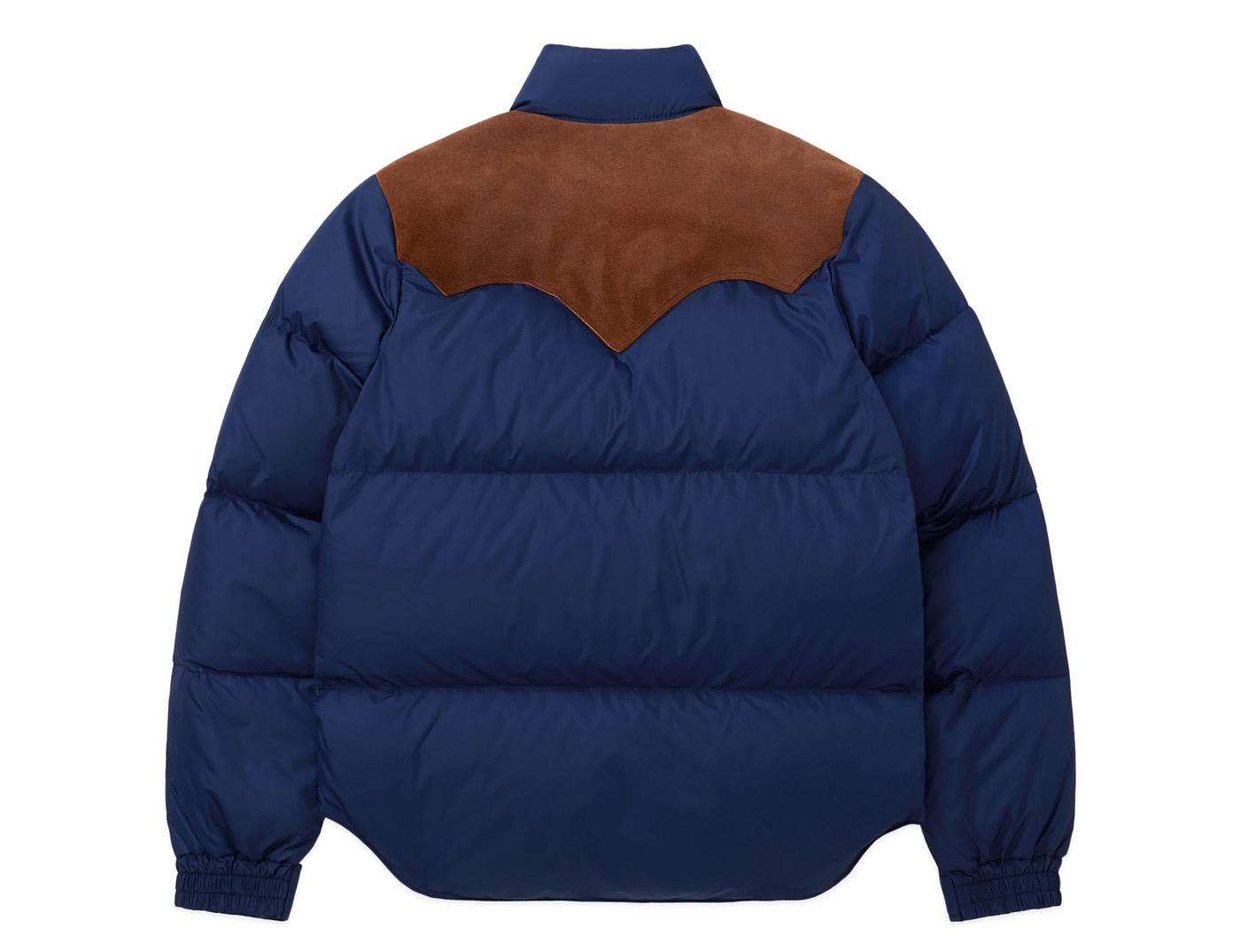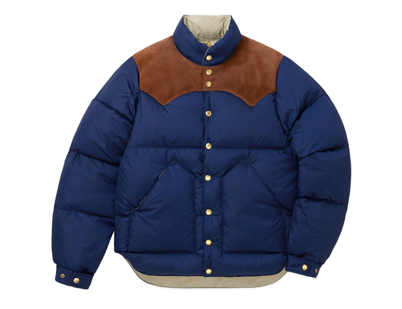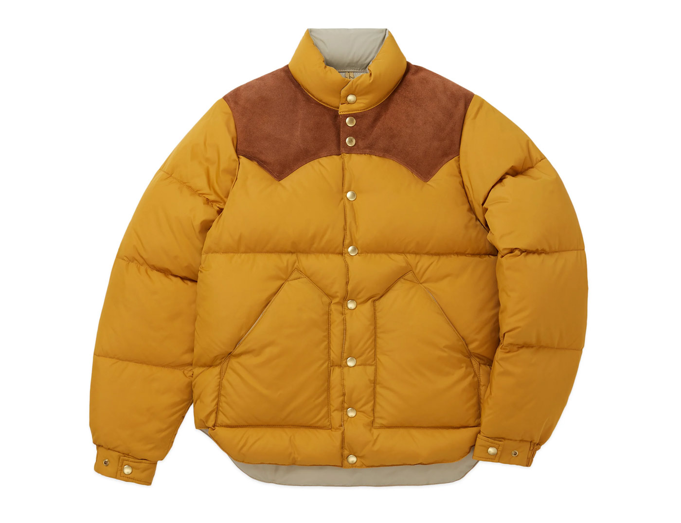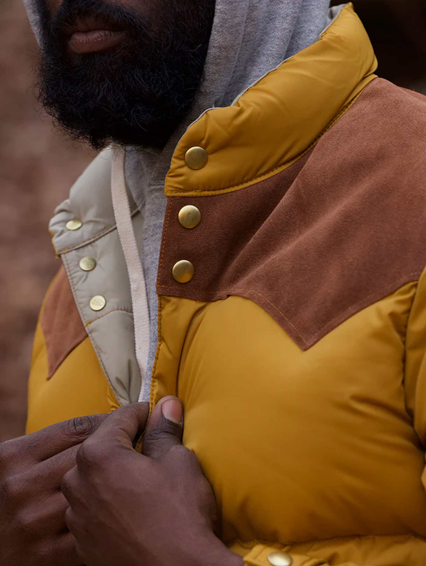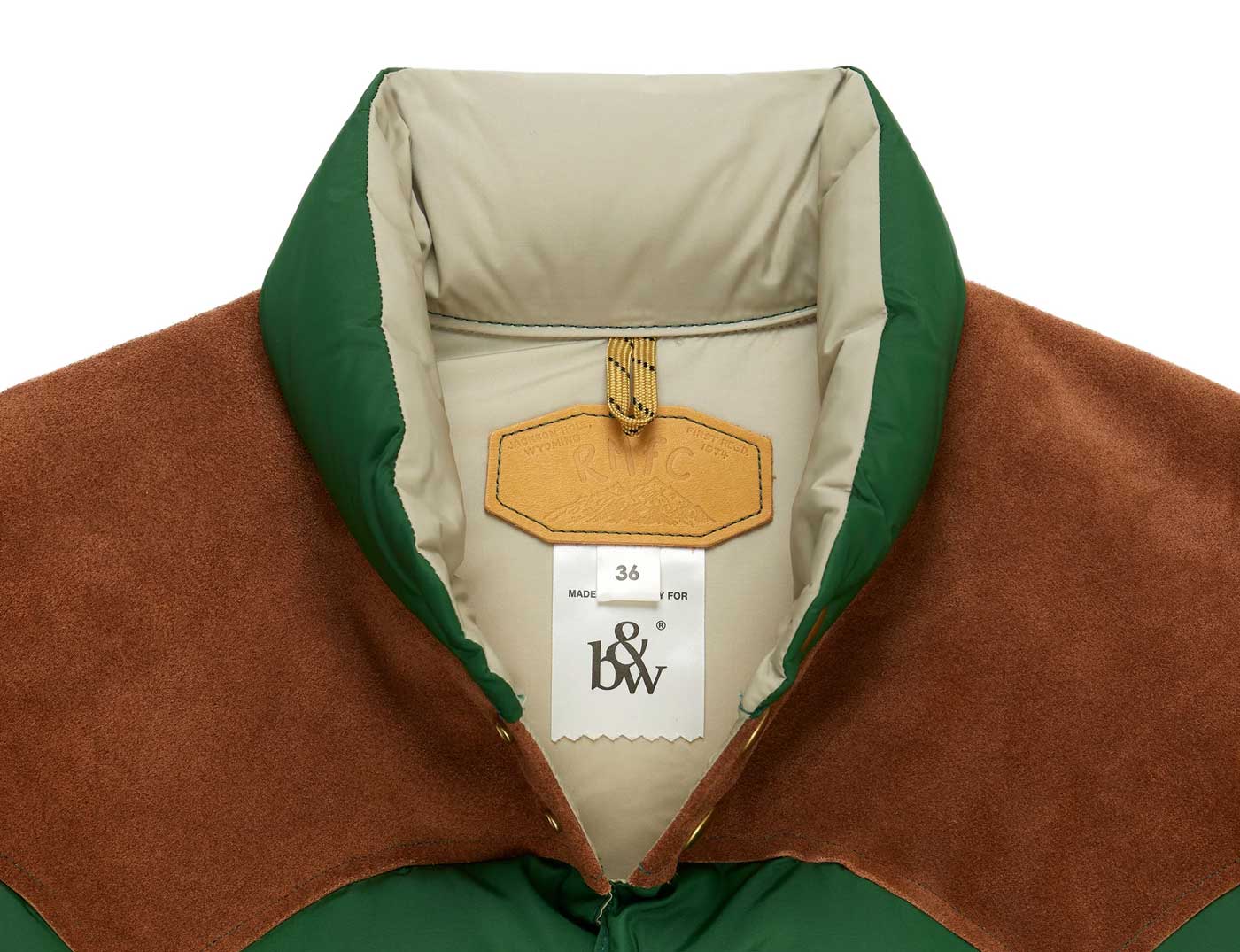 For their second collaboration, Blackstock & Weber dug through the Rocky Mountain Featherbed archives to bring the Christy Jacket back to life in three exclusive colorways. Rocky Mountain Featherbed was founded in Wyoming in the 1960’s. Their down vests were popular with skiers and cowboys, who appreciated the lightweight warmth and Western styling. The company folded in the 1980’s before it was revitalized by Japanese collectors who loved the brands quality and retro vibe. Available in Mustard, Navy and Bottle Green, this version of RMFB’s classic puffer features a water-repellent nylon taffeta shell, European down fill, brass snap closures and seamless leather yoke. The jackets are produced in Japan exclusively for Blackstock & Weber to the same exacting standards as the 1960’s original.