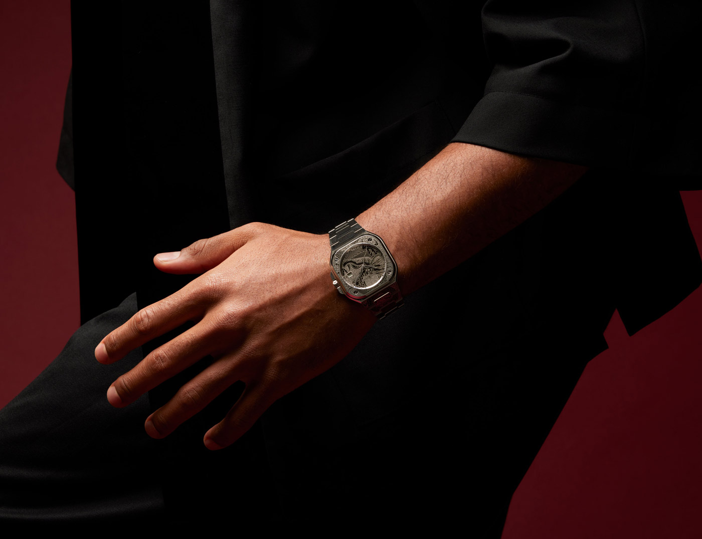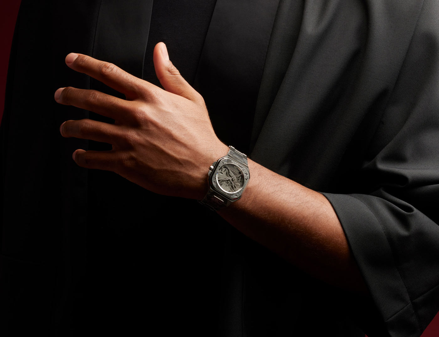 The BR 05 Artline Dragon features a laser engraved Wood Dragon ‘tattoo’ snaking across the case, dial and integrated bracelet. For the bracelet, this involves engraving each link individually, before assembly. The dragon’s face is centered on the dial, with black lacquer filled hour and minute hands shaped like whiskers. Limited to 99 pieces, this model is powered by a Swiss-made calibre BR-CAL.321 automatic movement that can be viewed through the sapphire crystal case back.