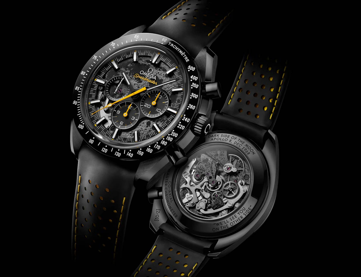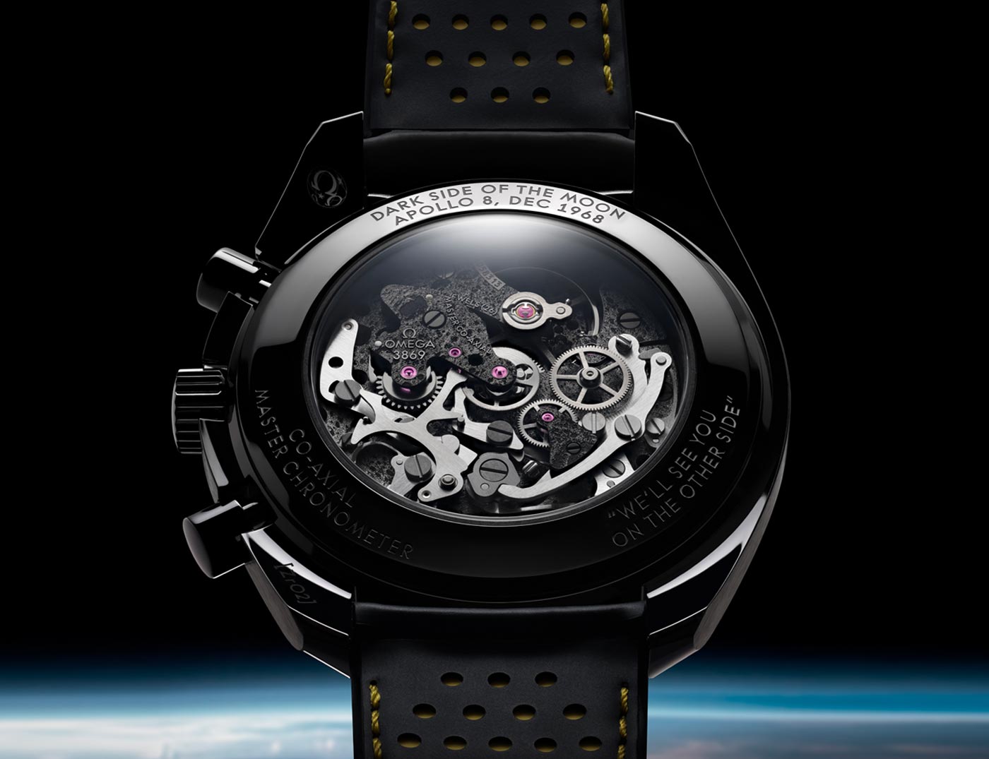 Omega just released a new and improved version of the Speedmaster Dark Side of the Moon. The original Dark Side of the Moon watch was released in 2018, marking the 50th anniversary of the Apollo 8 mission. The updated design sports an engraved Moon relief on the blackened main plate and bridges of the movement. Just like the Moon, the Calibre 3869 movement reveals two different sides. The dial-side represents the lunar surface as seen from Earth, while the back of the watch shows the dark side of the moon. This moon decoration is visible through the skeleton dial, crafted from black anodized aluminum, and the exhibition caseback. Omega used separate pieces of black ceramic to create the 44.25 mm case, case-back and polished bezel – etched with a tachymeter scale filled with bright white enamel. The finishing touch is the patent pending small-seconds hand at 9 o’clock, engineered from grade 5 titanium and shaped like NASA’s iconic Saturn V rocket.