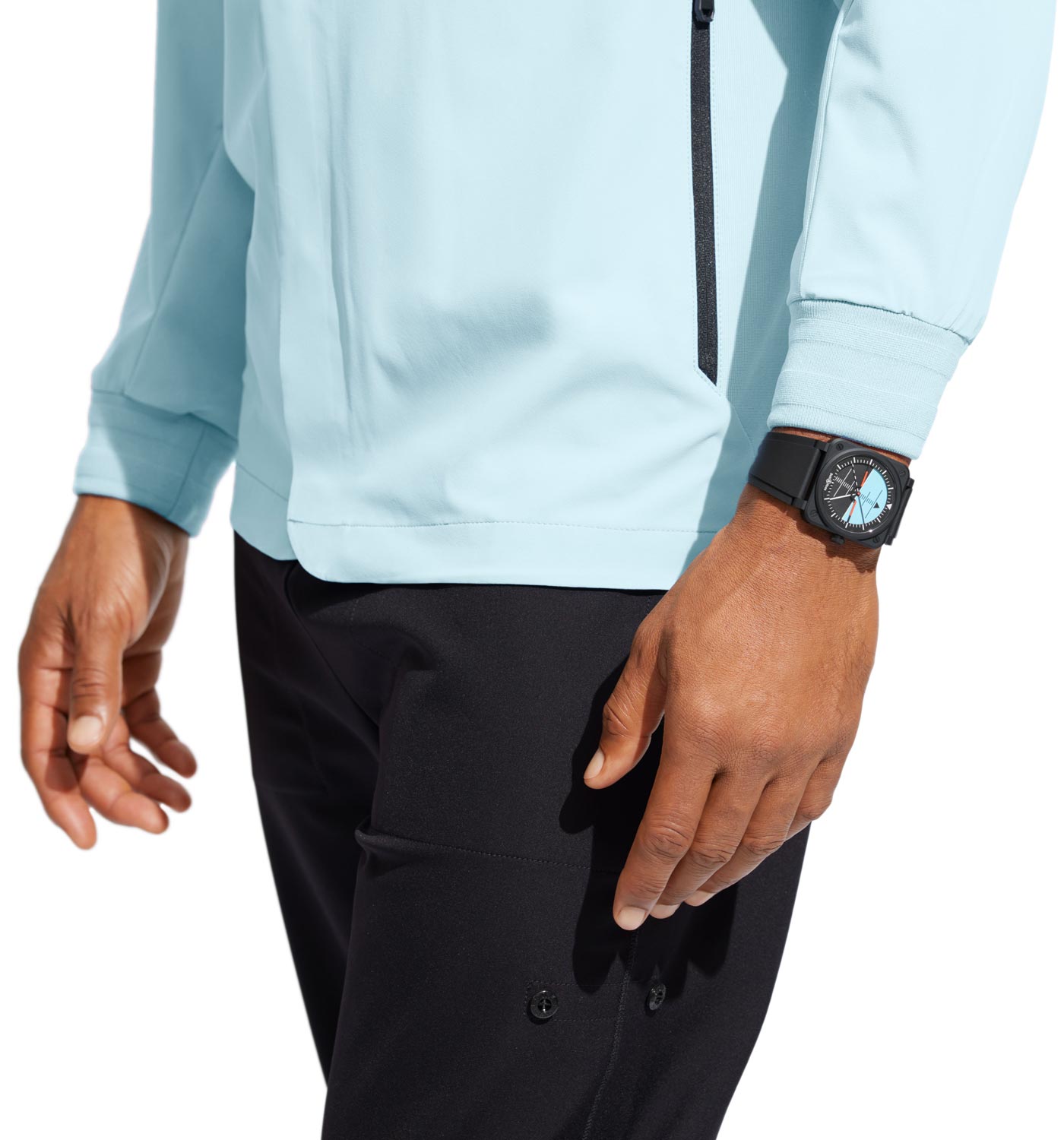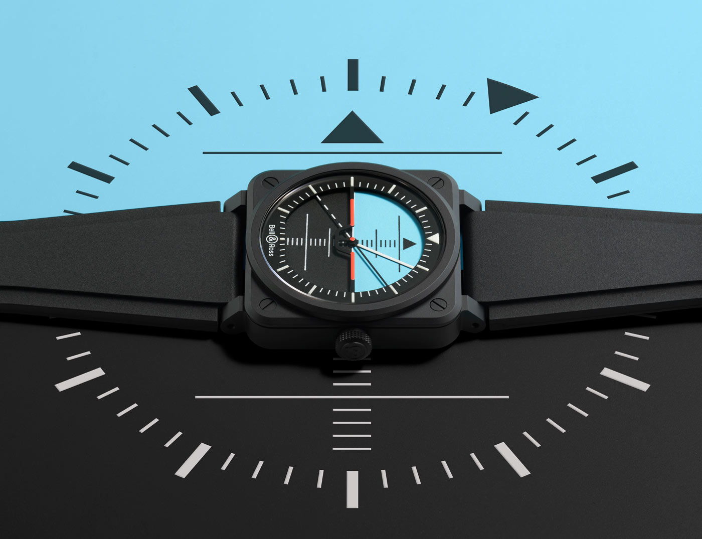 The BR-03 Horizon takes design cues from the attitude indicator, a key component of an aircraft’s primary flight display. Also known as the artificial horizon, this vertical gyroscope represents the aircraft’s orientation (pitch and bank) relative to Earth’s horizon: red aircraft wings in the center with blue for the sky and dark for the earth.