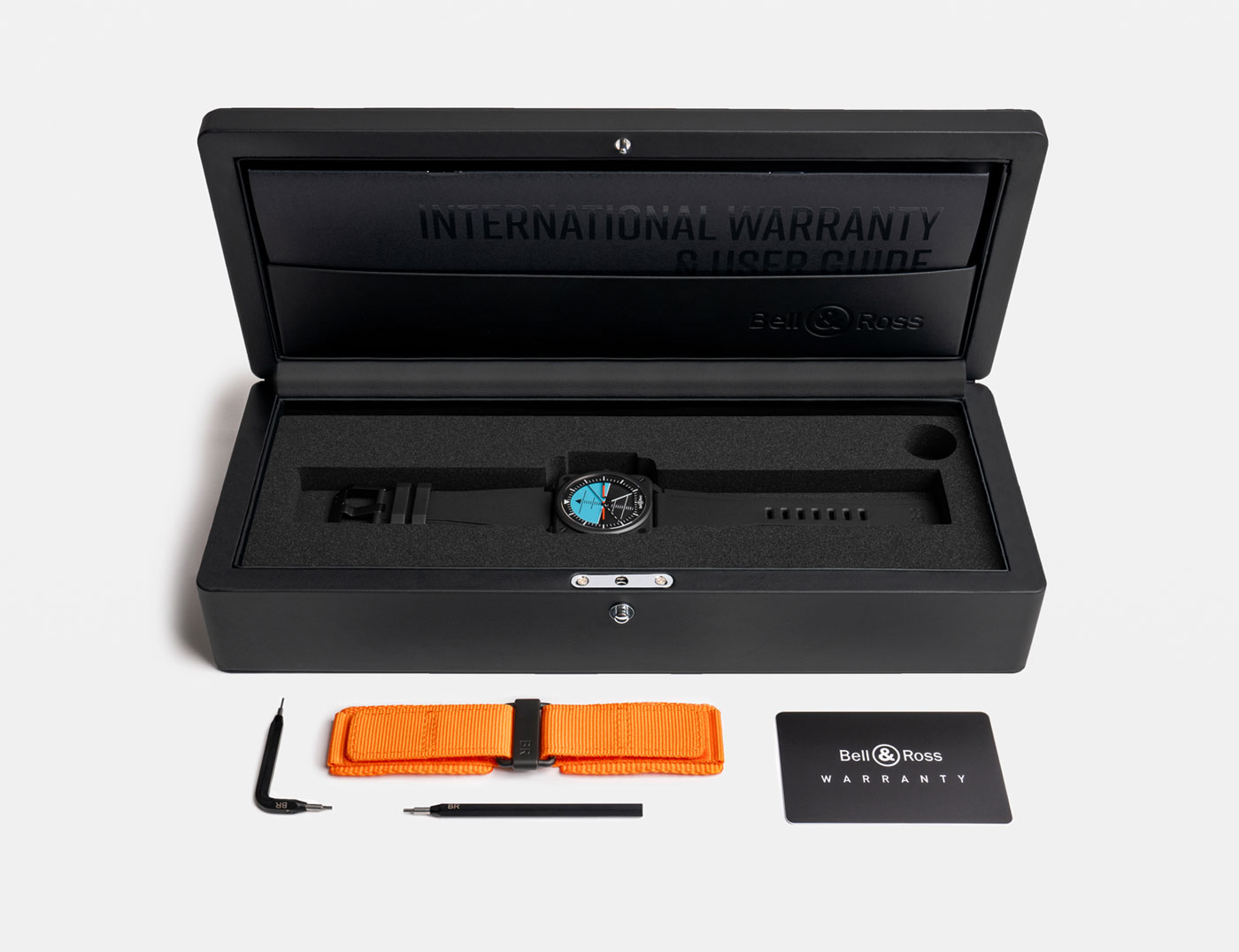 To maintain the spirit of the design while ensuring legibility, Bell & Ross streamlined the display with a white hand for the minutes, black hand for the seconds and a large arrow indicating the hours on the central blue and black disc. Equipped with the BR.CAL-327 movement, the BR-03 Horizon offers a 54 hour power reserve and is water resistant to 100 meters. Limited to 999 pieces.