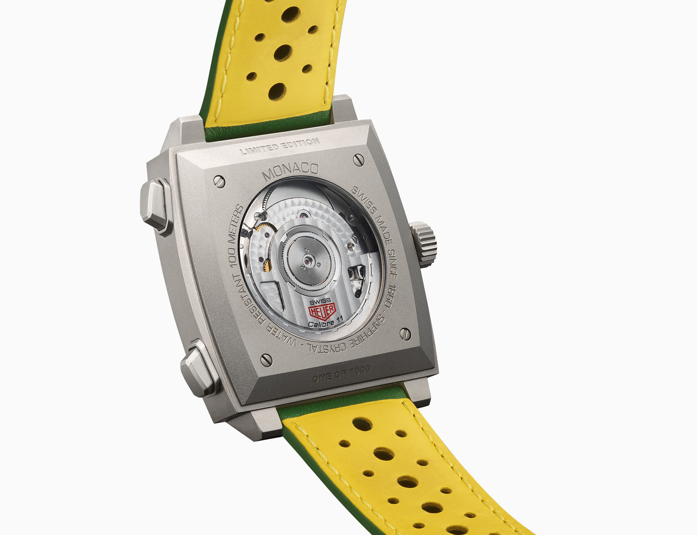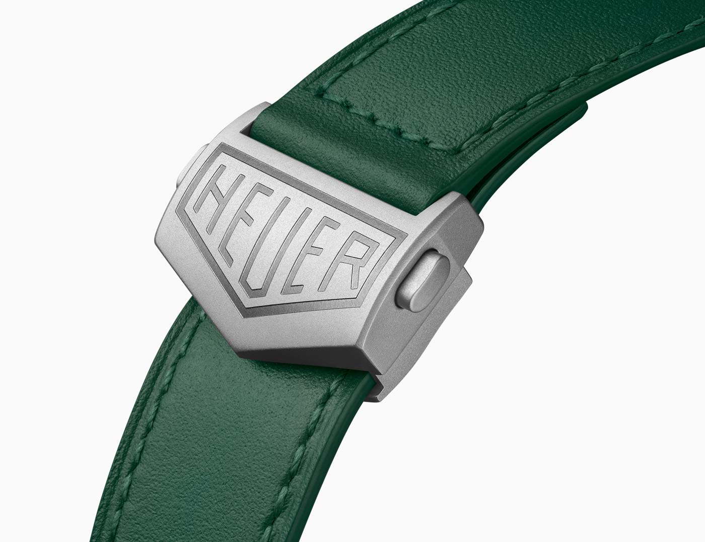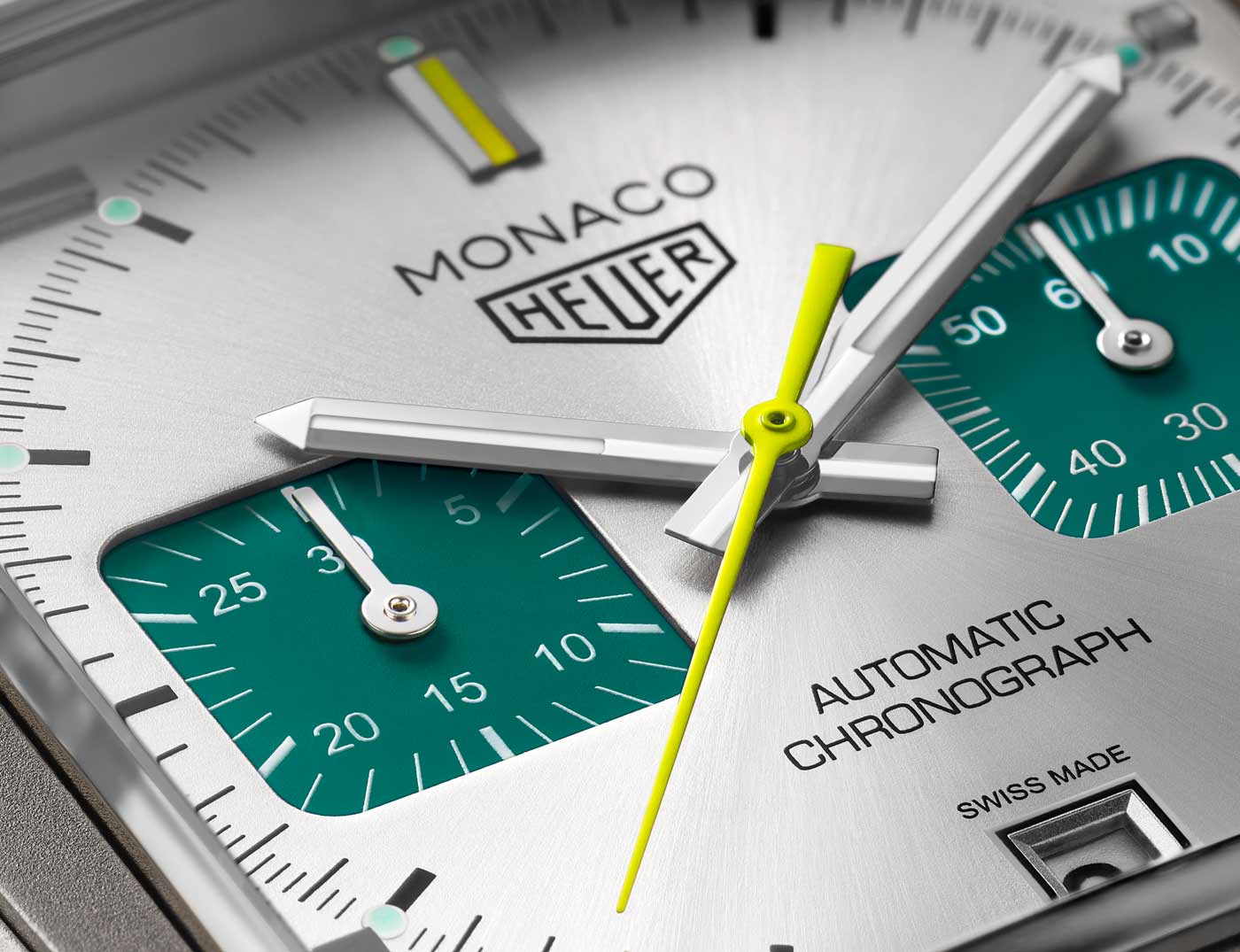 Every element of the TAG Heuer Monaco Chronograph Racing Green is inspired by vintage British racing cars and their BRG livery with yellow and white touches. The brushed silver dial is a direct reference to the engine-turned dashboards in sports cars from the 1920’s and ’30’s. Treated with a sunray finish, the dial is adorned with eight silvered hour markers as well as 12 Super-LumiNova coated dot markers. A baton marker at 12 o’clock features a vibrant yellow stripe, a connection to the chronograph’s yellow central hand and the touches of yellow on the vintage British race cars. The two green subdials are a callback to traditional racing green. TAG continues the vintage theme with the historic Heuer logo at 12 o’clock and the crown at 9 o’clock, as it was on the original 1969 Monaco. Limited to 1,000 pieces.