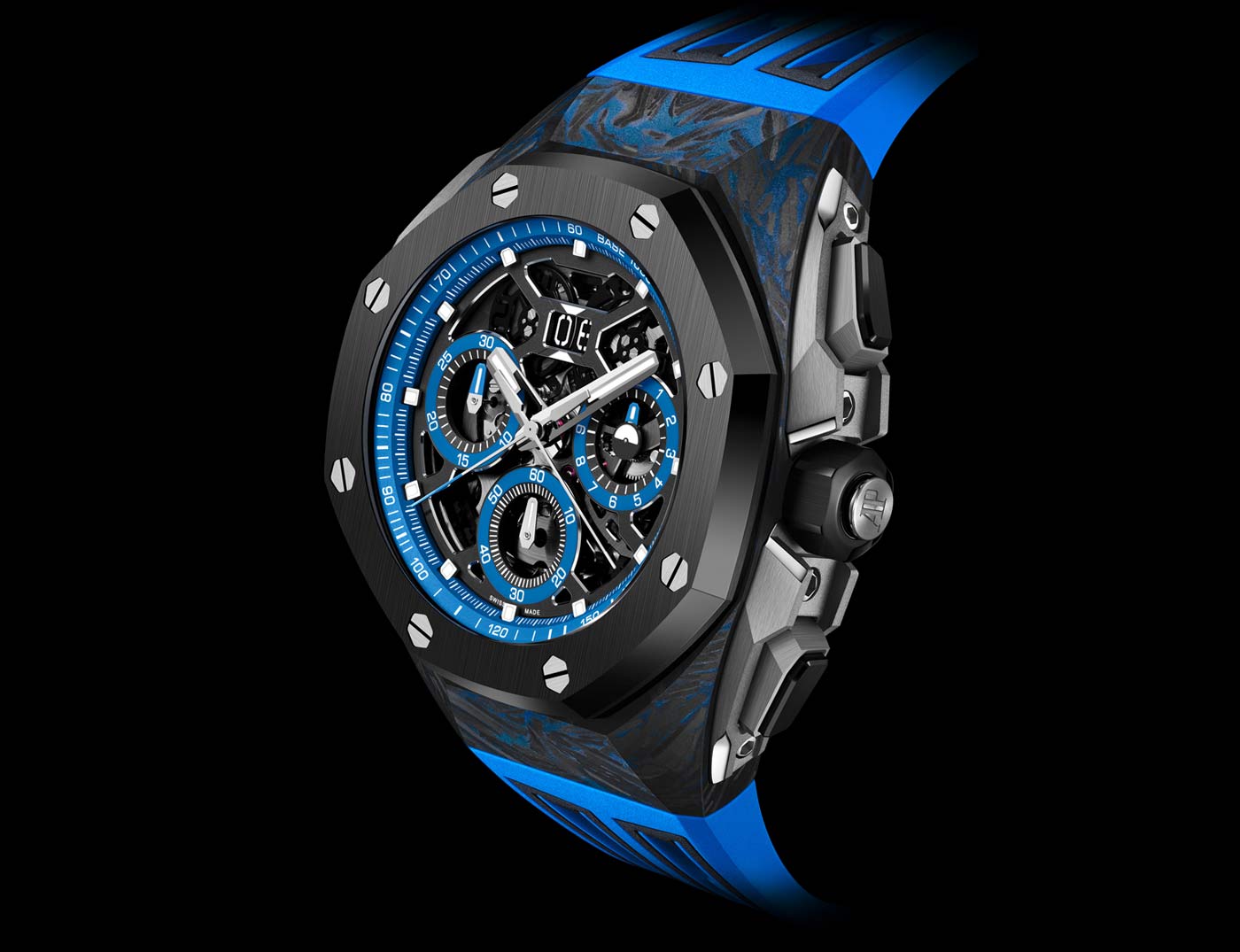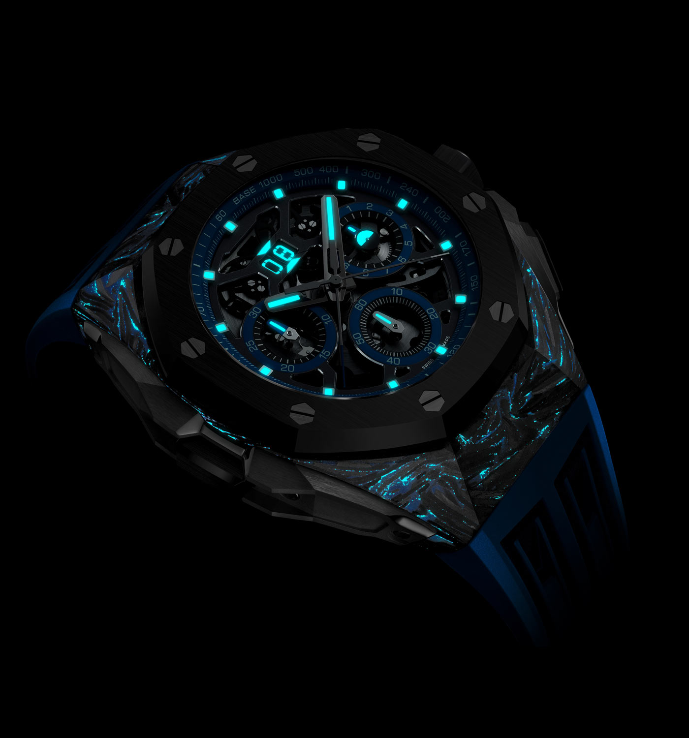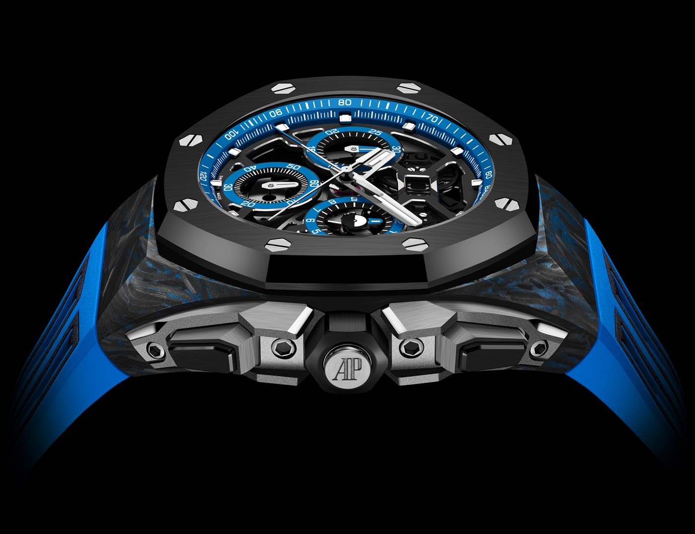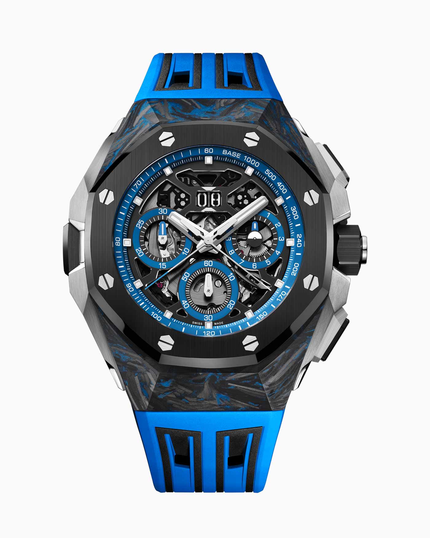 Crafted from color forged carbon, the Royal Oak Concept Split-Seconds Chronograph GMT Large Date model combines lightness with resistance to shocks, heat and humidity.