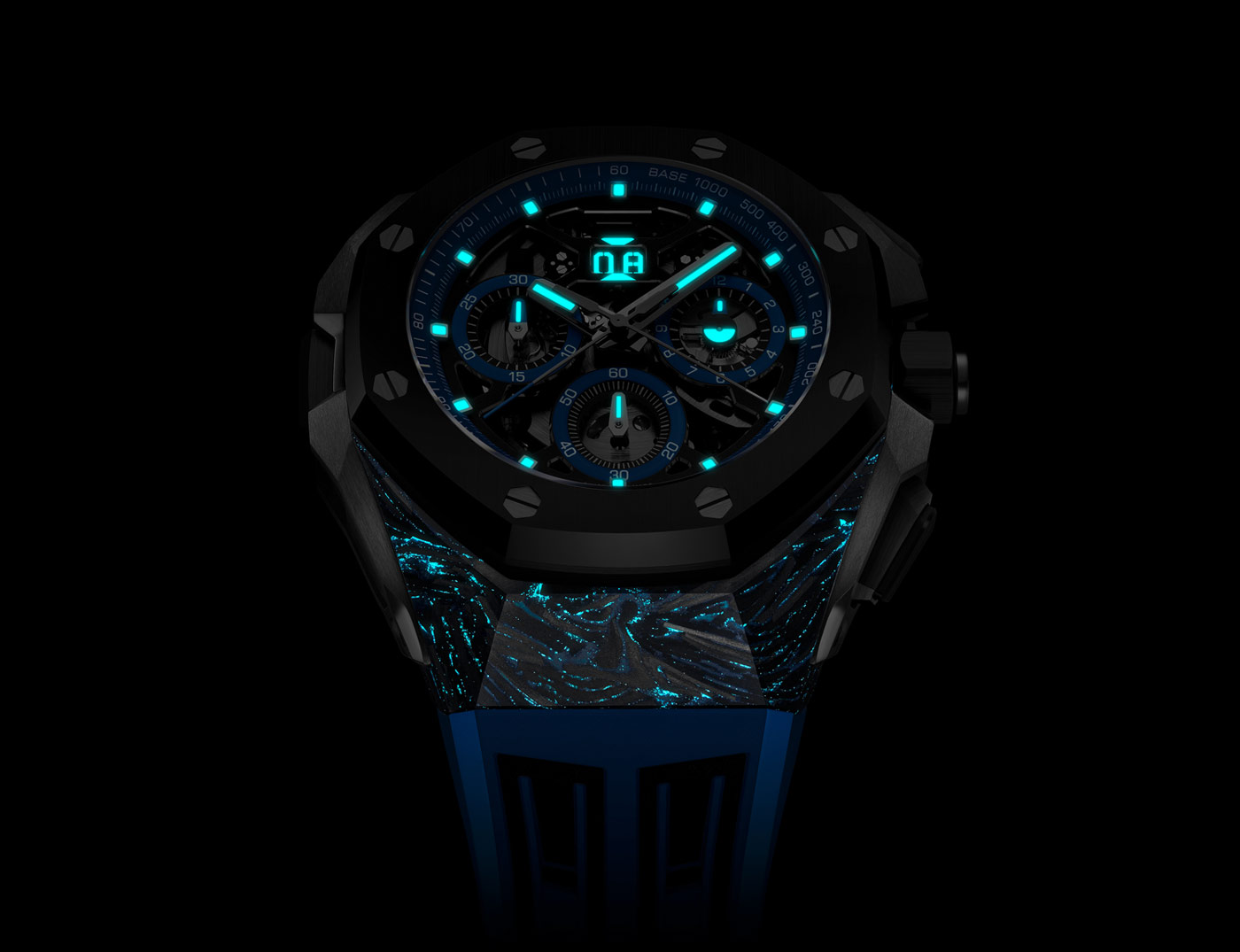 The ultra-light 43-mm case of this Royal Oak Concept features blue luminescent pigments, complemented by a black ceramic crown, bezel, pushers and caseback. The case and crown are slightly curved to follow the natural shape of the wrist. Echoing the glow-in-the-dark blue fibers of the case, the black openwork dial is enhanced by electric blue accents alongside black counters, lume filled white gold hour-markers and hands with luminescent coatings. It’s powered by AP’s self-winding Calibre 4407, a movement that combines flyback chronograph, split-seconds chronograph, large date and 24h GMT functions.