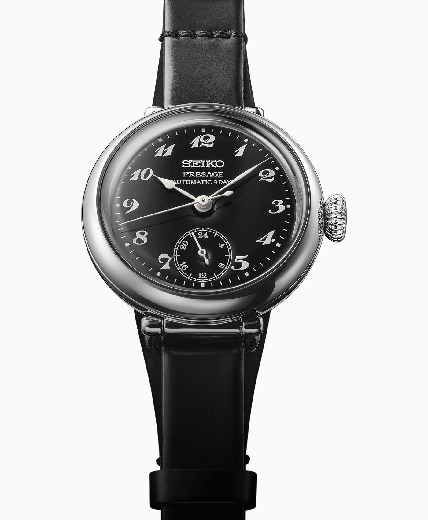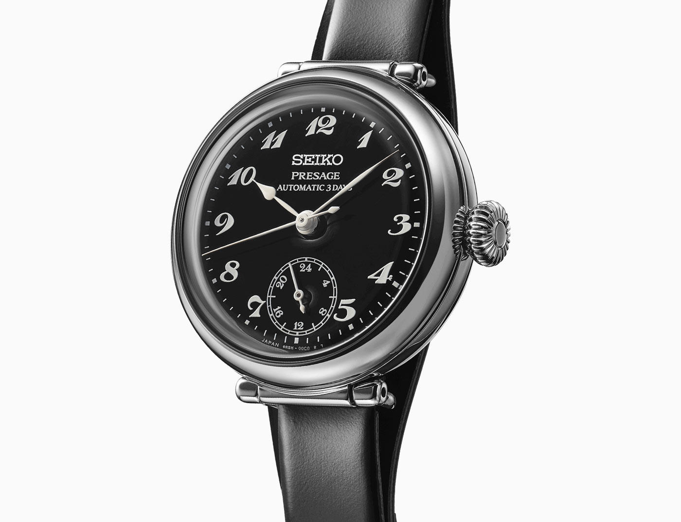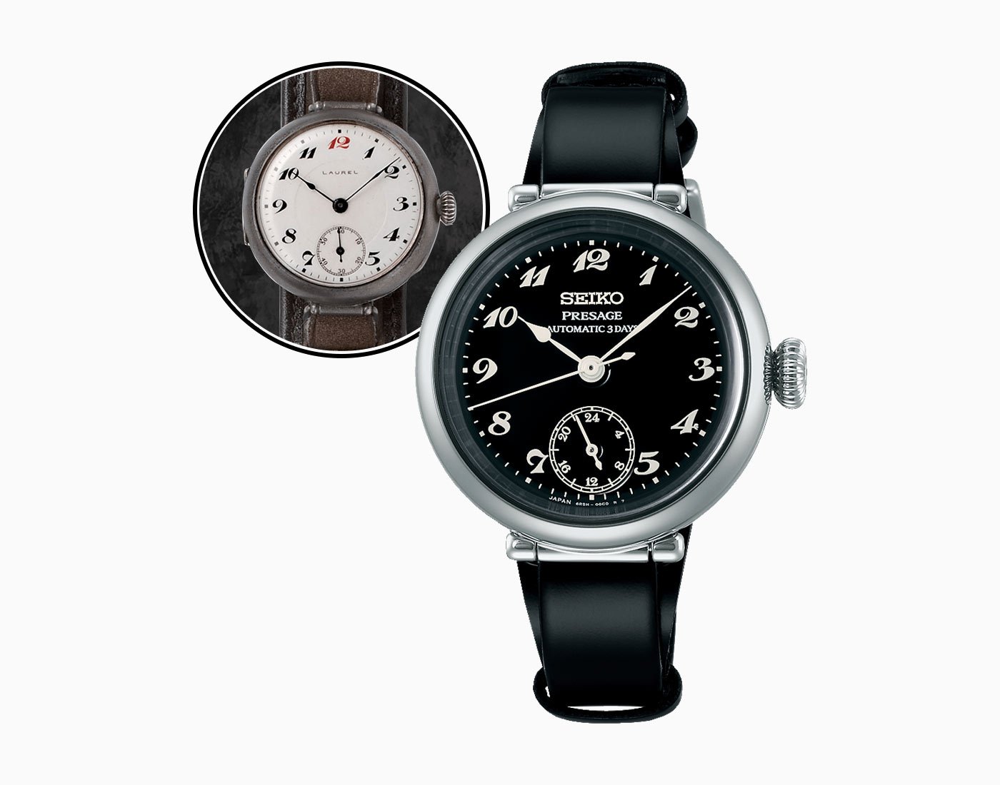 Taking cues from Seiko’s 1913 Laurel, the first wristwatch produced in Japan, the Porter Classic Collaboration Limited Edition features the same delicately shaped hands, set on a black enamel dial. The dial’s Arabic numerals are printed in white using the original font, and the 24-hour sub-dial at six o’clock occupies the same dial position as the seconds hand on the original Laurel. The circular 35-mm steel case mimics the proportions of traditional pocket watches, while the movable rounded lugs resemble pocket watch bows.