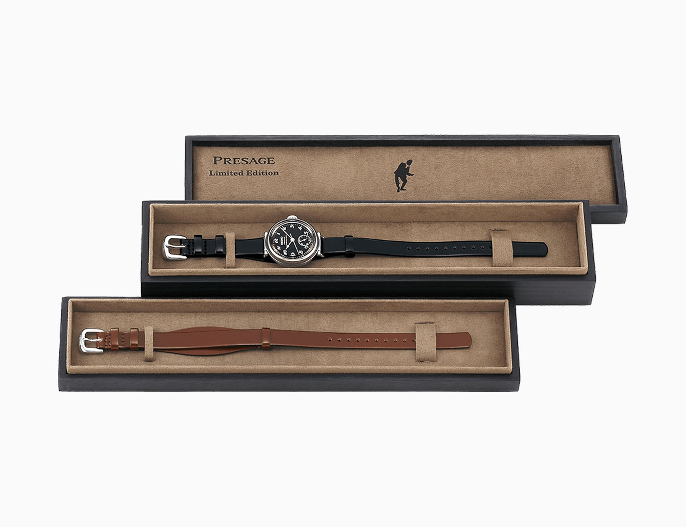 Presented in a jūbako-style box, the watch is fitted to a pull-through black cordovan leather strap developed especially for this collaboration. The tiered box can hold the watch and an addition brown leather strap. Both straps have more holes than is standard, allowing for a wider range of adjustments. Limited to 500 pieces.