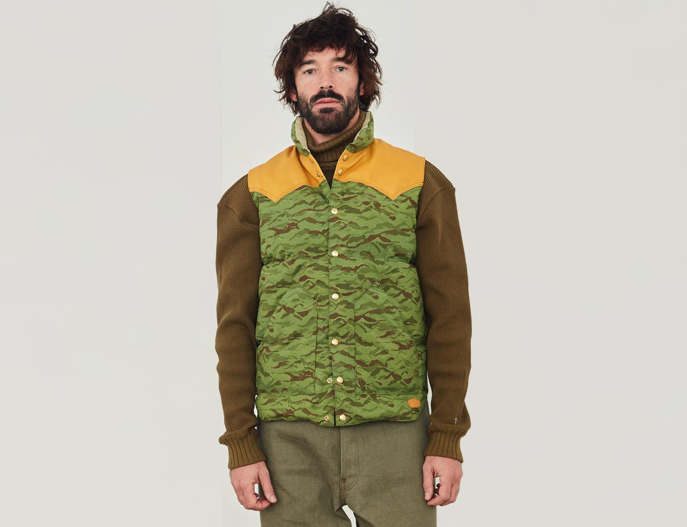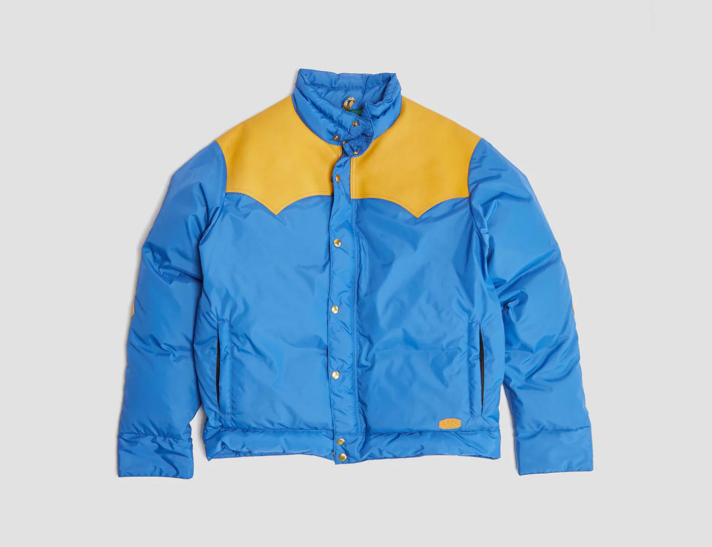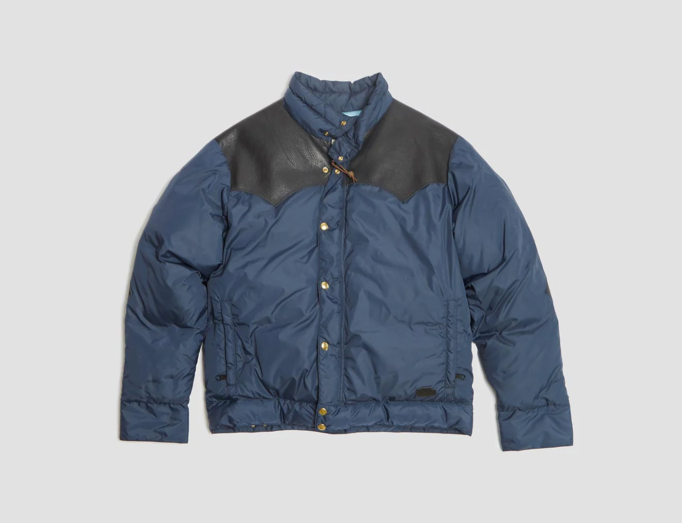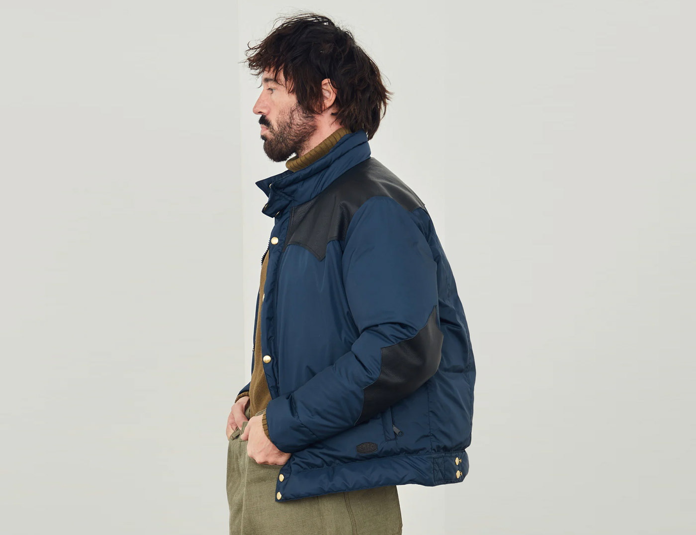 For inspiration Cabourn studied his personal collection of over 4,000 vintage garments, along with Teramoto’s archive of original Rocky Mountain Featherbed pieces from the 1960s and 1970s. The resulting capsule was designed in England, made in Japan, and infused with the spirit of the American West. All the outerwear pieces, variations of the Mountain Parka, Short Shell puffer and Down Vest, feature Rocky Mountain Featherbed’s signature single-piece cow leather yoke dyed with chrome and tannin. The chrome improves the durability of the leather, while the tannin helps to maintain the trims natural texture.