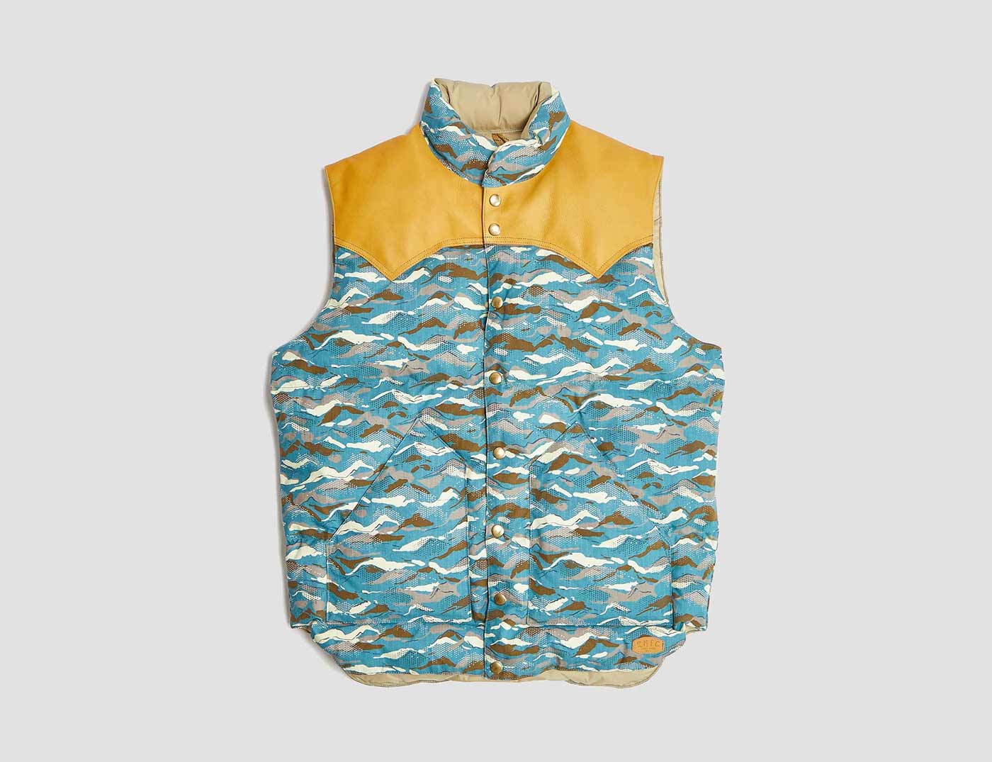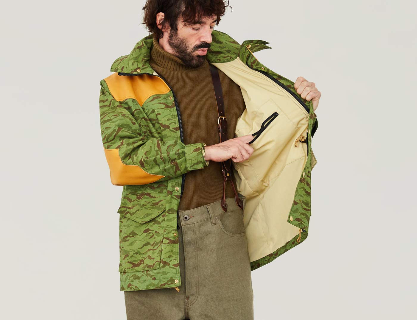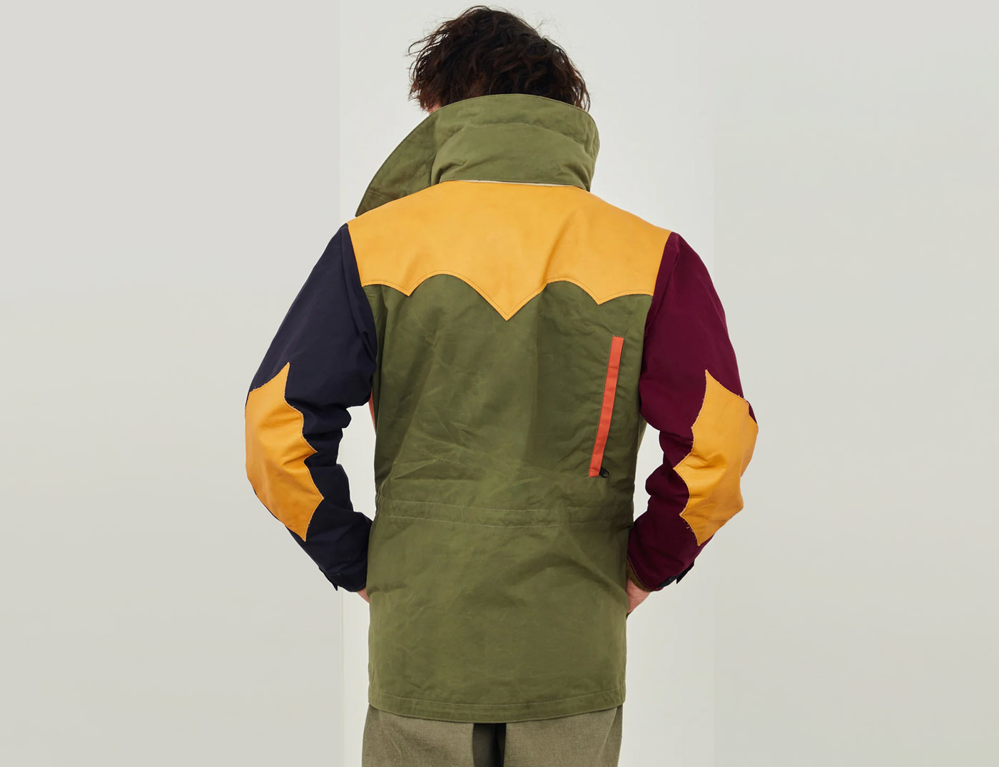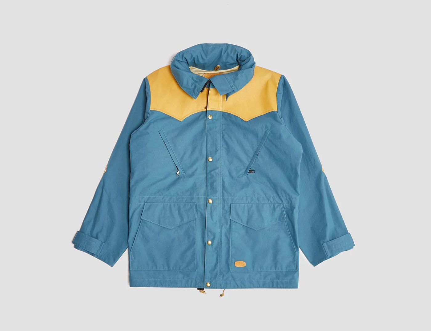 For inspiration Cabourn studied his personal collection of over 4,000 vintage garments, along with Teramoto’s archive of original Rocky Mountain Featherbed pieces from the 1960s and 1970s. The resulting capsule was designed in England, made in Japan, and infused with the spirit of the American West. All the outerwear pieces, variations of the Mountain Parka, Short Shell puffer and Down Vest, feature Rocky Mountain Featherbed’s signature single-piece cow leather yoke dyed with chrome and tannin. The chrome improves the durability of the leather, while the tannin helps to maintain the trims natural texture.