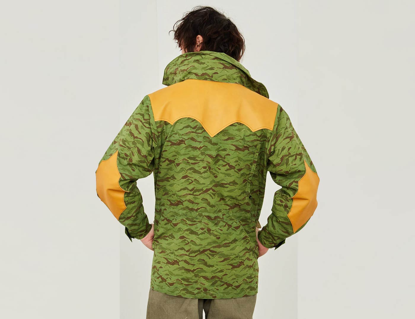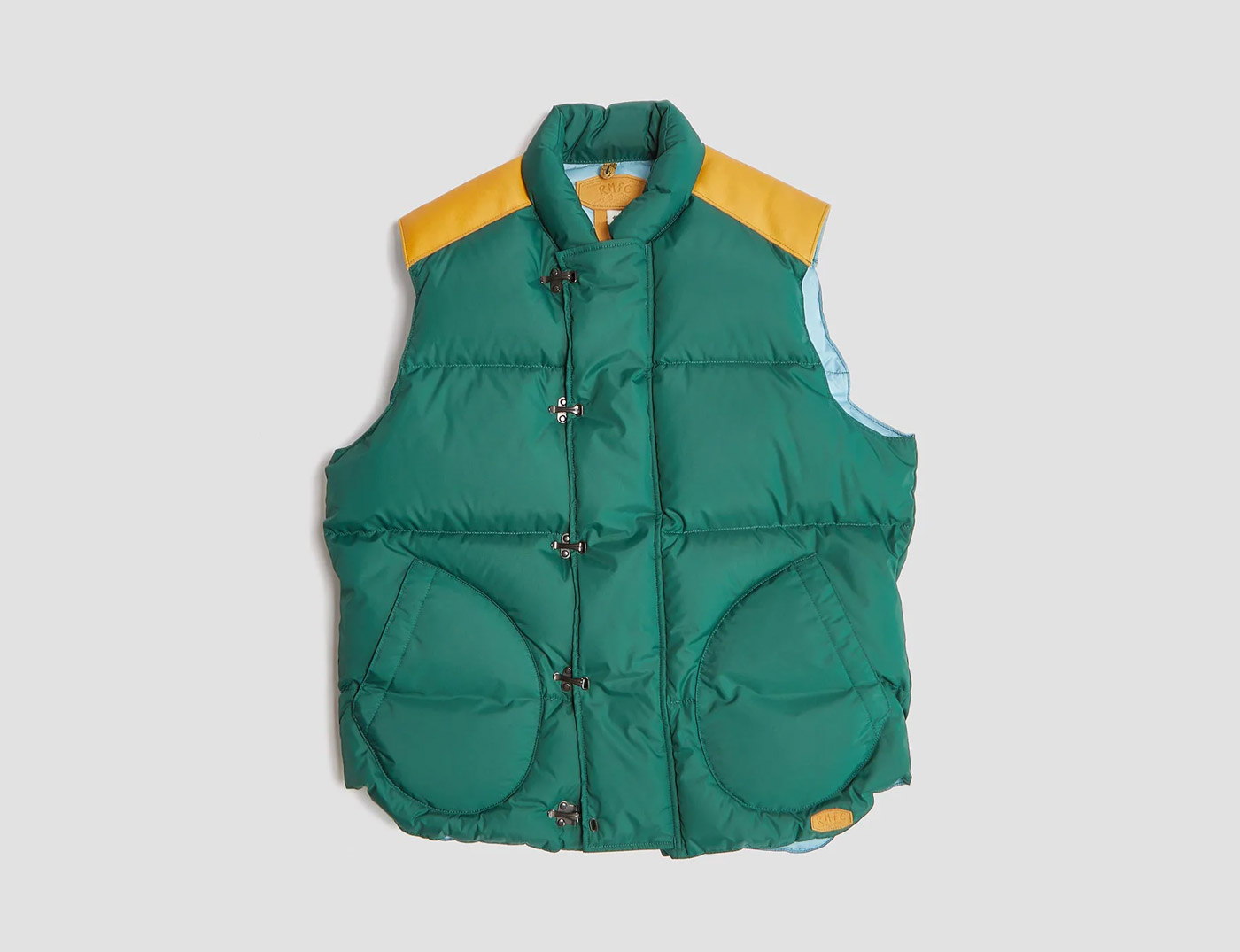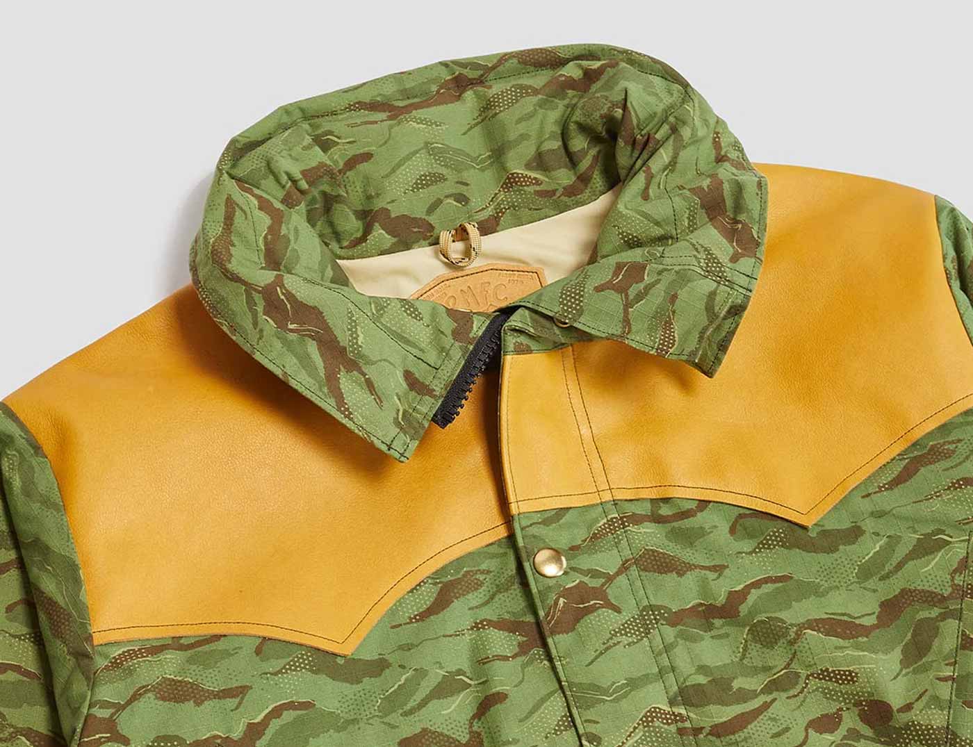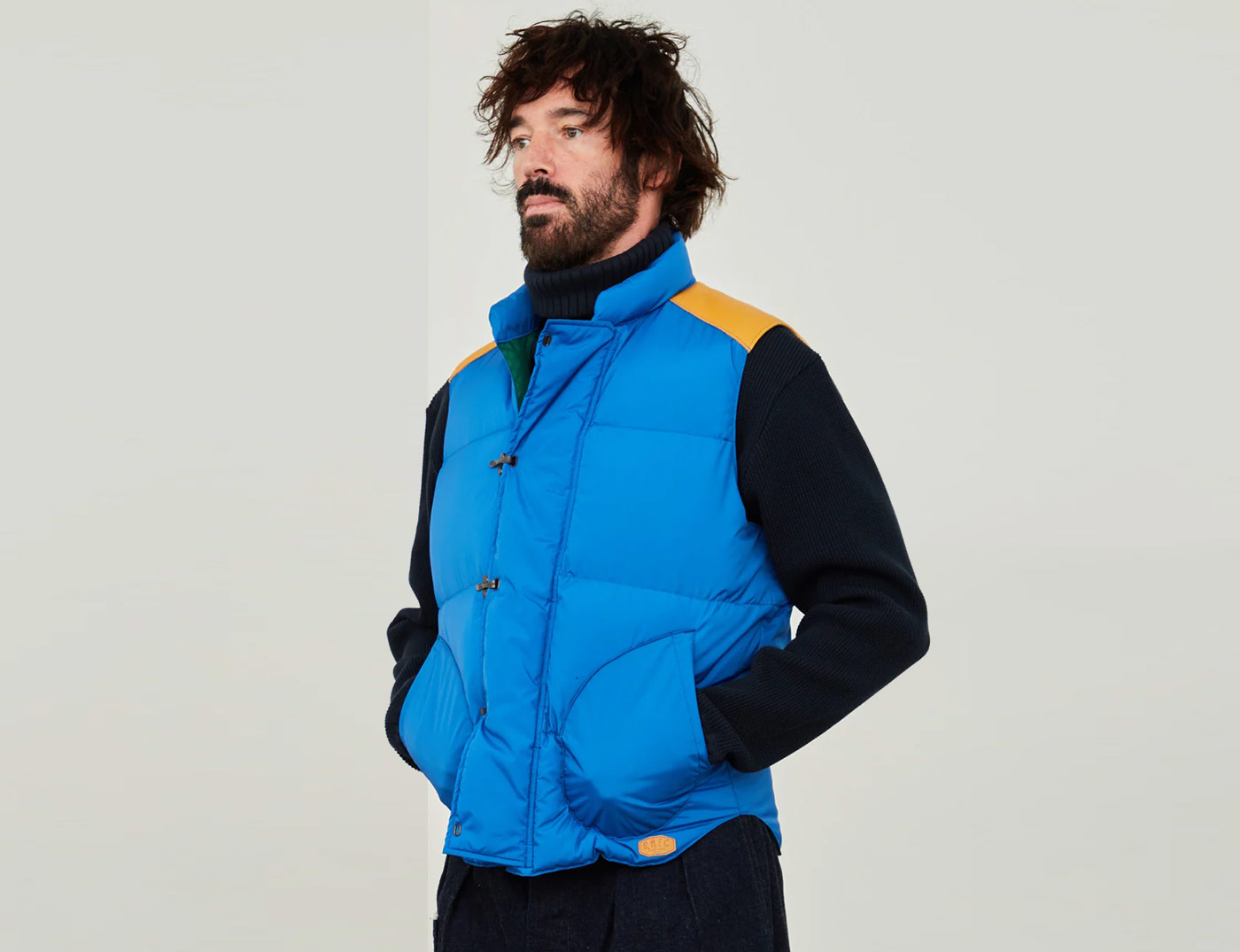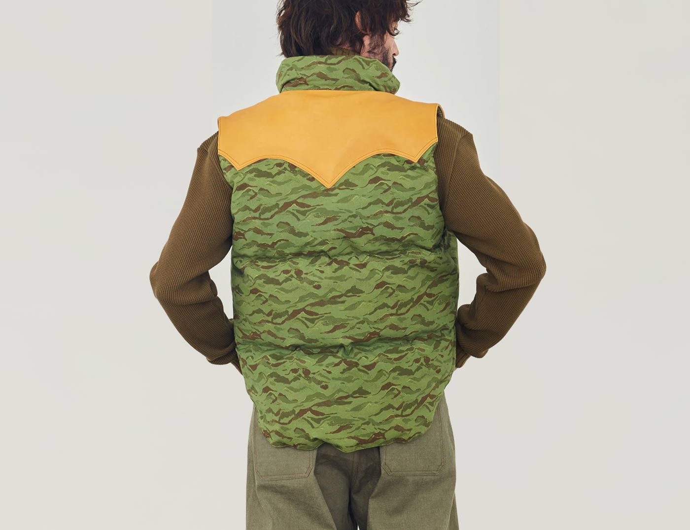 For inspiration Cabourn studied his personal collection of over 4,000 vintage garments, along with Teramoto’s archive of original Rocky Mountain Featherbed pieces from the 1960s and 1970s. The resulting capsule was designed in England, made in Japan, and infused with the spirit of the American West. All the outerwear pieces, variations of the Mountain Parka, Short Shell puffer and Down Vest, feature Rocky Mountain Featherbed’s signature single-piece cow leather yoke dyed with chrome and tannin. The chrome improves the durability of the leather, while the tannin helps to maintain the trims natural texture.