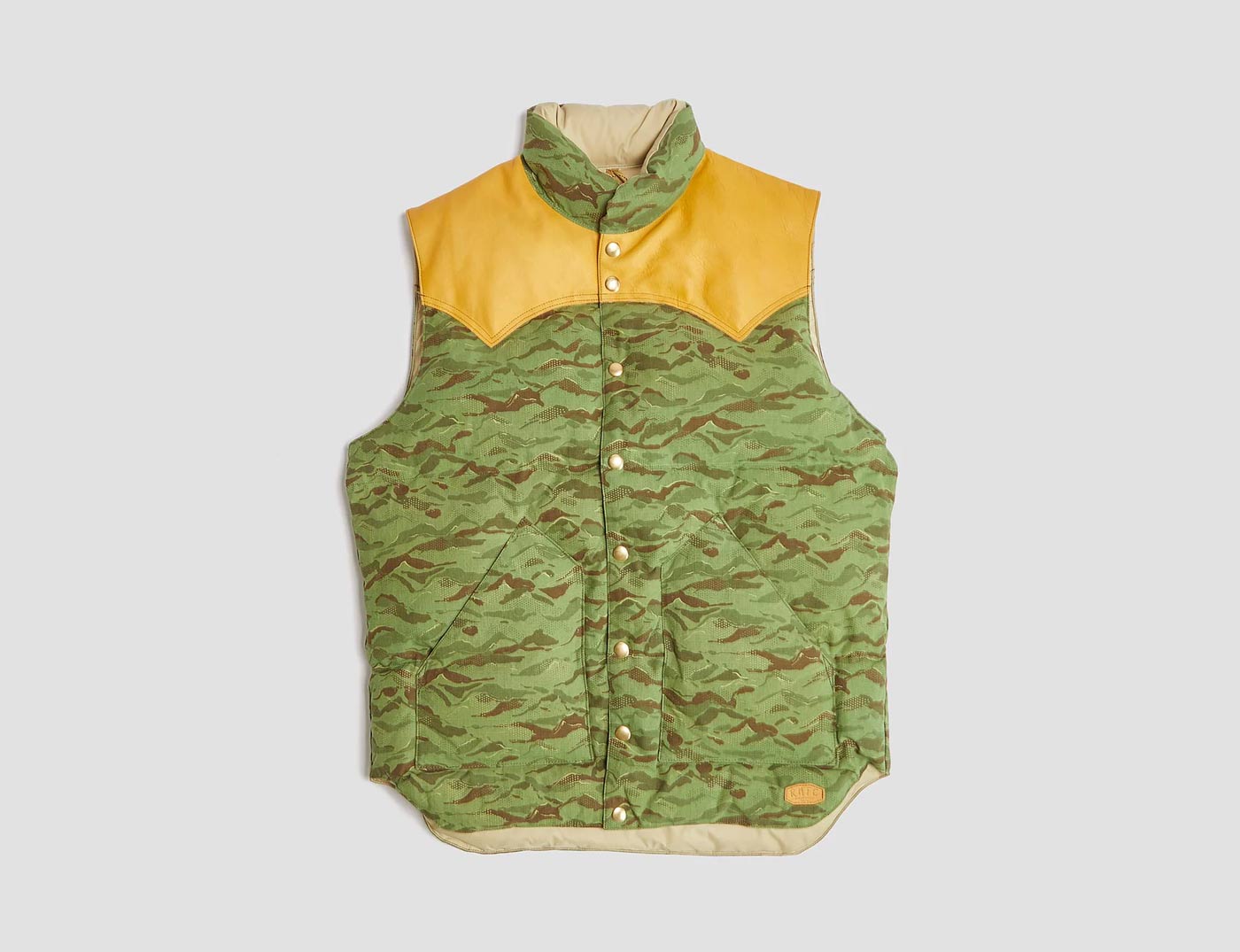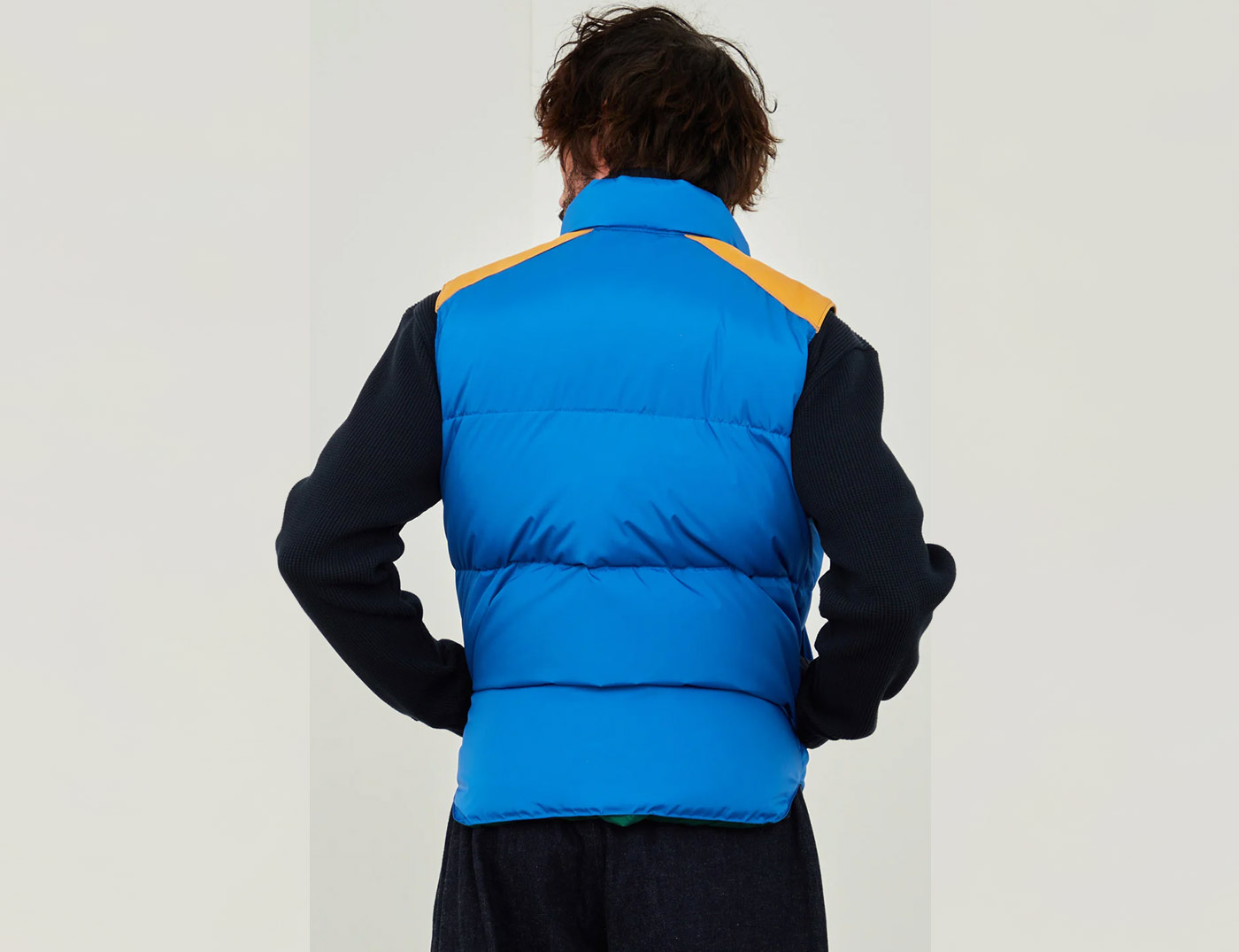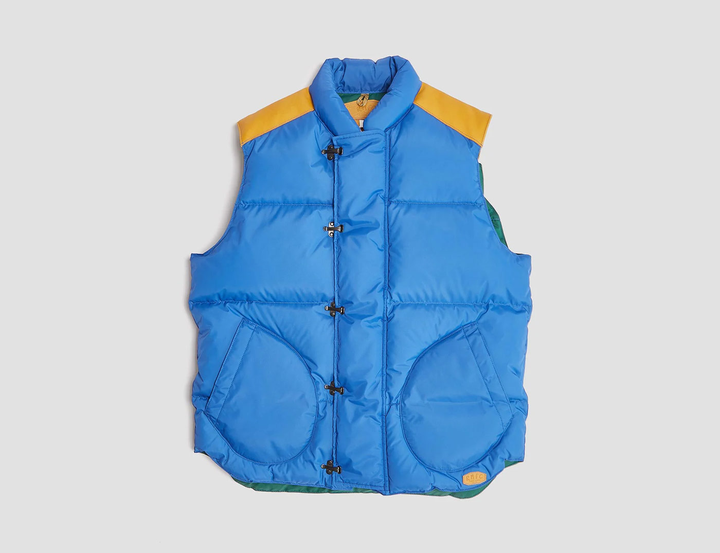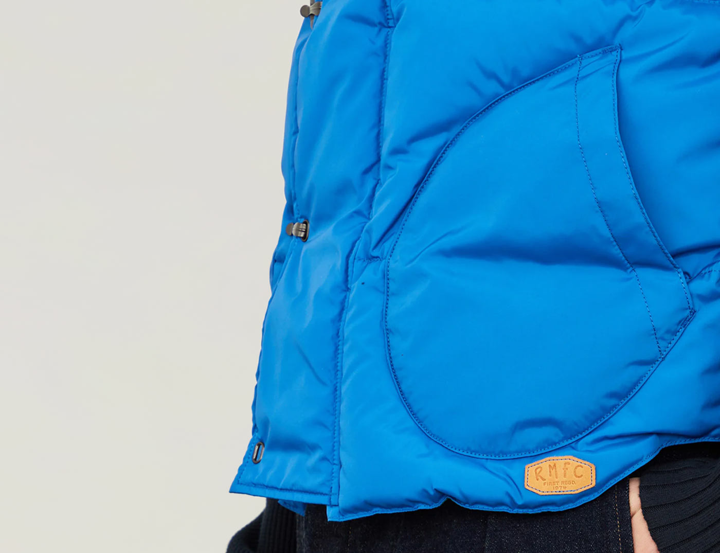 For inspiration Cabourn studied his personal collection of over 4,000 vintage garments, along with Teramoto’s archive of original Rocky Mountain Featherbed pieces from the 1960s and 1970s. The resulting capsule was designed in England, made in Japan, and infused with the spirit of the American West. All the outerwear pieces, variations of the Mountain Parka, Short Shell puffer and Down Vest, feature Rocky Mountain Featherbed’s signature single-piece cow leather yoke dyed with chrome and tannin. The chrome improves the durability of the leather, while the tannin helps to maintain the trims natural texture.