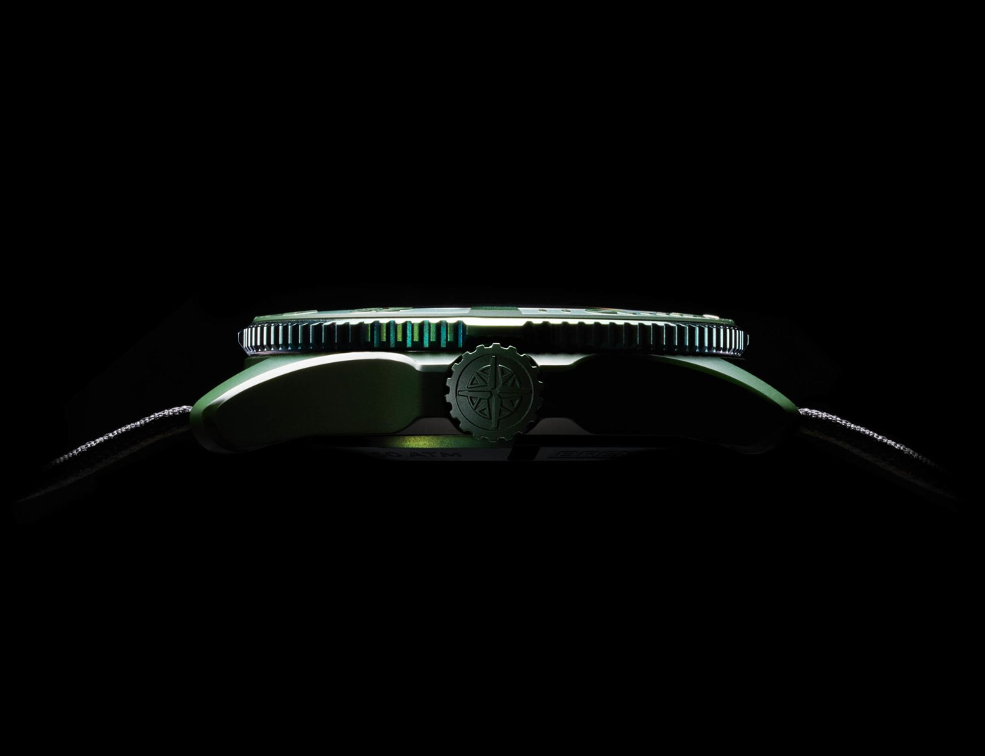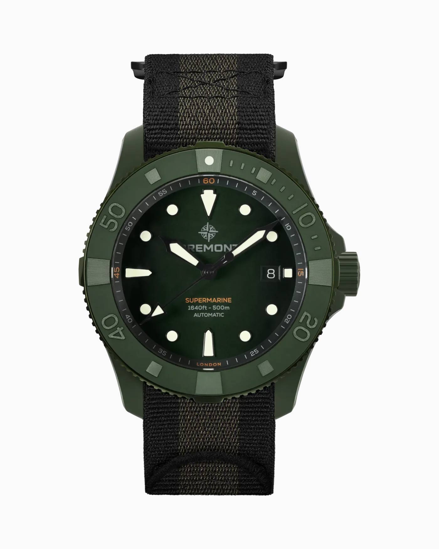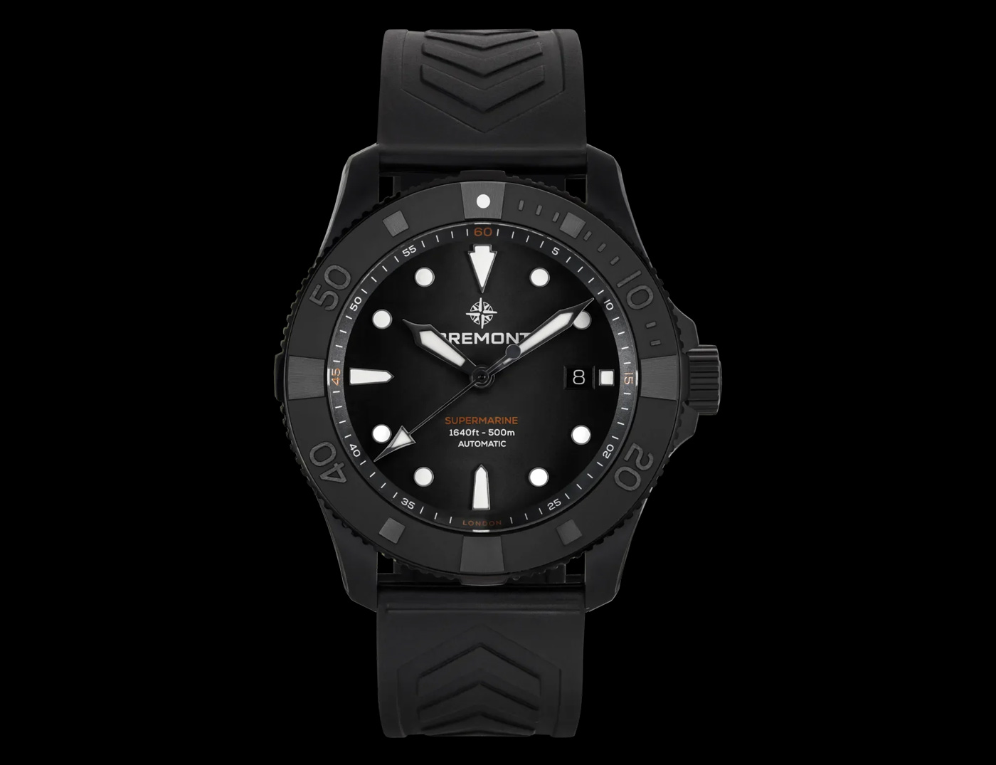 Bremont’s new Supermarine Full Ceramic features the watchmakers first-ever full ceramic case. An evolution of the Supermarine 500M, the case has been redesigned in mono-block ceramic with a titanium container and a new knurled uni-directional bezel. It’s engineered for depth with an impressive 500 meter waster resistance and a helium escape valve. The dial sports hands and indexes filled with blue emission Super-LumiNova allowing for incredibly bright luminosity in the most challenging conditions. The 43-mm ceramic case is twice as light as its steel equivalent.