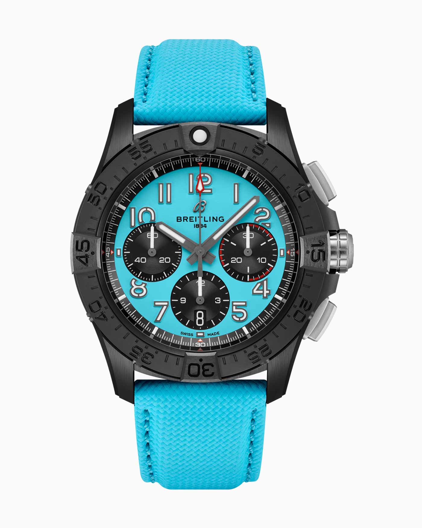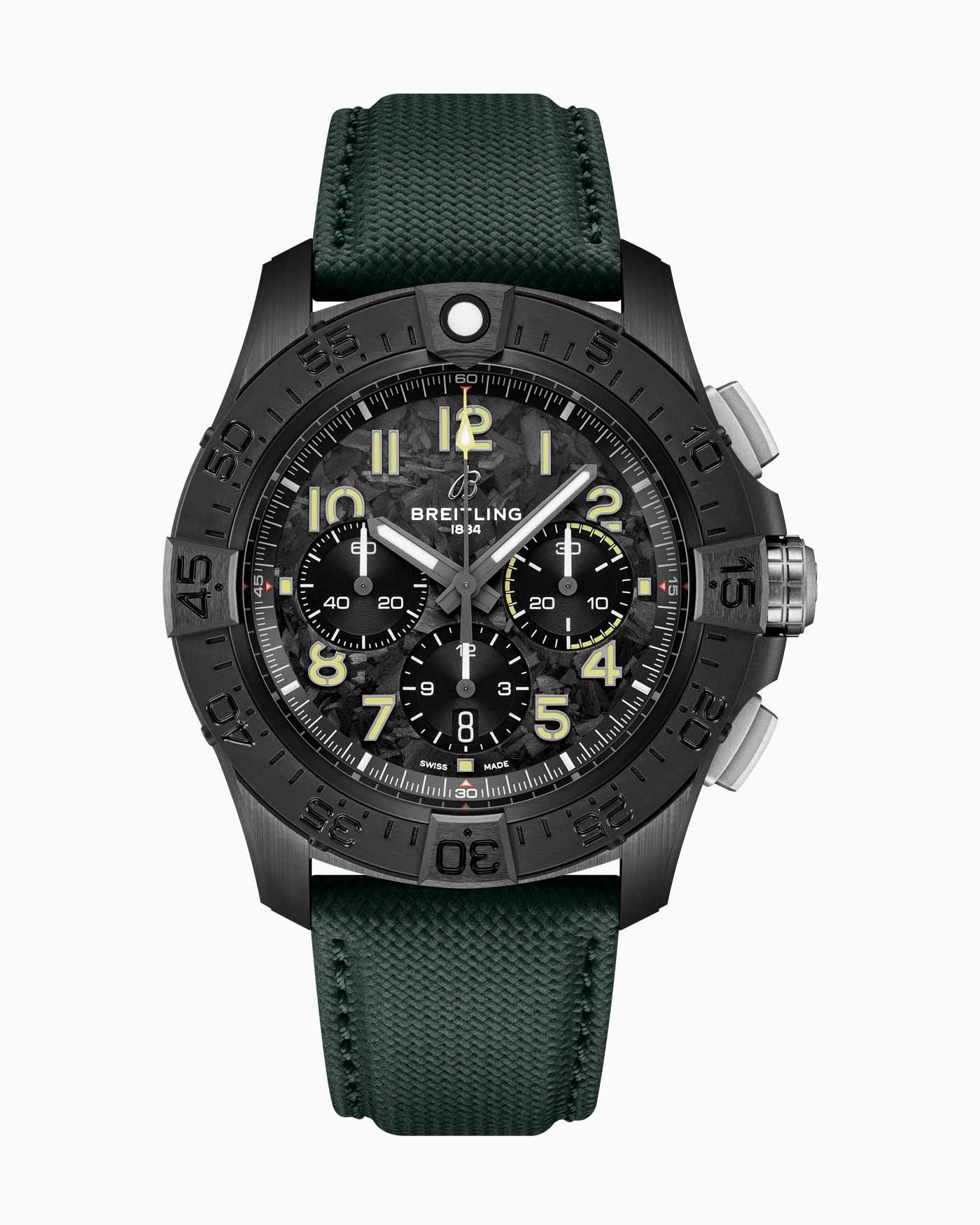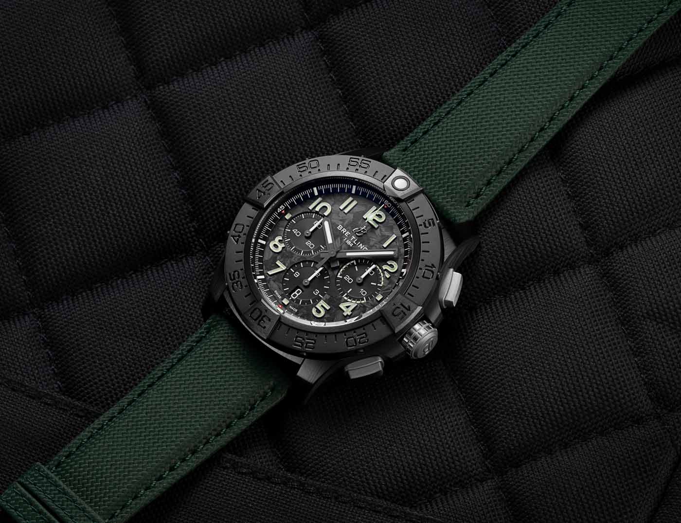 Breitling’s Avenger Night Mission draws on nearly a century of brand history, dating back to the 1930s when third-generation founder Willy Breitling crafted precision dashboard instruments and chronographs for military and civil-aviation pilots. Building on this history, the new Avenger Night Mission lineup includes standout black ceramic models with straps that draw from military and contemporary design colors, including green, turquoise, sand and black.