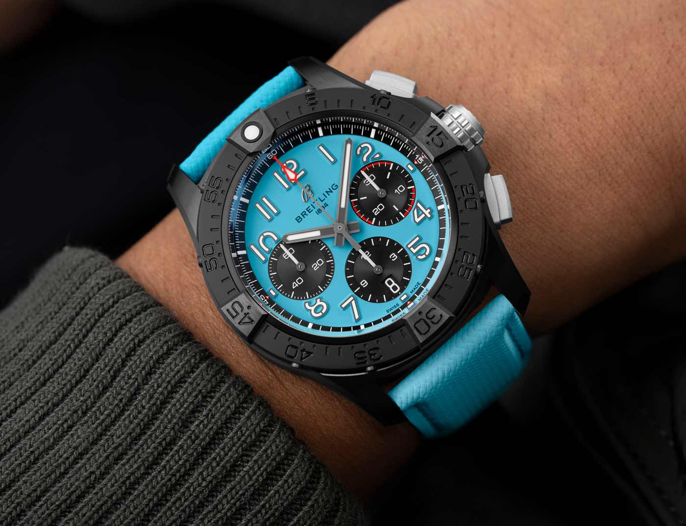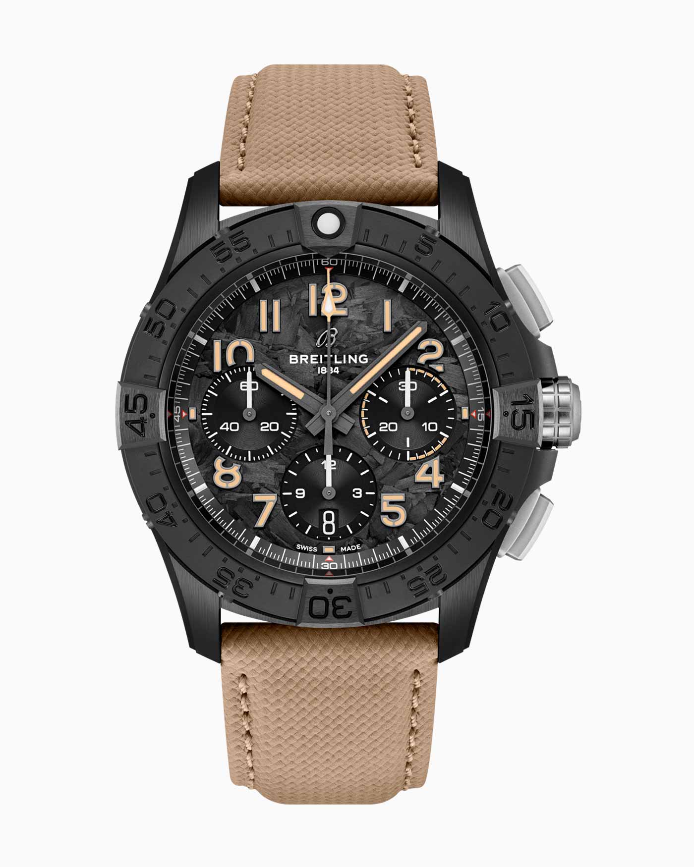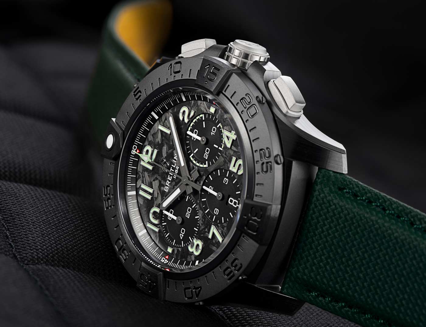 Breitling’s Avenger Night Mission draws on nearly a century of brand history, dating back to the 1930s when third-generation founder Willy Breitling crafted precision dashboard instruments and chronographs for military and civil-aviation pilots. Building on this history, the new Avenger Night Mission lineup includes standout black ceramic models with straps that draw from military and contemporary design colors, including green, turquoise, sand and black.
