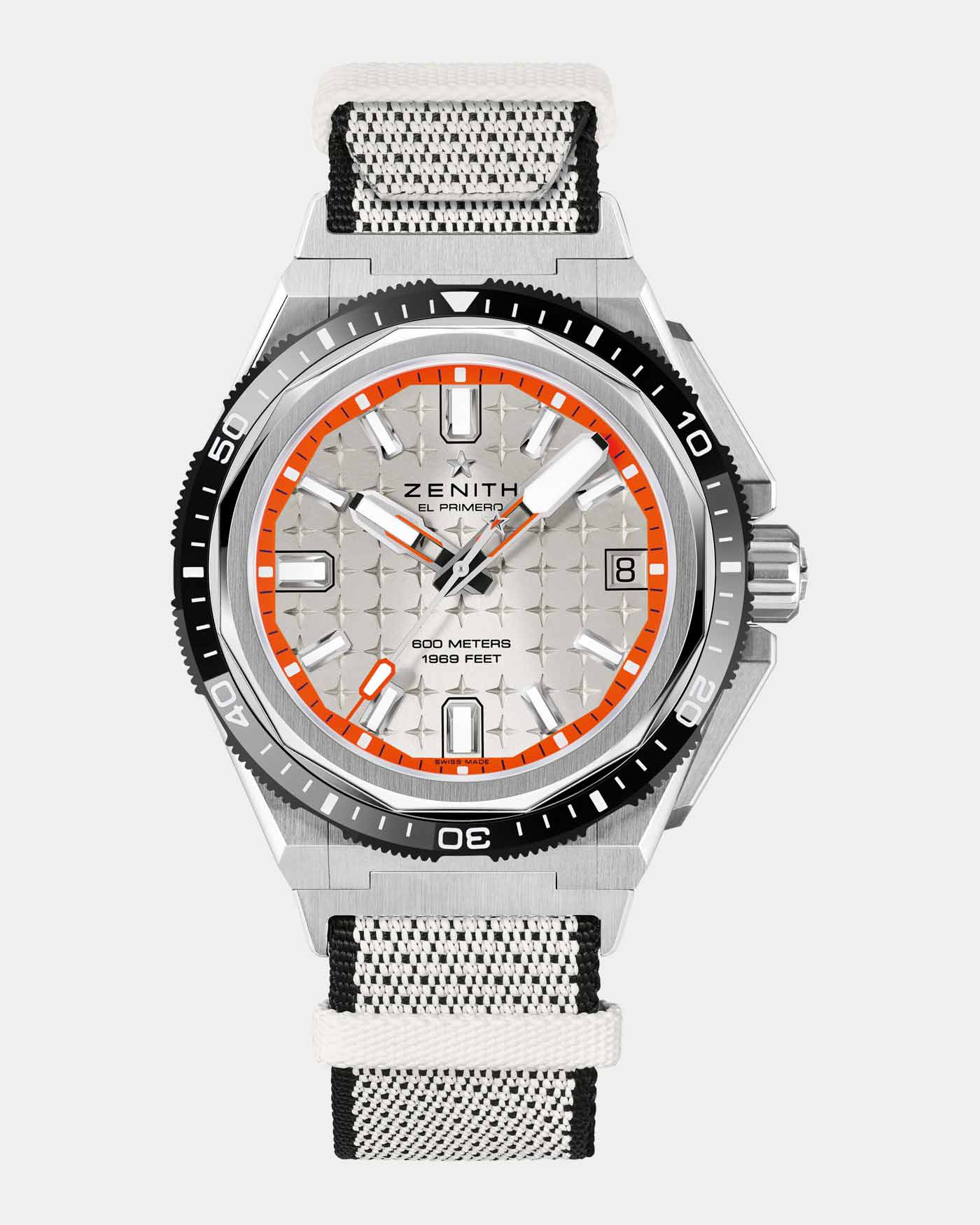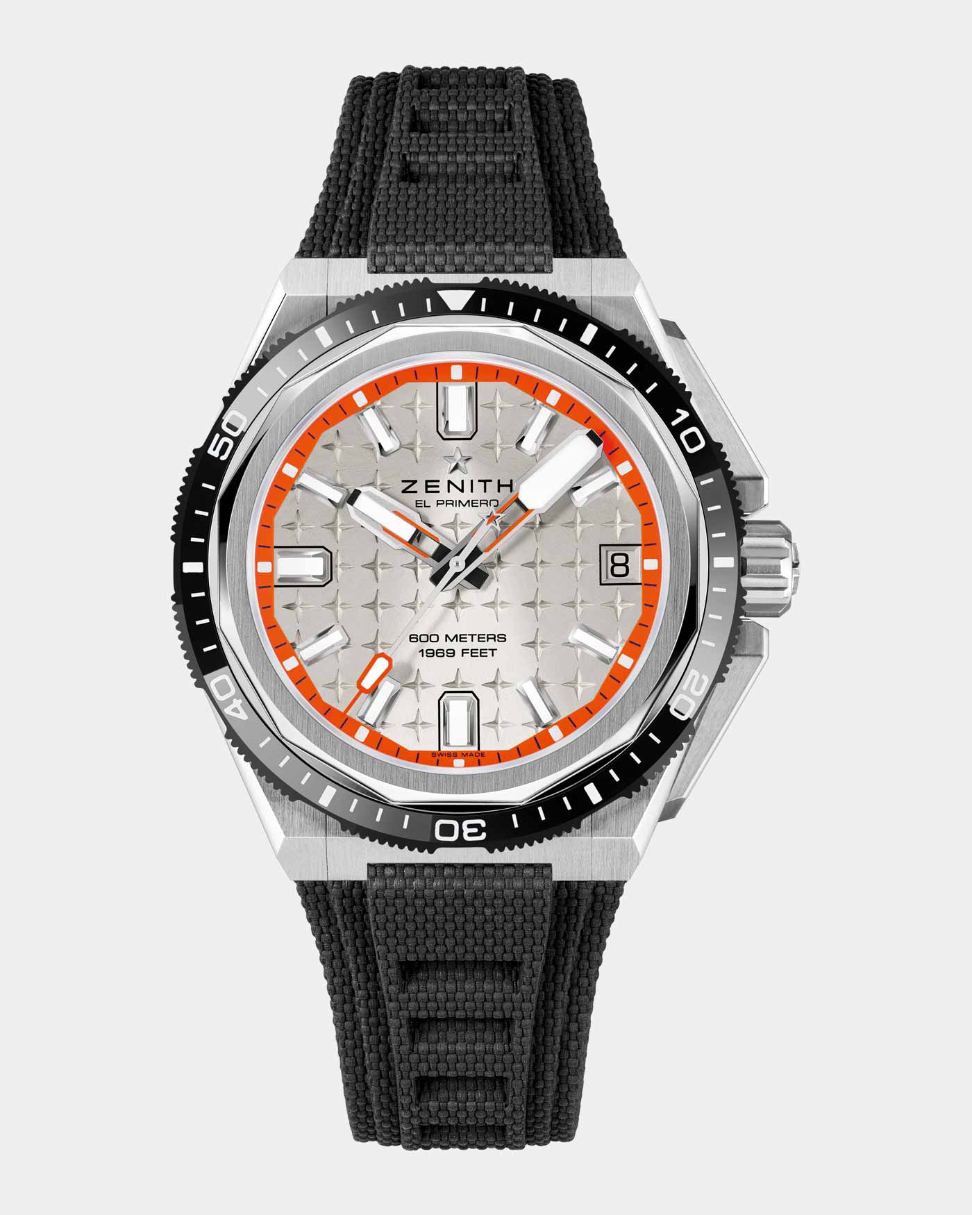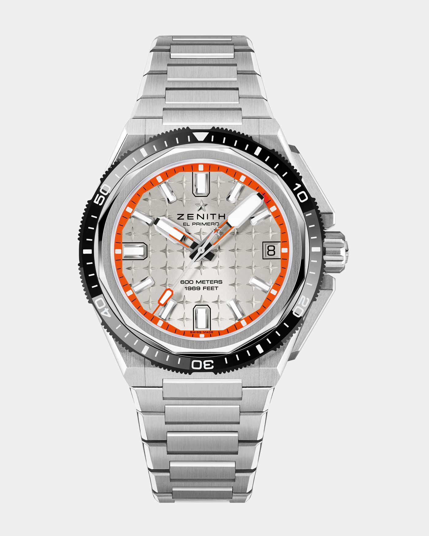 Stamped with a star pattern, the silver dial is set with oversize hands and markers that feature three different lume pigments with emissions in blue, green and yellow. This light display helps to distinguish between the hours, minutes, and seconds. The bright orange accents are a nod to vintage Defy models, from a time when orange was believed to be the most legible color underwater. The El Primero 3620-SC automatic movement that powers the watch produces a 60 hour power reserve and is visible through a sapphire display back – an uncommon feature among diver’s watches.