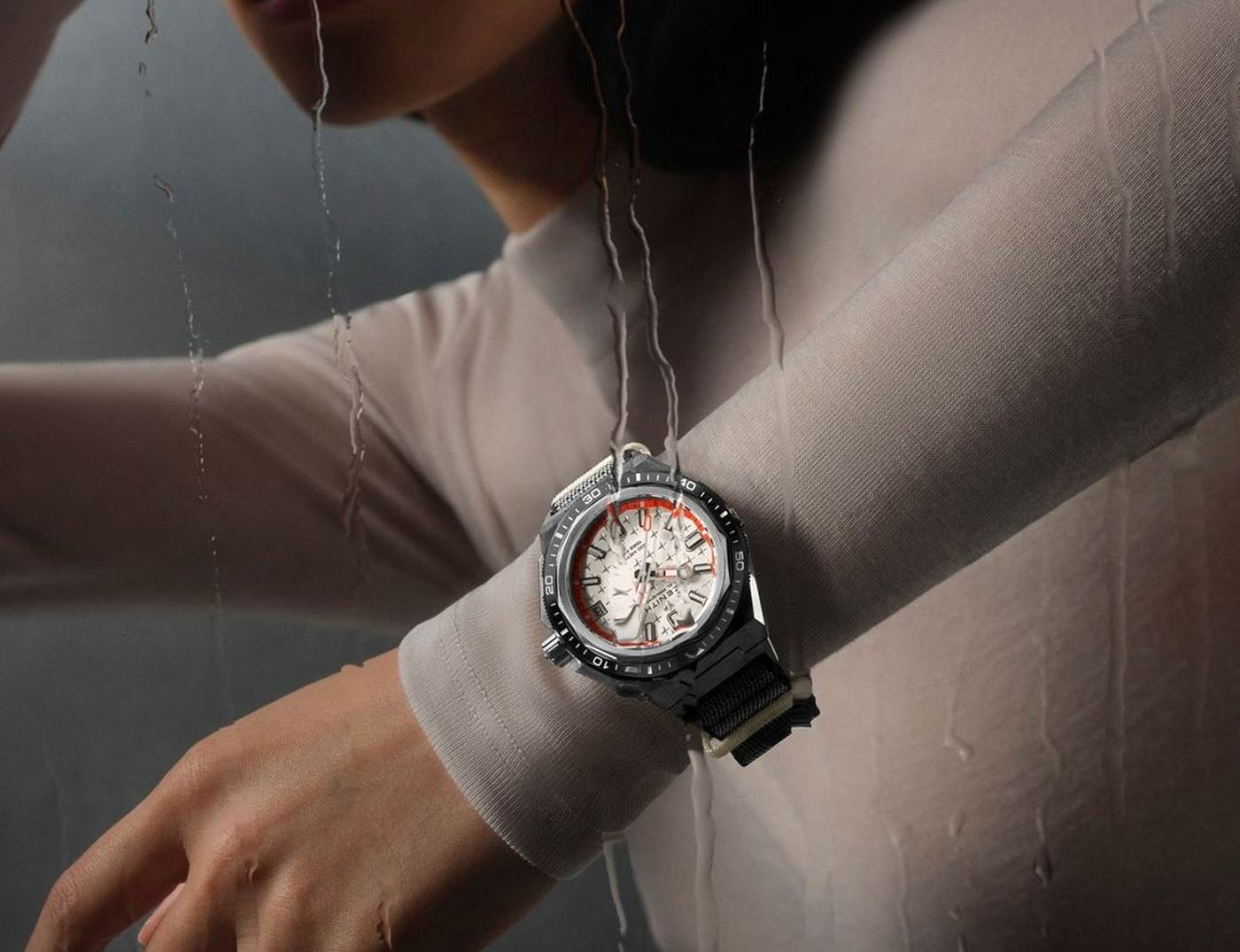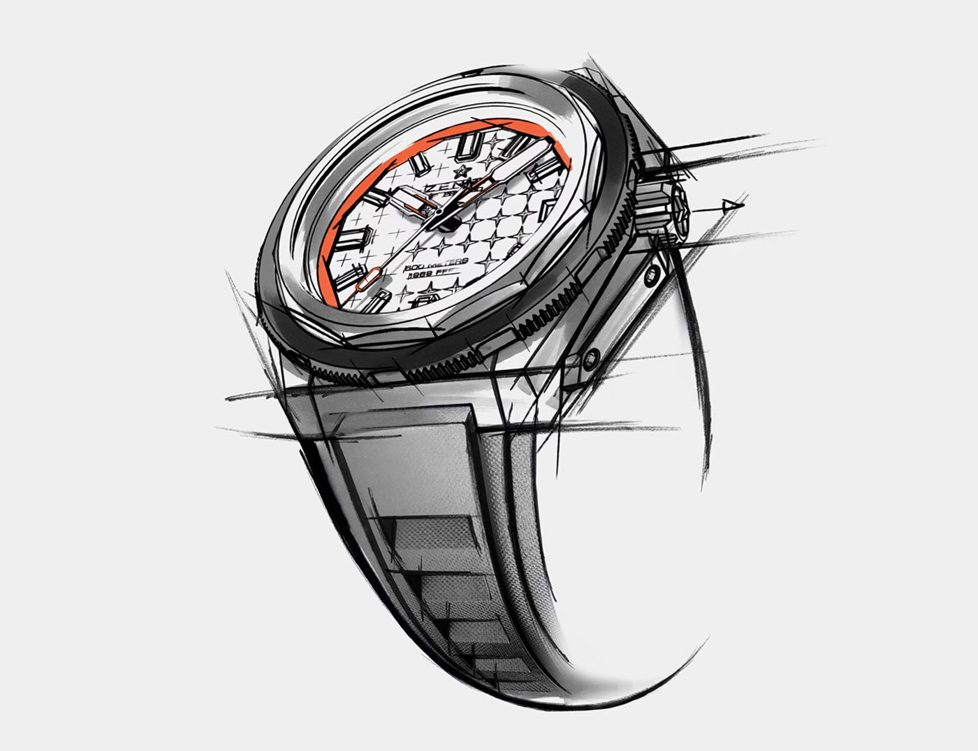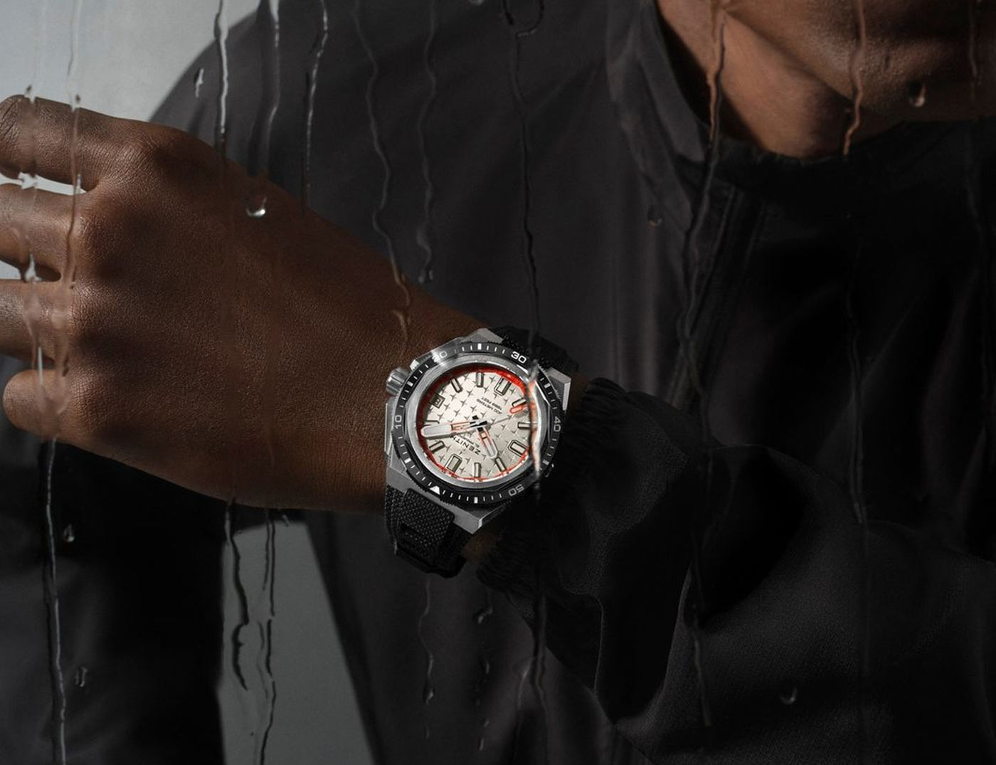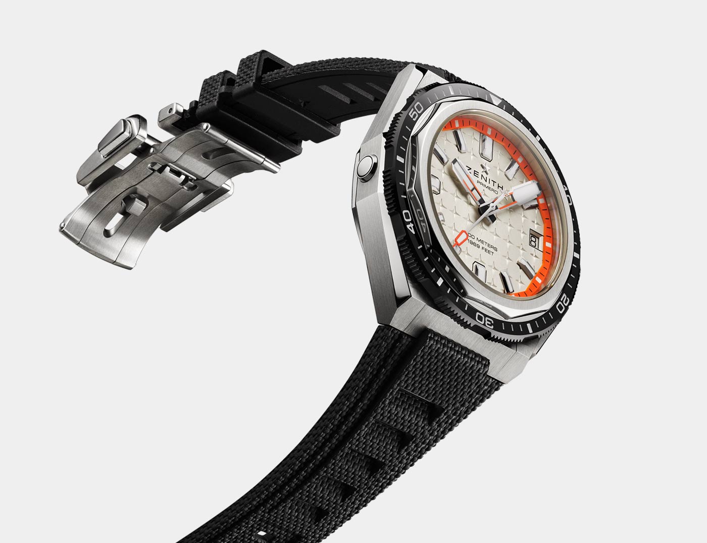 Stamped with a star pattern, the silver dial is set with oversize hands and markers that feature three different lume pigments with emissions in blue, green and yellow. This light display helps to distinguish between the hours, minutes, and seconds. The bright orange accents are a nod to vintage Defy models, from a time when orange was believed to be the most legible color underwater. The El Primero 3620-SC automatic movement that powers the watch produces a 60 hour power reserve and is visible through a sapphire display back – an uncommon feature among diver’s watches.