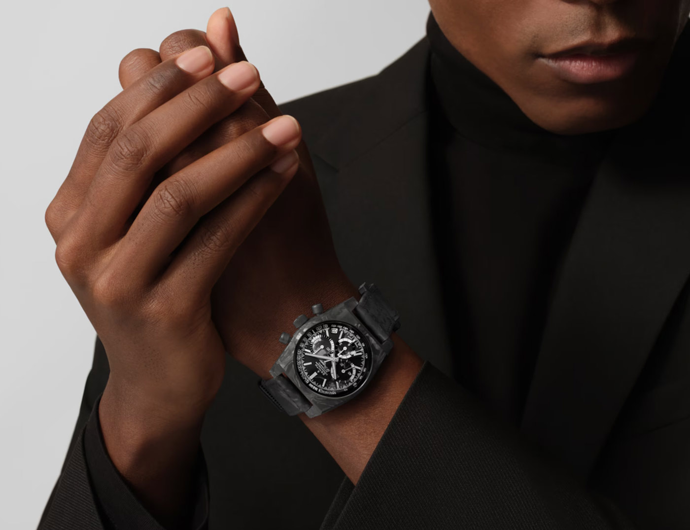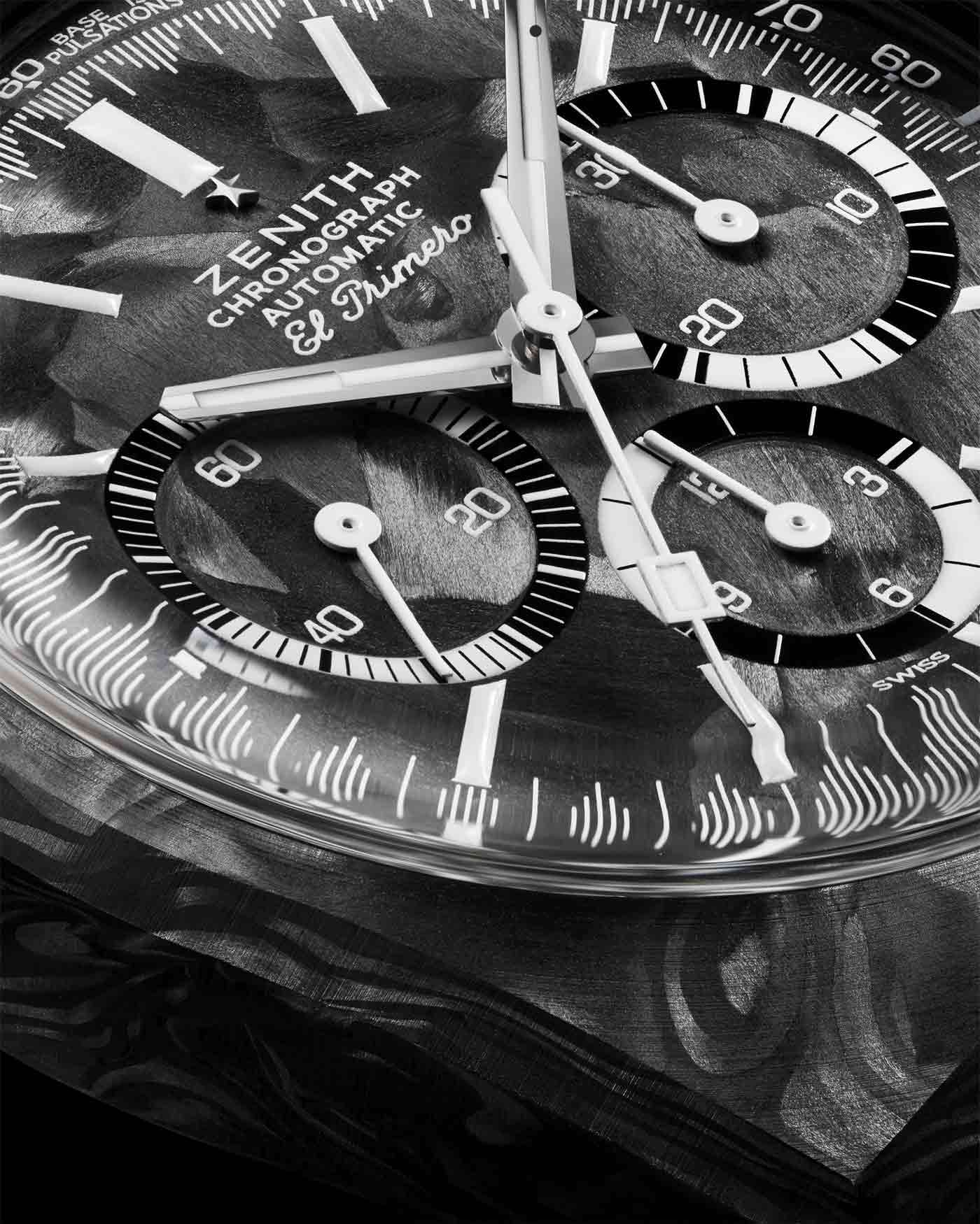 Inspired by this legacy, Zenith teamed up with Revolution Watch magazine to revive the A3818, starting with a steel model in 2020 and a titanium version in 2022. Today, in celebration of Revolution’s 20th anniversary, the Cover Girl is back lighter than ever. Crafted from carbon fiber, the 37-mm Zenith Chronomaster Revival A3818 Cover Girl Carbon weighs a mere 55 grams (case and bracelet). The dial, also crafted from carbon, features black-and-white subdials surrounded by the A3818’s distinctive ‘shark tooth’ second track, paired with both tachymeter and pulsometer scales. The pulsometer scale spans the first 15 seconds, while the tachymeter indications are read over the remaining 45 seconds. Zenith’s El Primero 400 calibre powers the watch and is visible through the exhibition caseback.