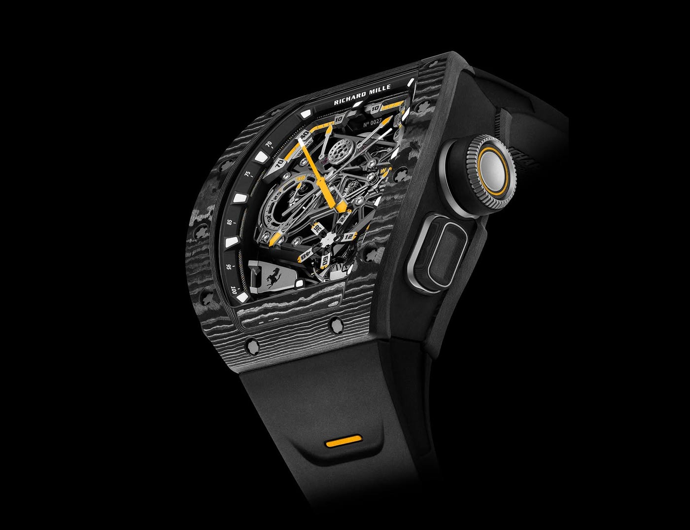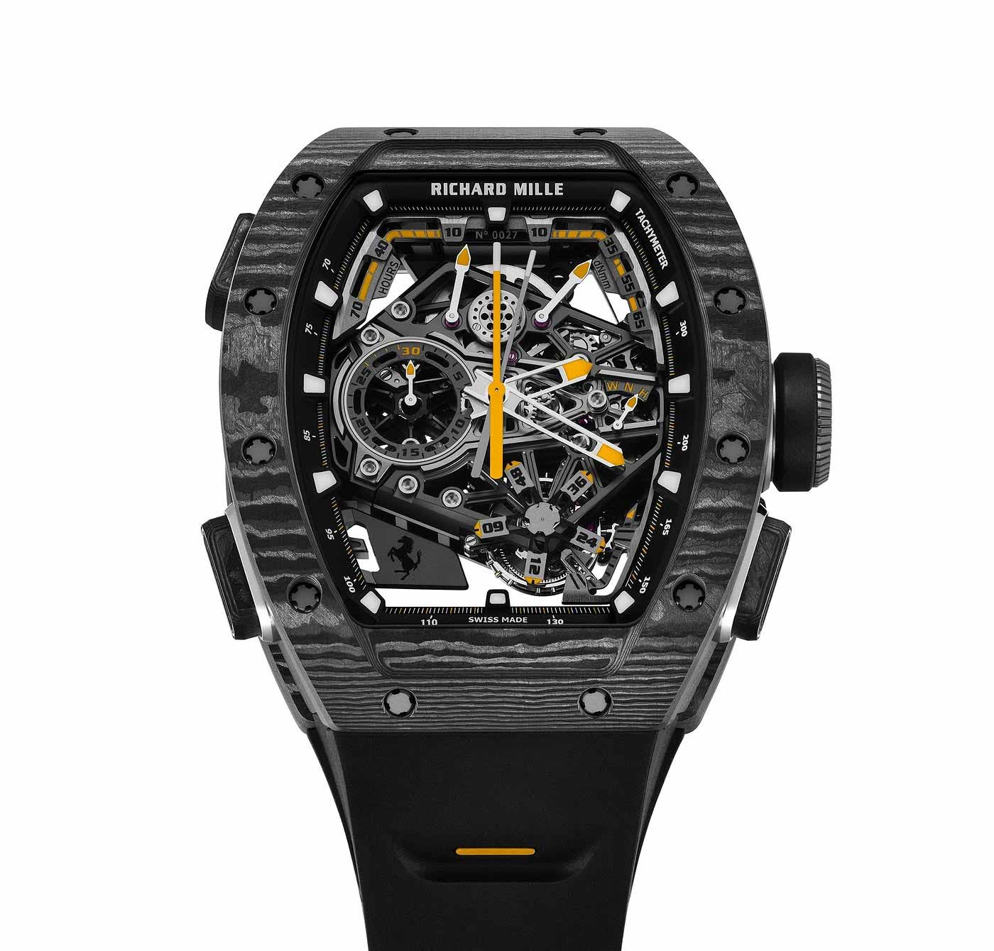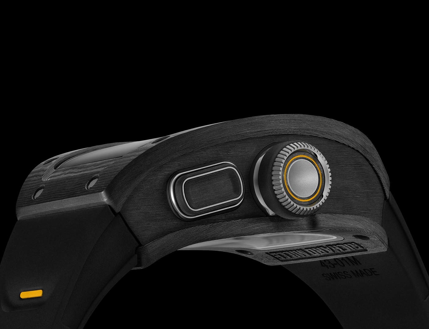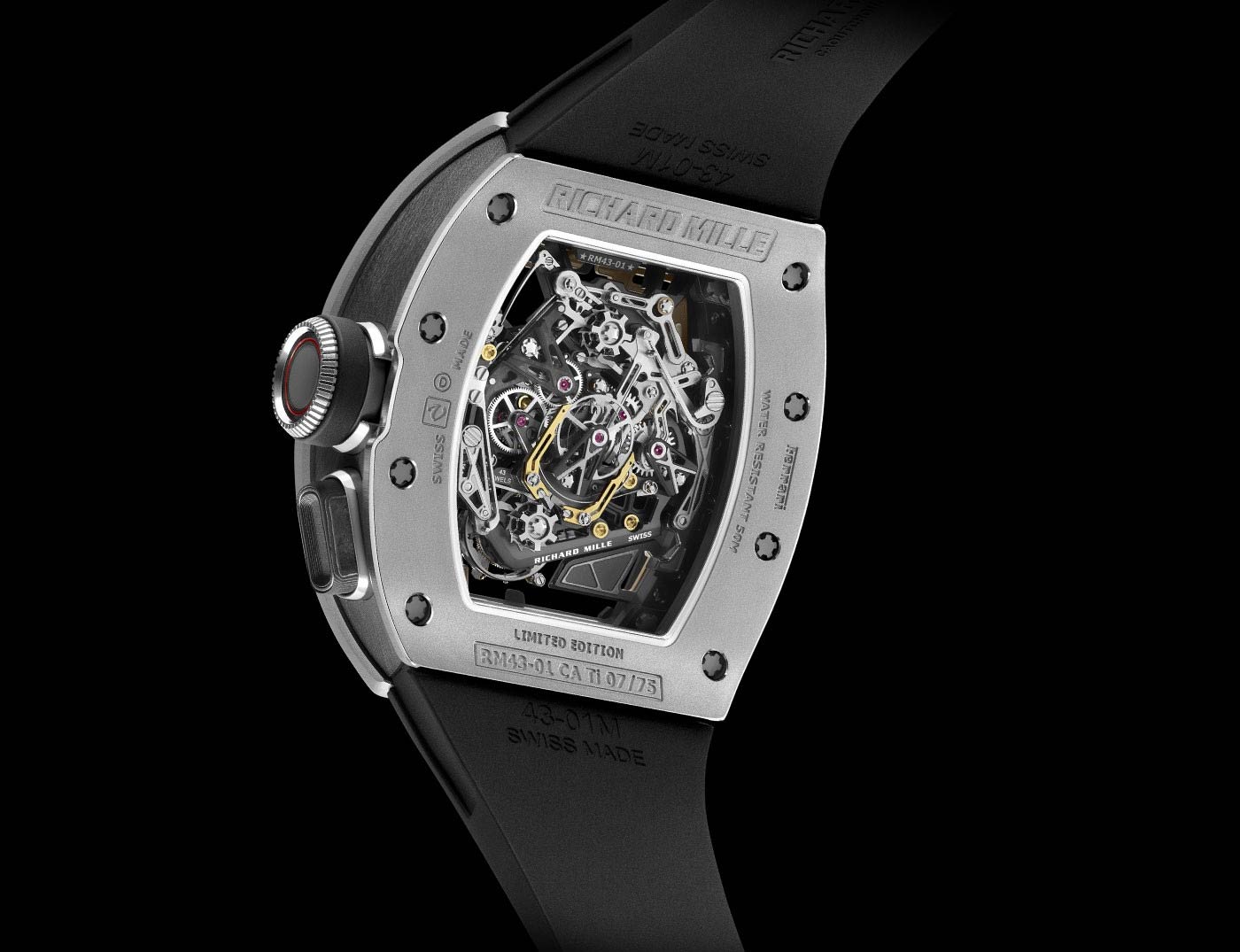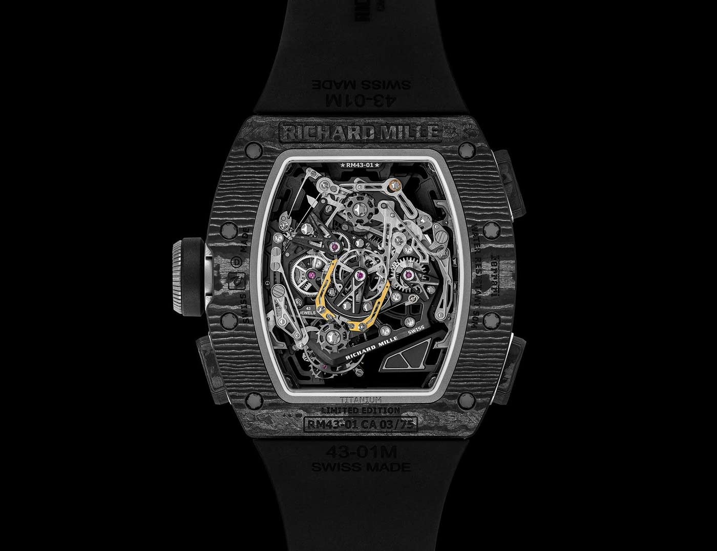 The RM 43-01 is available in two versions, a brushed titanium and Carbon TPT model with red and gold accents ($1,300,000.00), and a rugged all Carbon TPT design with yellow accents ($1,535,000.00). Each is limited to 75 pieces.