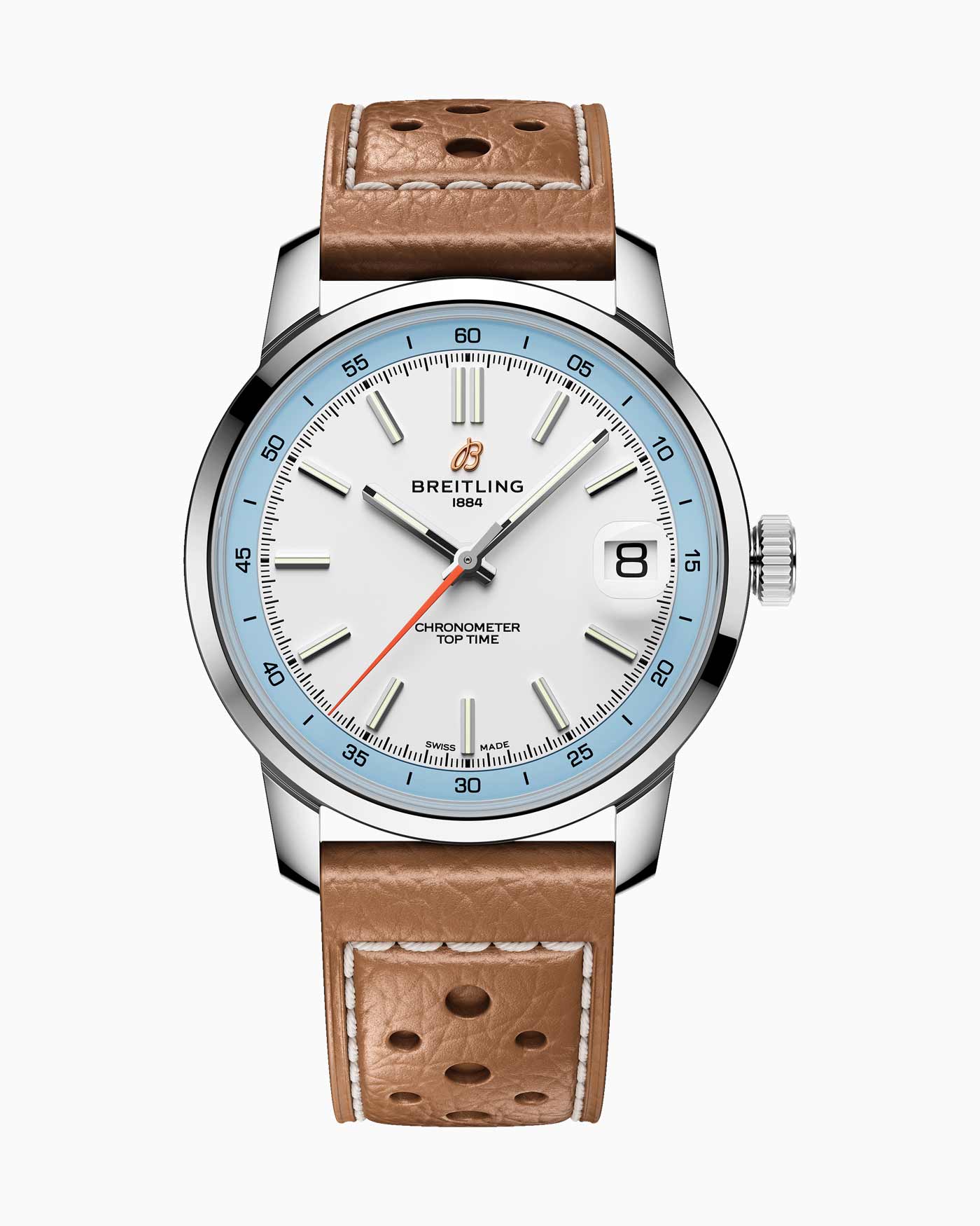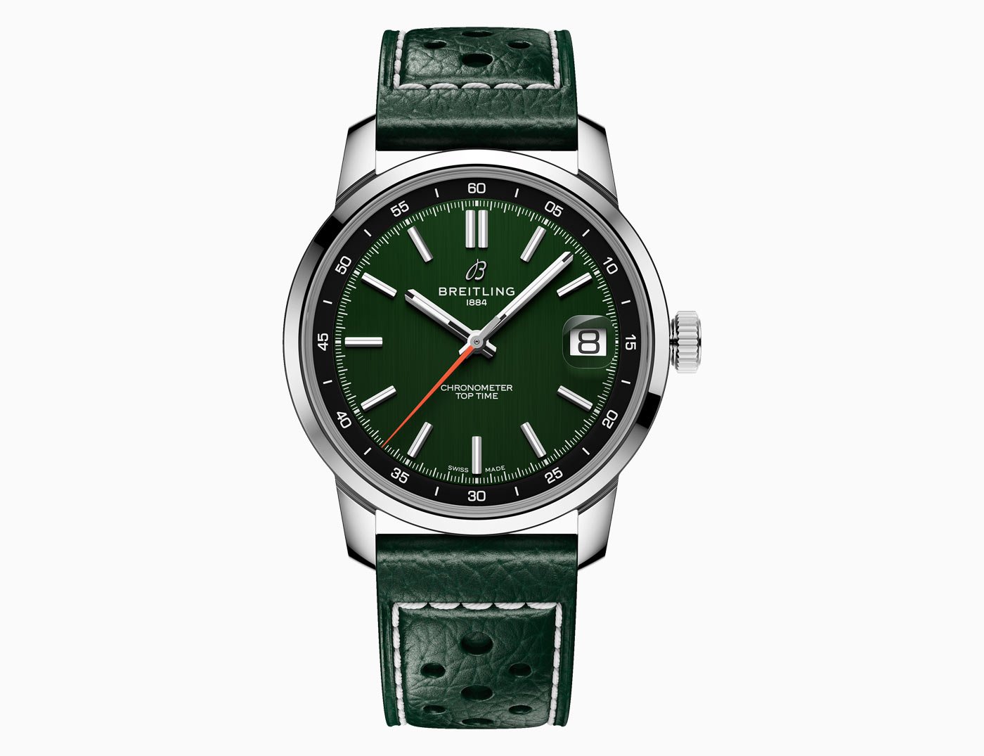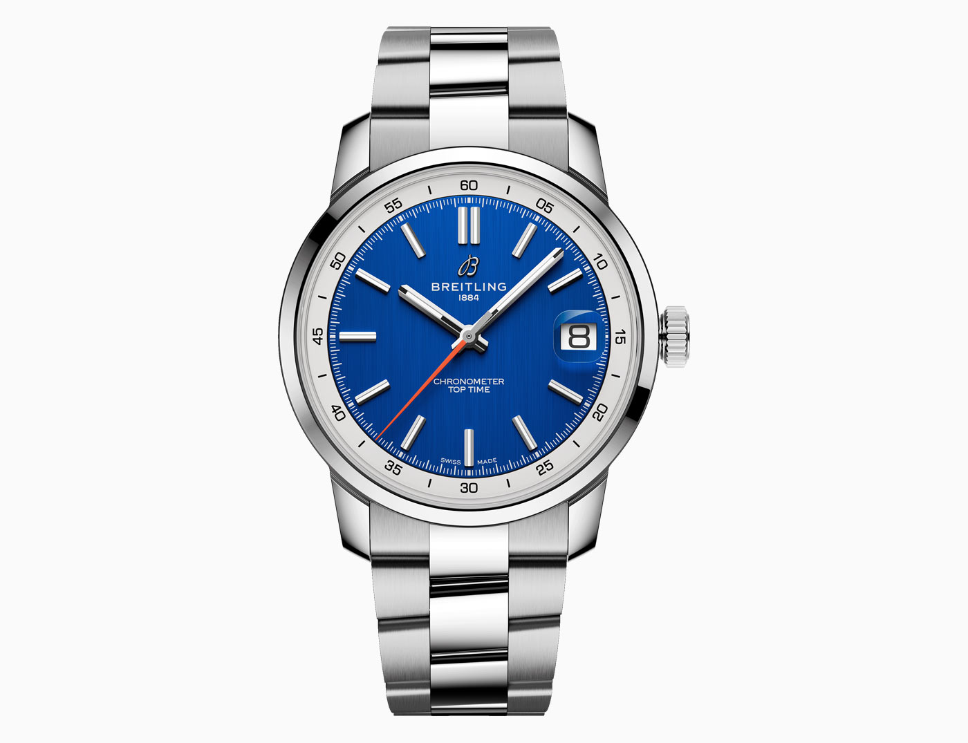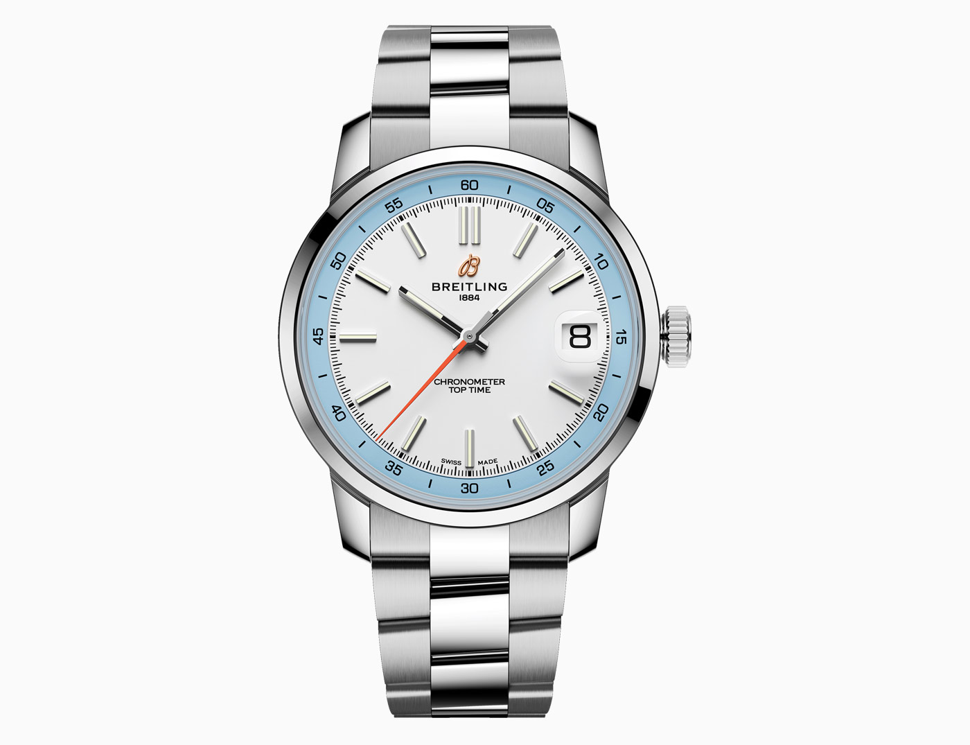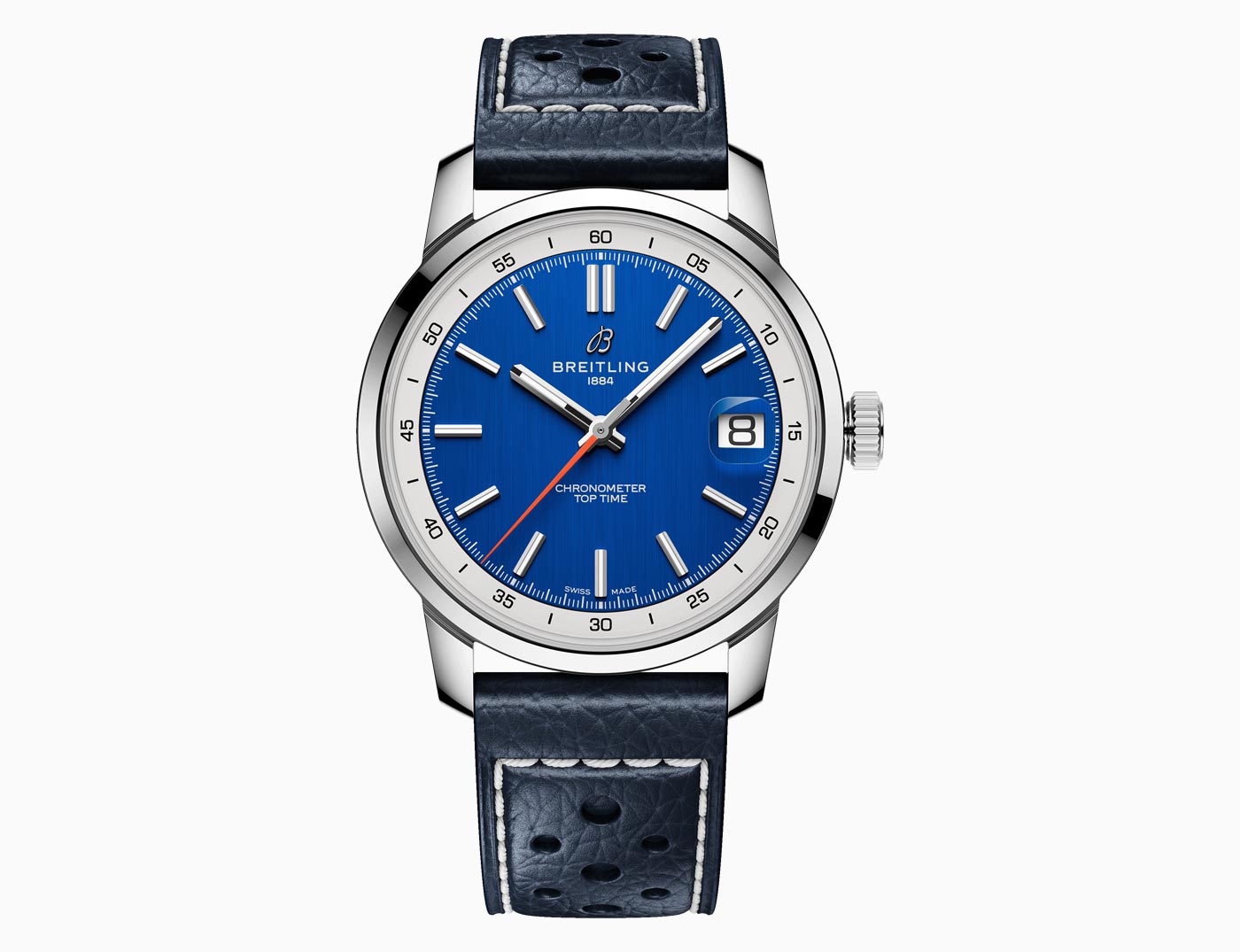 Breitling’s latest Top Time collection introduces the Caliber B31, the first three-hand manufacture movement designed and developed by the brand. Breaking from its chronograph roots, the time-only Top Time B31 represents a return to the fundamentals of watchmaking, delivering robust performance in a classic 38-mm case. Staying true to the collection’s design codes – where the original 1960s chronograph design featured a bold tachymeter scale – this three-hand version keeps the focus on minutes and seconds in the contrasting rehaut. The Super-LumiNova filled applied indexes on the inner-dial are interrupted at 3 o’clock by the magnified date aperture. While a bright orange seconds hand adds a defining detail across three colorways: white on blue, black on green, and sky blue on white.