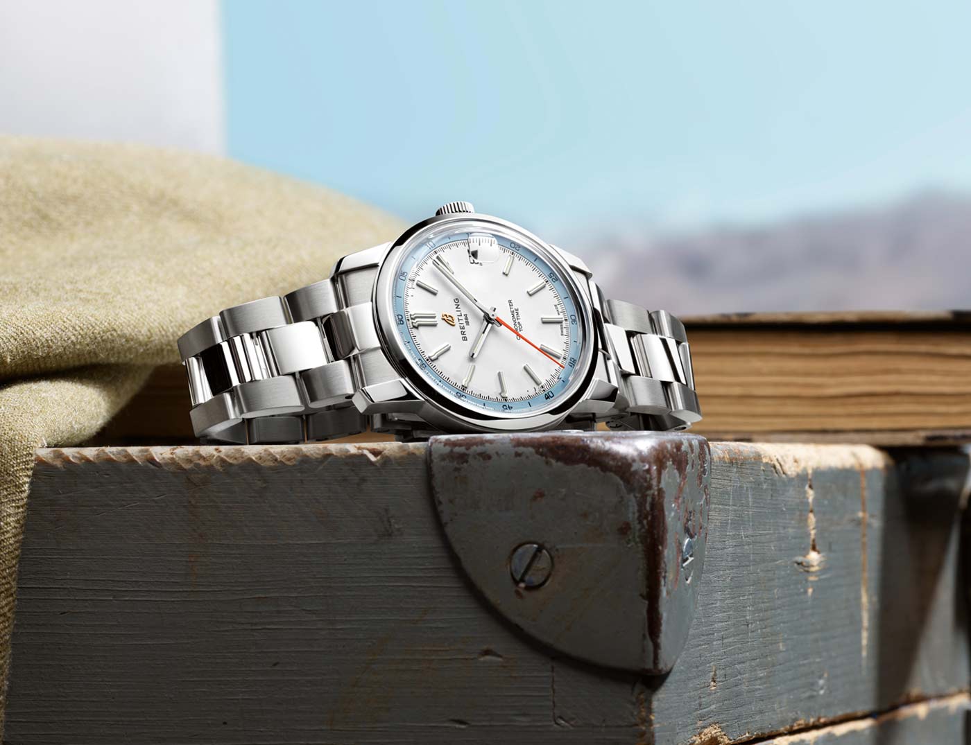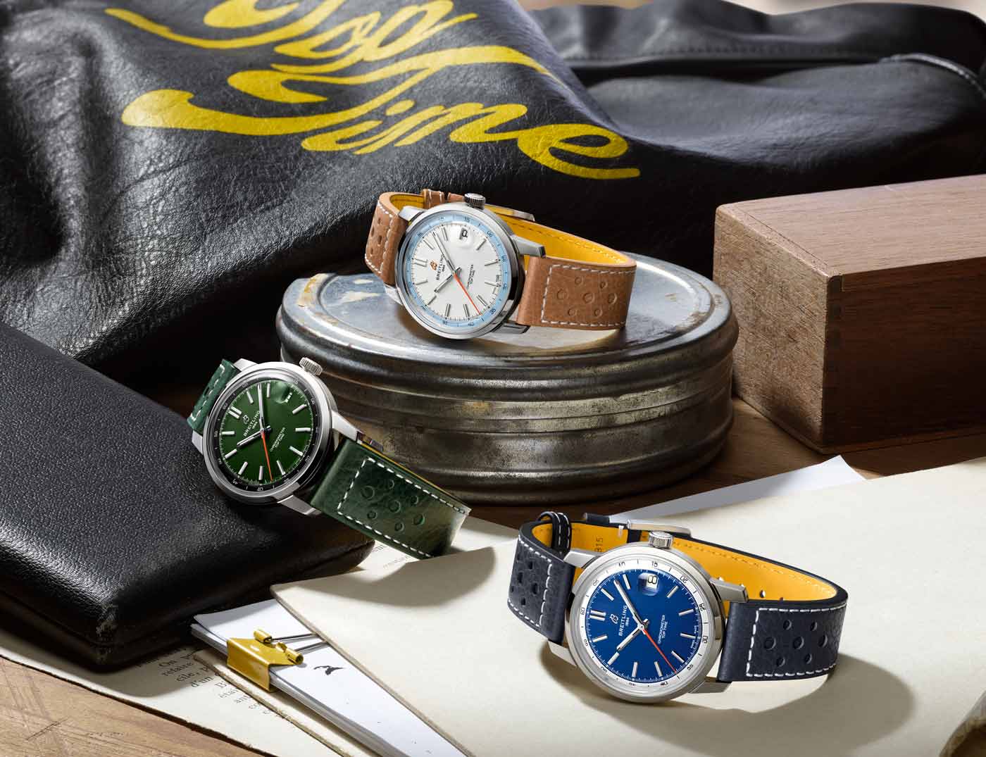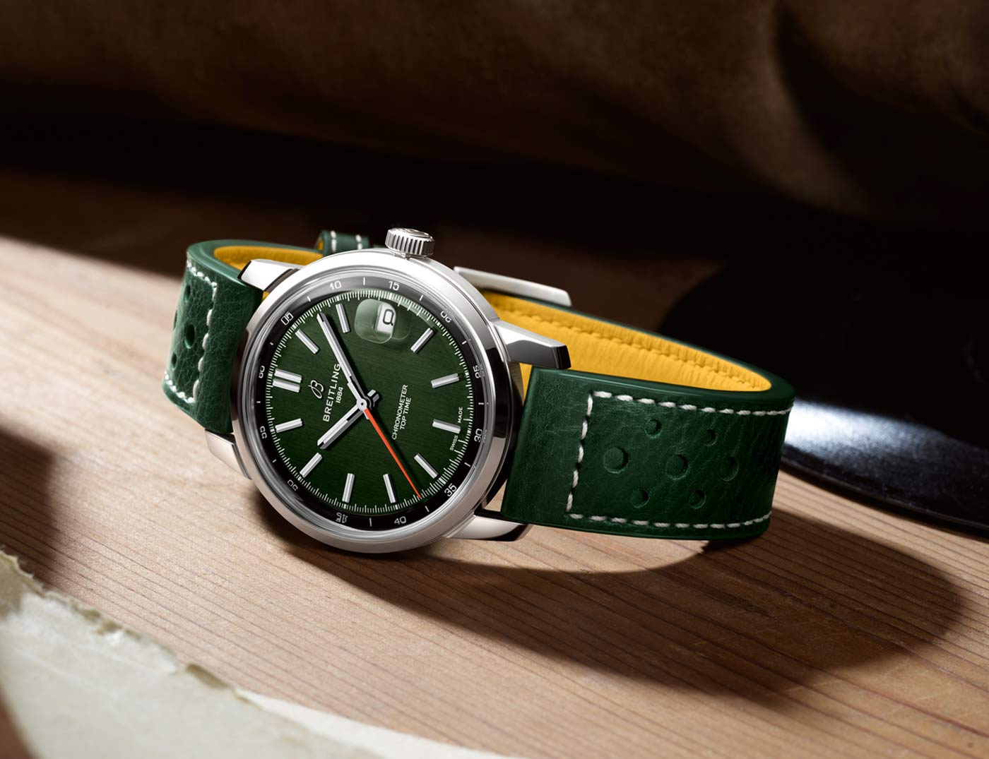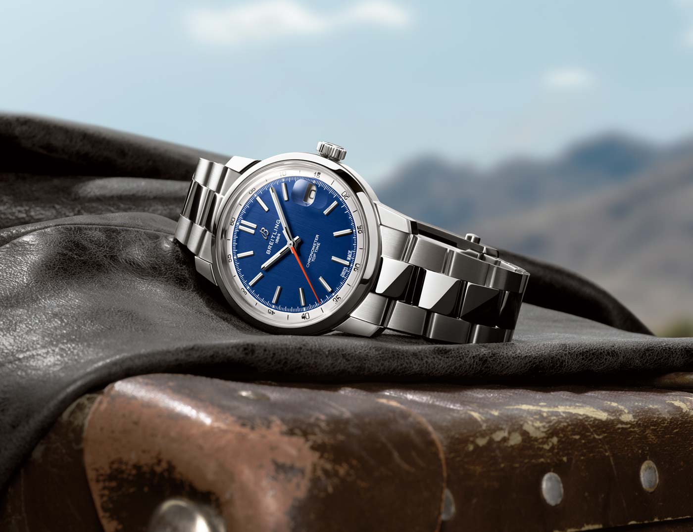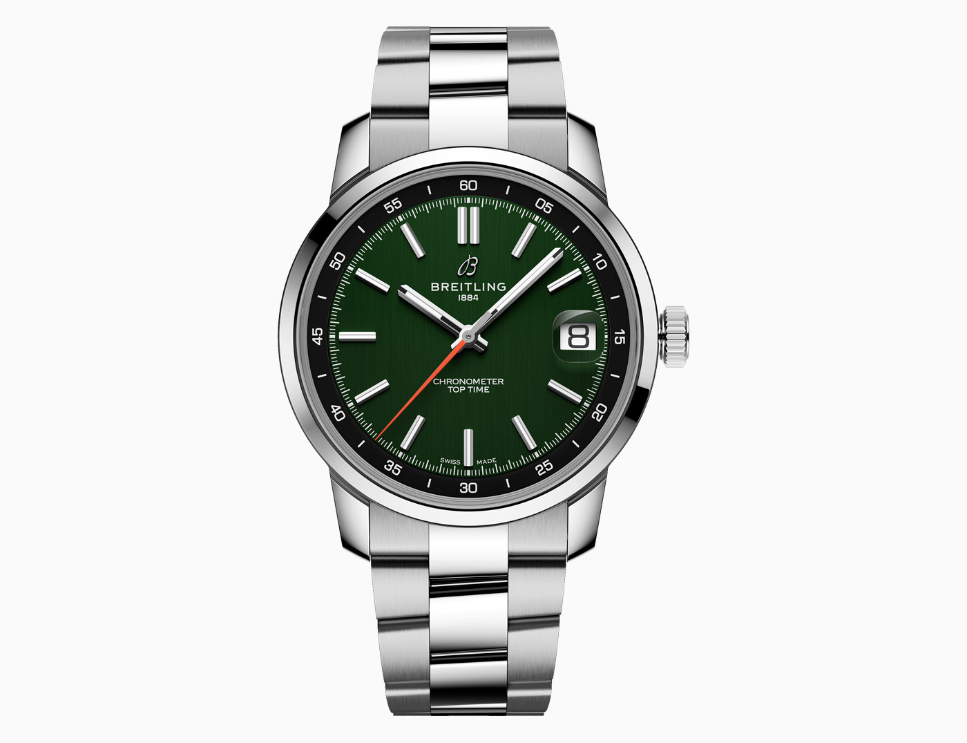 Breitling’s latest Top Time collection introduces the Caliber B31, the first three-hand manufacture movement designed and developed by the brand. Breaking from its chronograph roots, the time-only Top Time B31 represents a return to the fundamentals of watchmaking, delivering robust performance in a classic 38-mm case. Staying true to the collection’s design codes – where the original 1960s chronograph design featured a bold tachymeter scale – this three-hand version keeps the focus on minutes and seconds in the contrasting rehaut. The Super-LumiNova filled applied indexes on the inner-dial are interrupted at 3 o’clock by the magnified date aperture. While a bright orange seconds hand adds a defining detail across three colorways: white on blue, black on green, and sky blue on white.