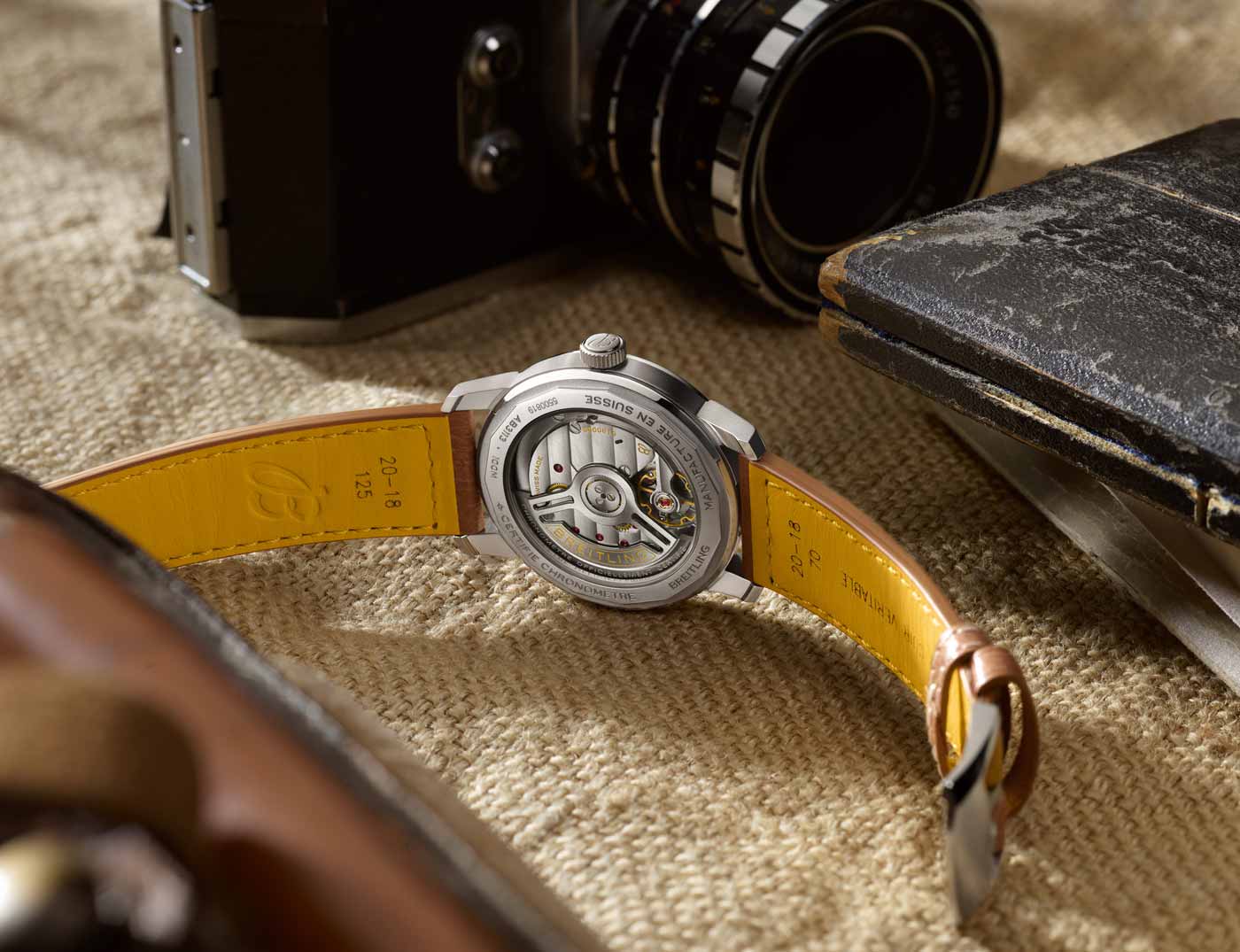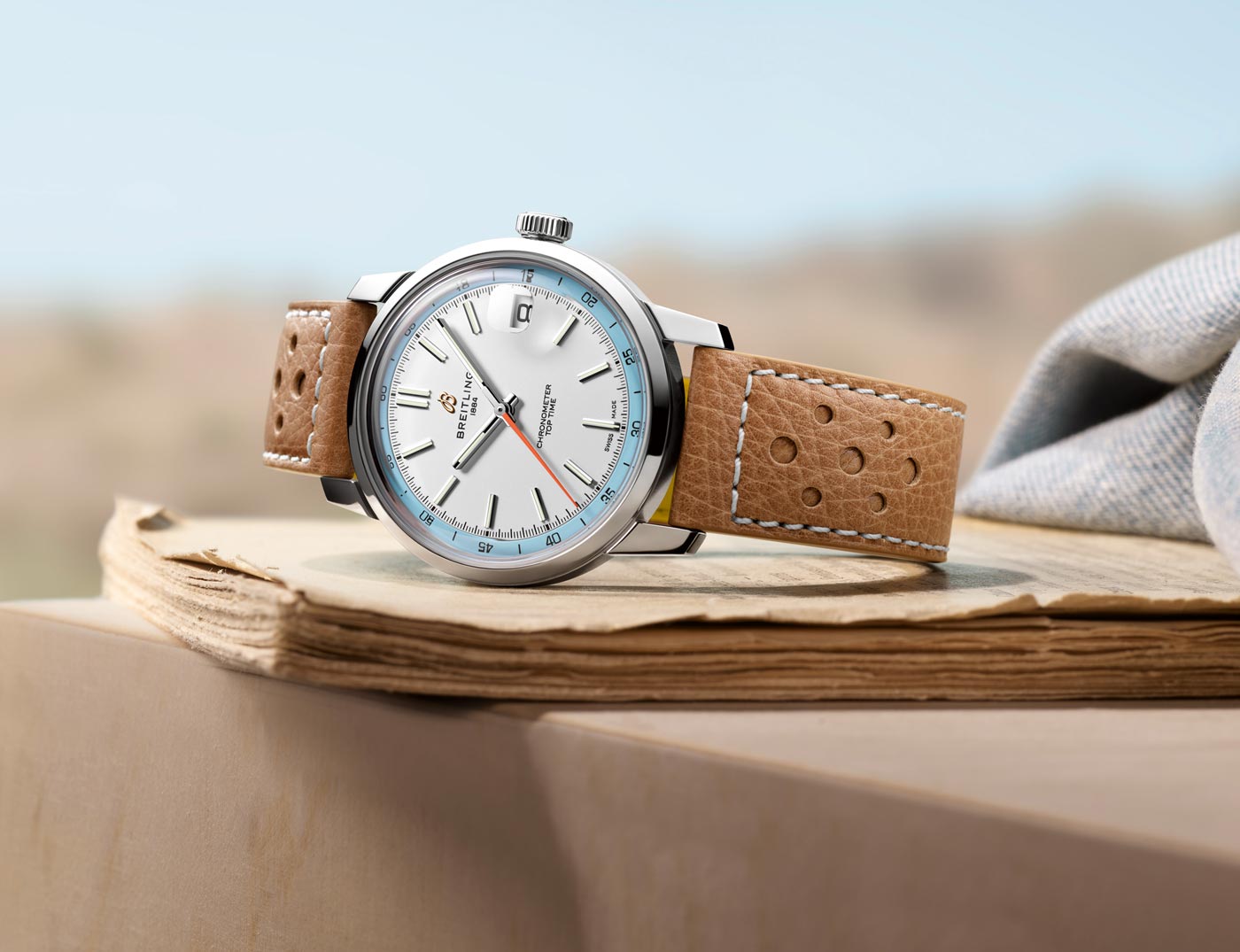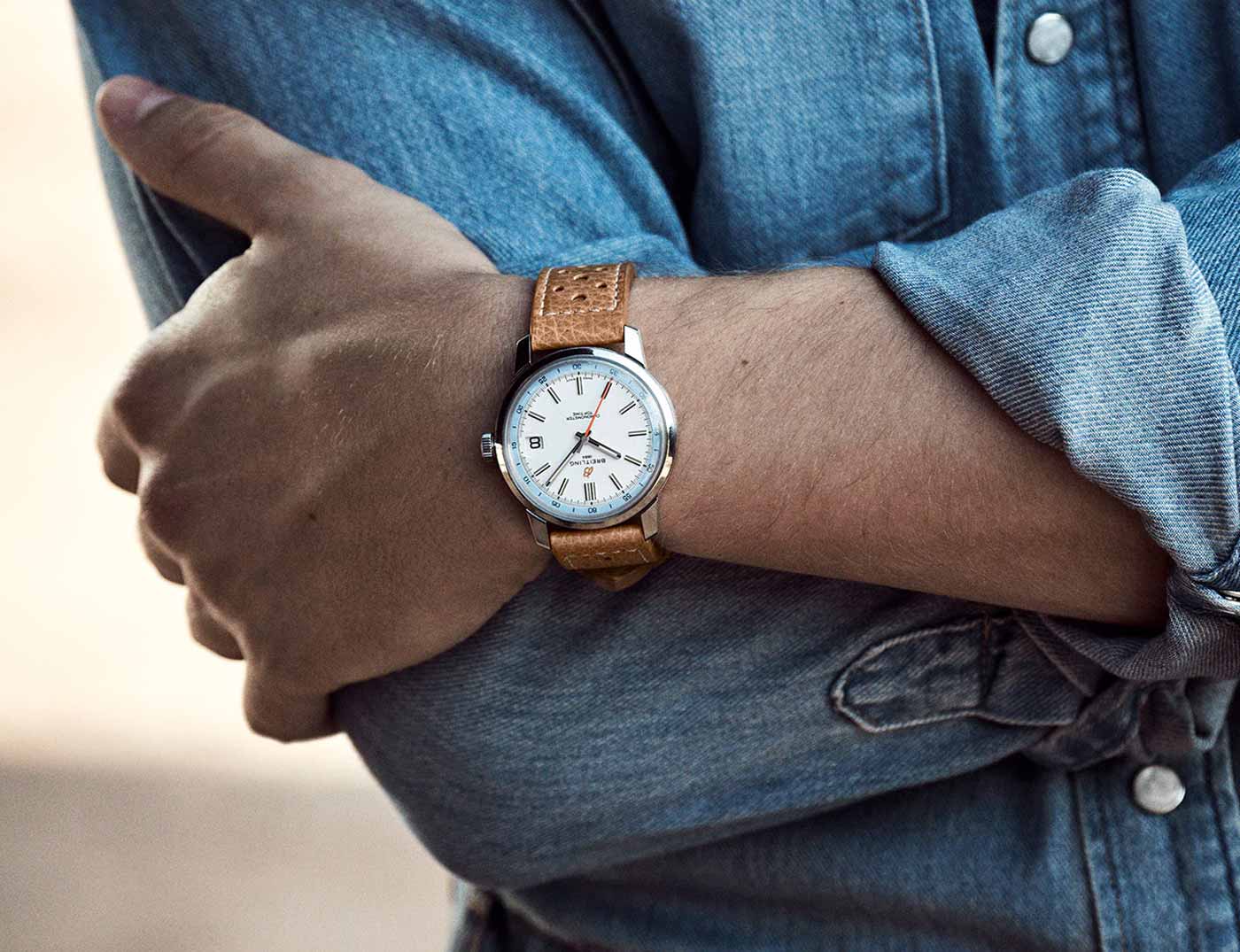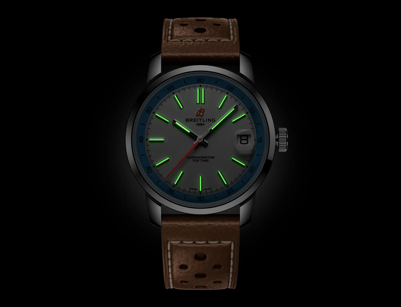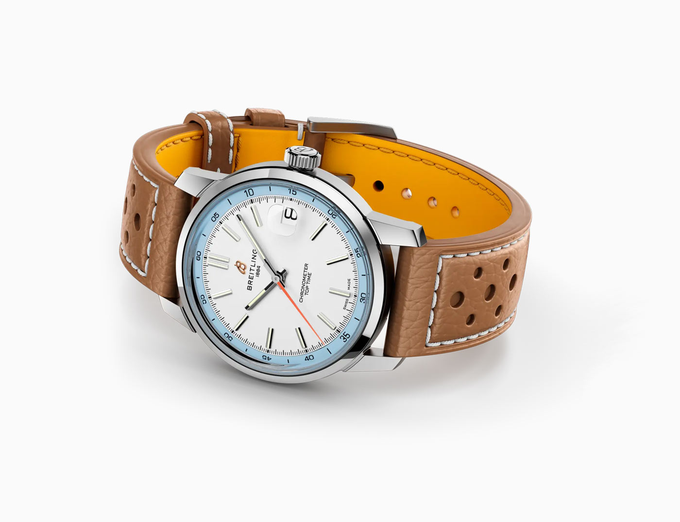 The Top Time B31’s thin profile ensures a comfortable fit that hugs the wrist. Two key features make this possible: tapered lugs and the crystal with two curved tiers, refining the profile for a streamlined look. Four years in the making, the Caliber B31’s unique architecture incorporates Breitling’s signature components: the free-sprung balance wheel for improved precision, and the skeletonized bidirectional oscillating weight powering the automatic movement. These features are visible through the watch’s open caseback, with elements finished in Geneva stripes and perlage. The Top Time B31 comes on either a perforated leather strap with contrasting stitching ($5,600.00), inspired by the collection’s racing roots, or a three-row stainless-steel bracelet with an asymmetrical center link ($5,900.00).