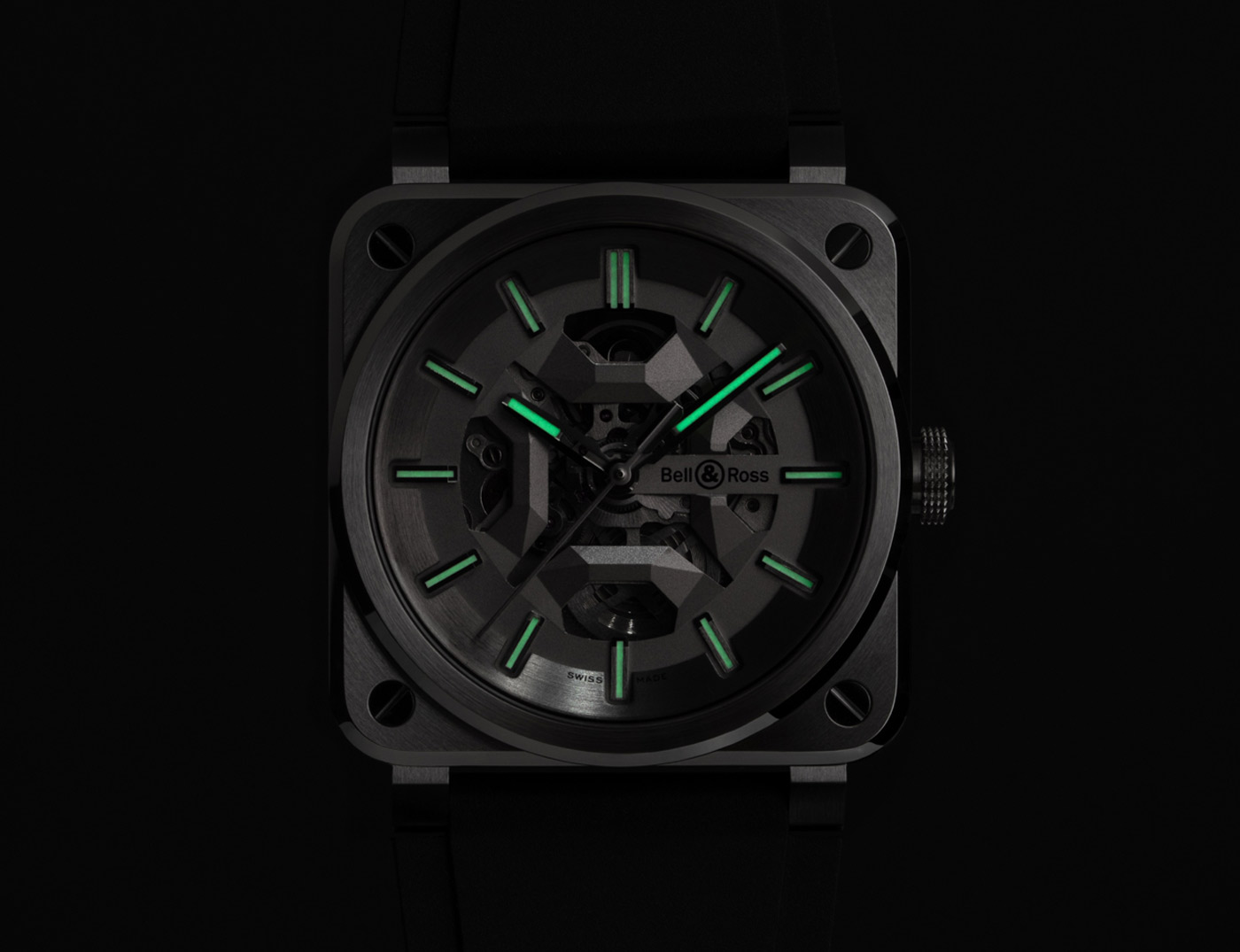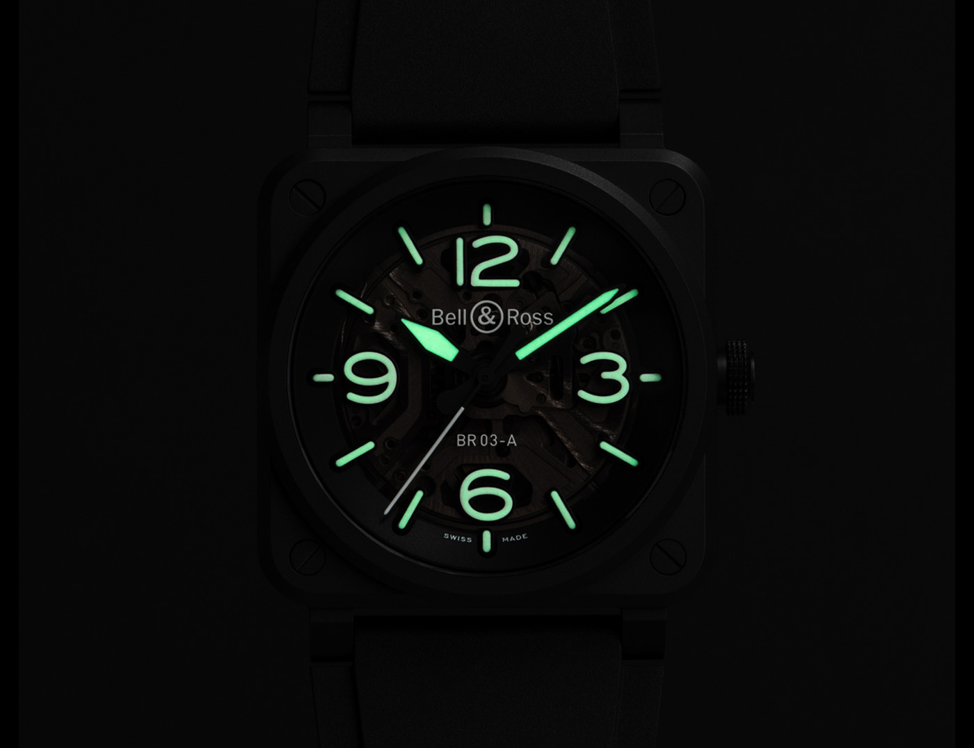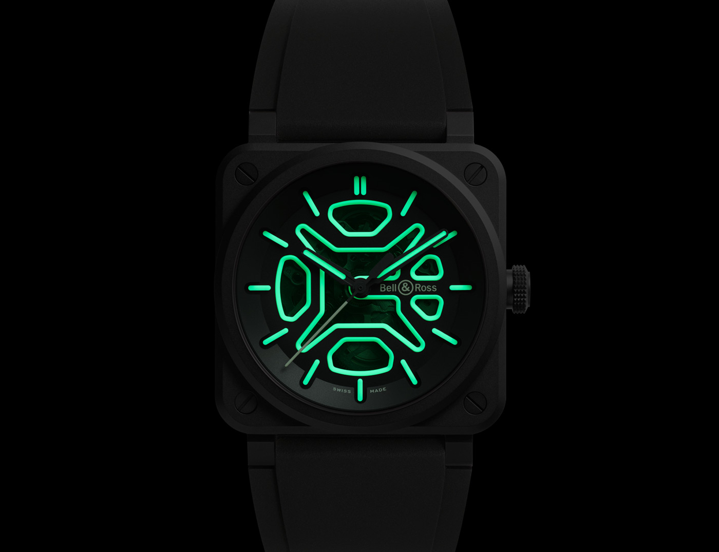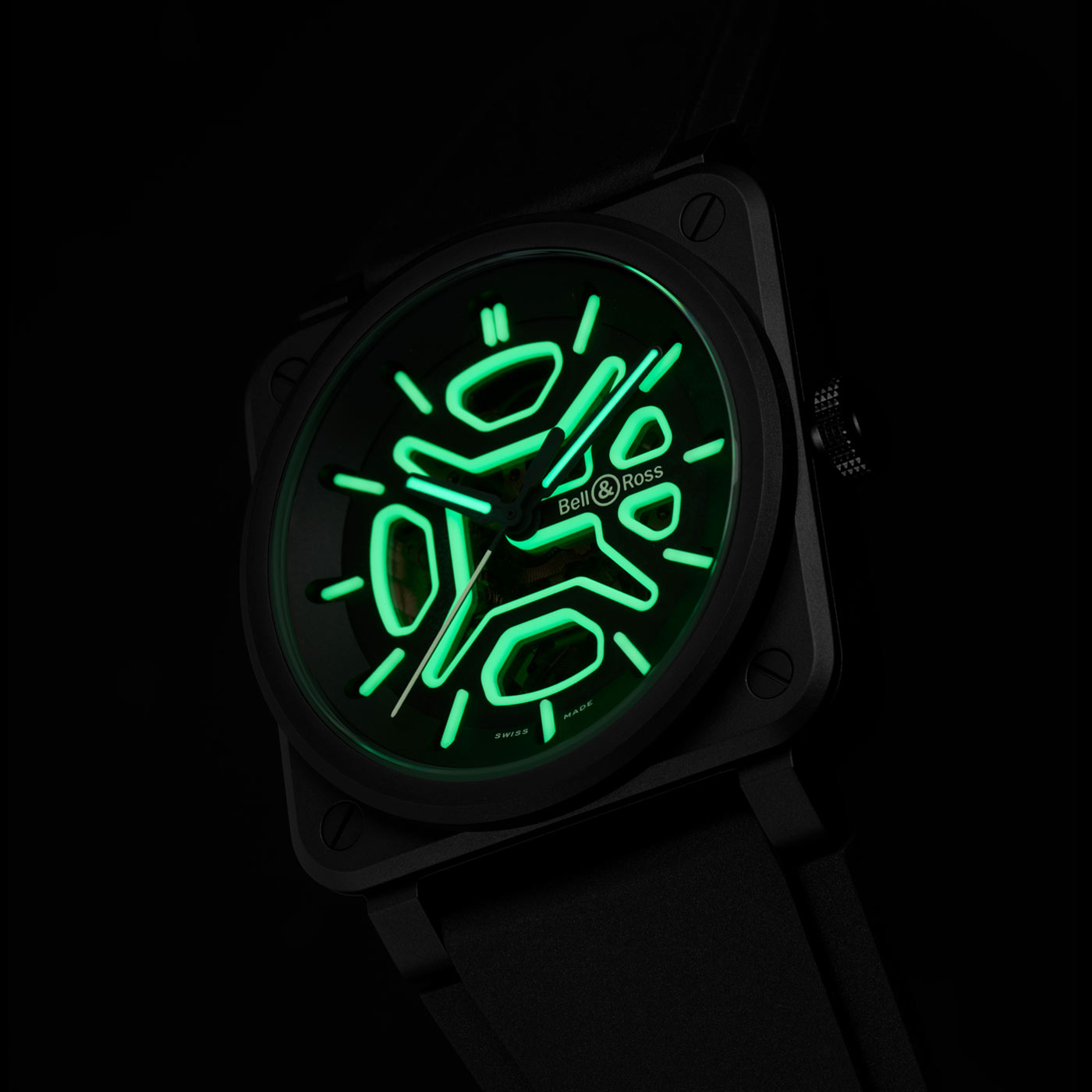 Bell & Ross pushed the limits of creative illumination with the BR-03 Skeleton Lum Ceramic, a watch that transforms in low light. Luminescence, a technical feature that ensures legibility, becomes an innovative design element with green SuperLumiNova highlighting the contours of the cut-outs, hands and markers.