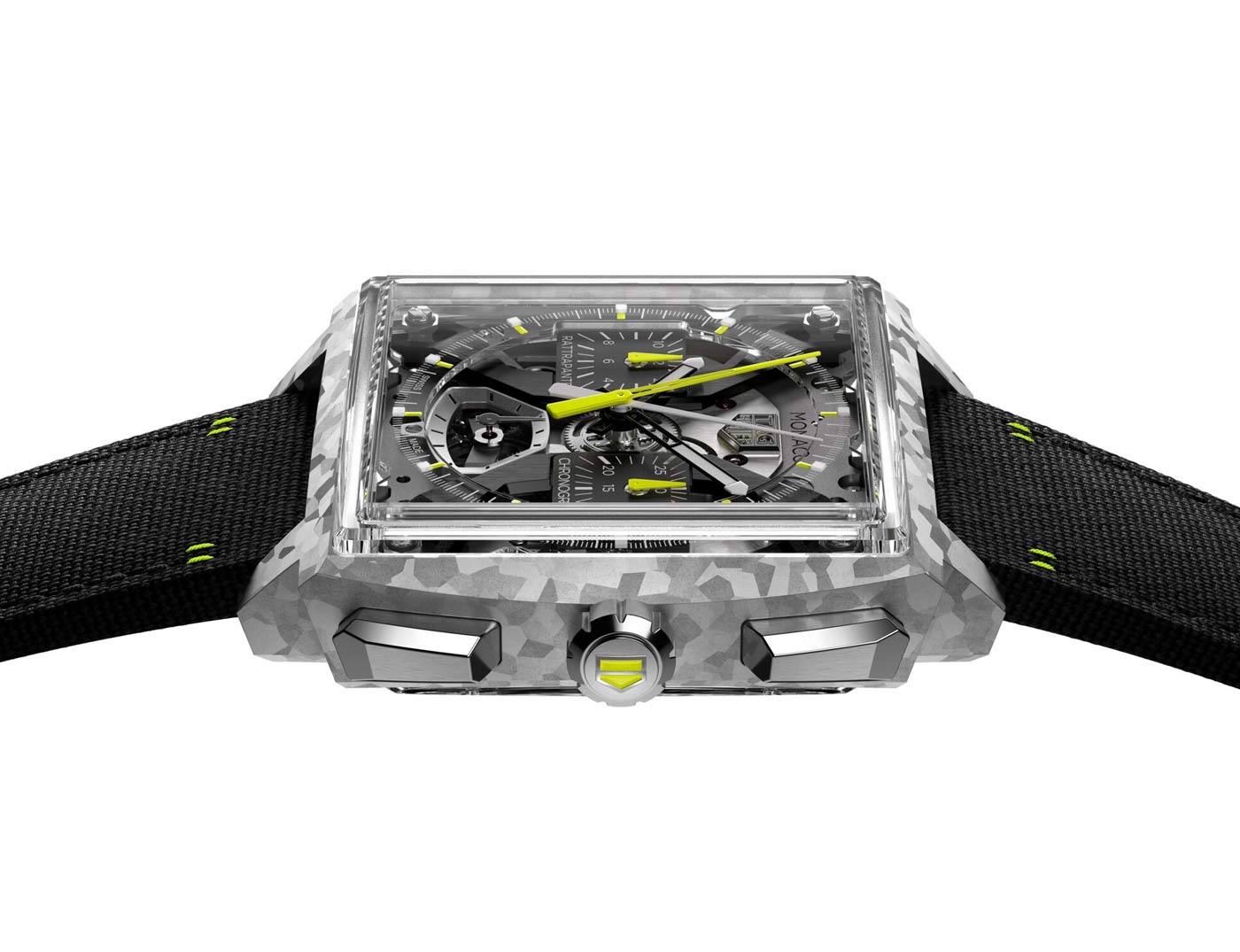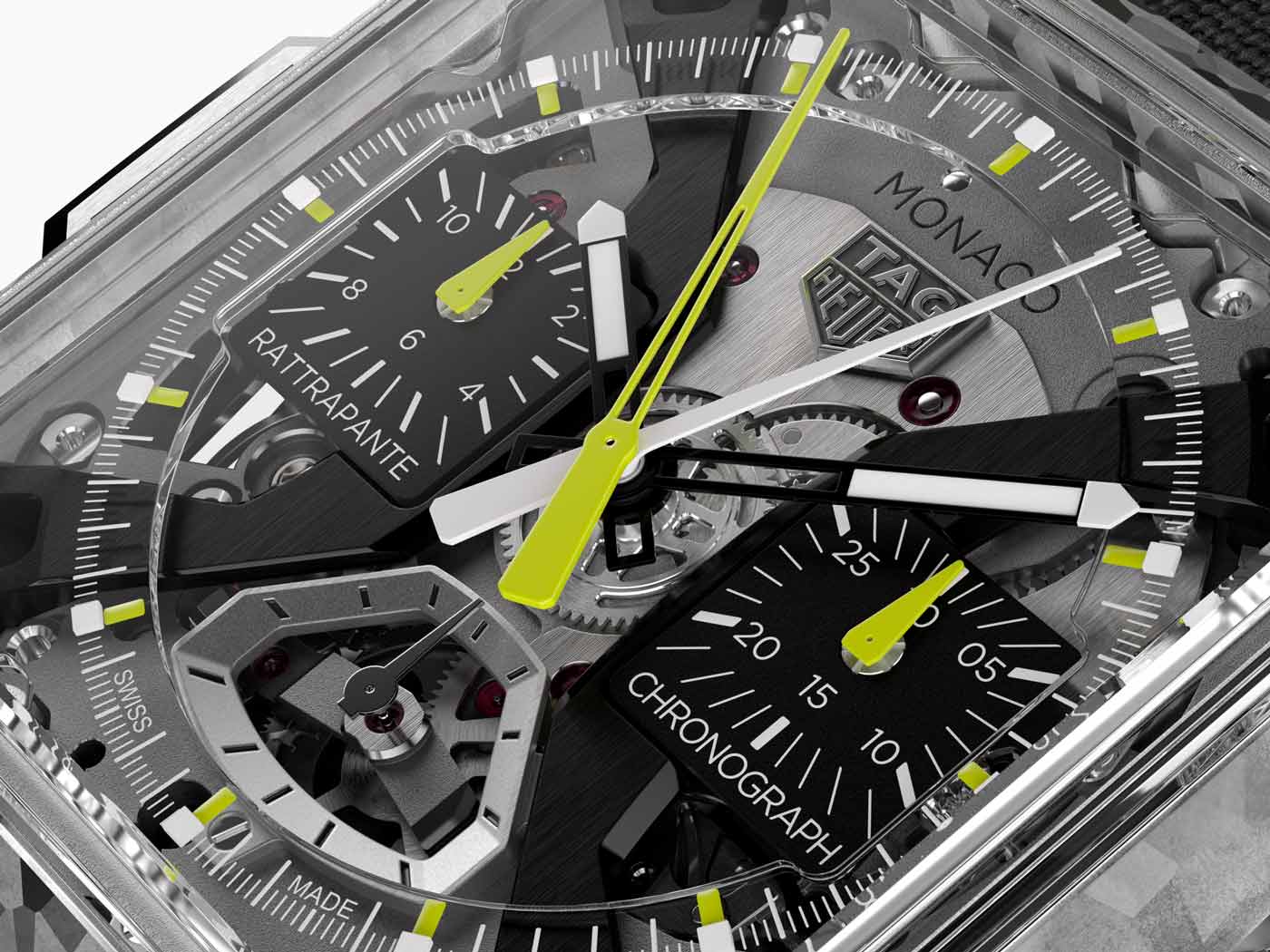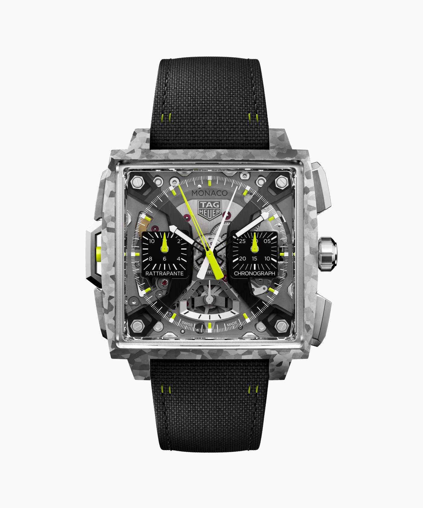 The 2025 TAG Heuer Monaco Split-Seconds Chronograph features a 41-mm case made of TH-Titanium. Entirely developed in-house, this new textured titanium form is forged using a thermal process that transforms the metal, creating distinctive patterns that make every watch unique. The sapphire glass crystal frames the dial’s lime green accents and black counters, while the exhibition back exposes the architectural depth of the Calibre TH81-00 movement. Its split-seconds function is capable of measuring two separate time intervals concurrently, providing a level of functionality that exceeds that of a regular chronograph. The movement is also crafted in titanium and weighs only 30 grams, contributing to the watch’s exceptionally light weight: a mere 86 grams in total, including the strap and buckle.