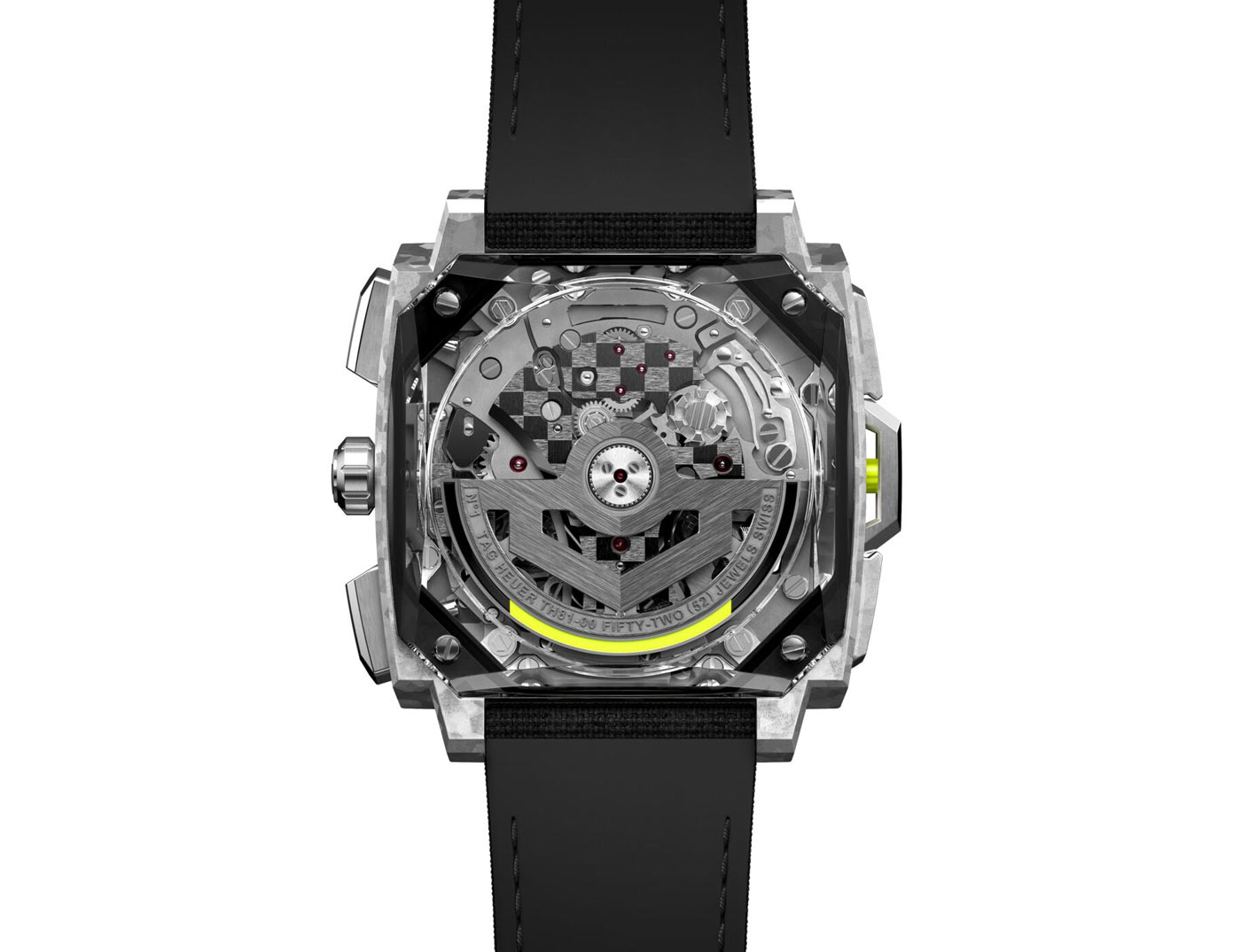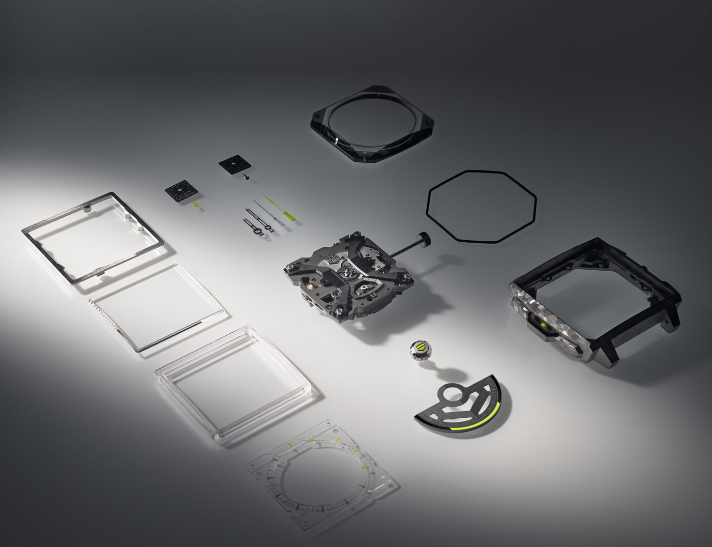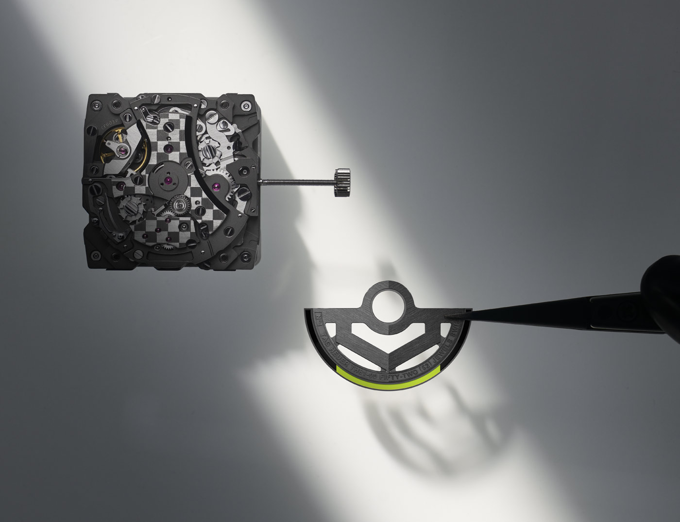 The 2025 TAG Heuer Monaco Split-Seconds Chronograph features a 41-mm case made of TH-Titanium. Entirely developed in-house, this new textured titanium form is forged using a thermal process that transforms the metal, creating distinctive patterns that make every watch unique. The sapphire glass crystal frames the dial’s lime green accents and black counters, while the exhibition back exposes the architectural depth of the Calibre TH81-00 movement. Its split-seconds function is capable of measuring two separate time intervals concurrently, providing a level of functionality that exceeds that of a regular chronograph. The movement is also crafted in titanium and weighs only 30 grams, contributing to the watch’s exceptionally light weight: a mere 86 grams in total, including the strap and buckle.