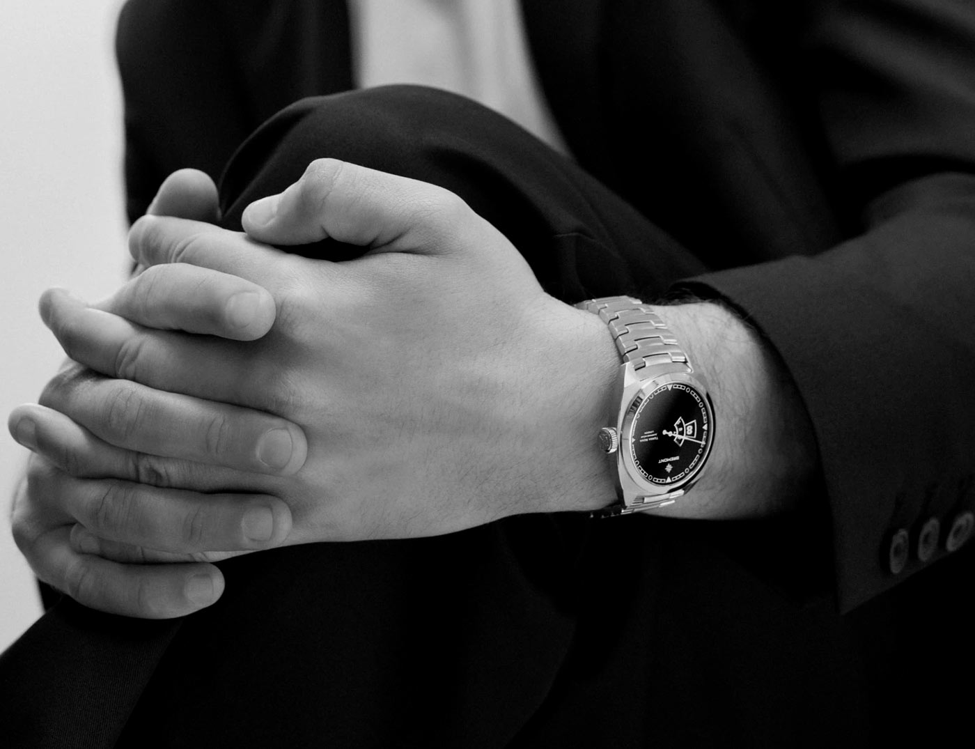 The glossy black lacquered dial features offset apertures for the hour and minute displays. This layout creates a left-to-right flow that balances the design and enhances readability. Finished with applied markers, a detailed minute track, and luminous accents, the dial offers exceptional legibility and a distinctive, high-contrast aesthetic. The Terra Nova Jumping Hour is available on either a 904L stainless steel bracelet ($4,300.00) or black leather strap ($4,000.00).