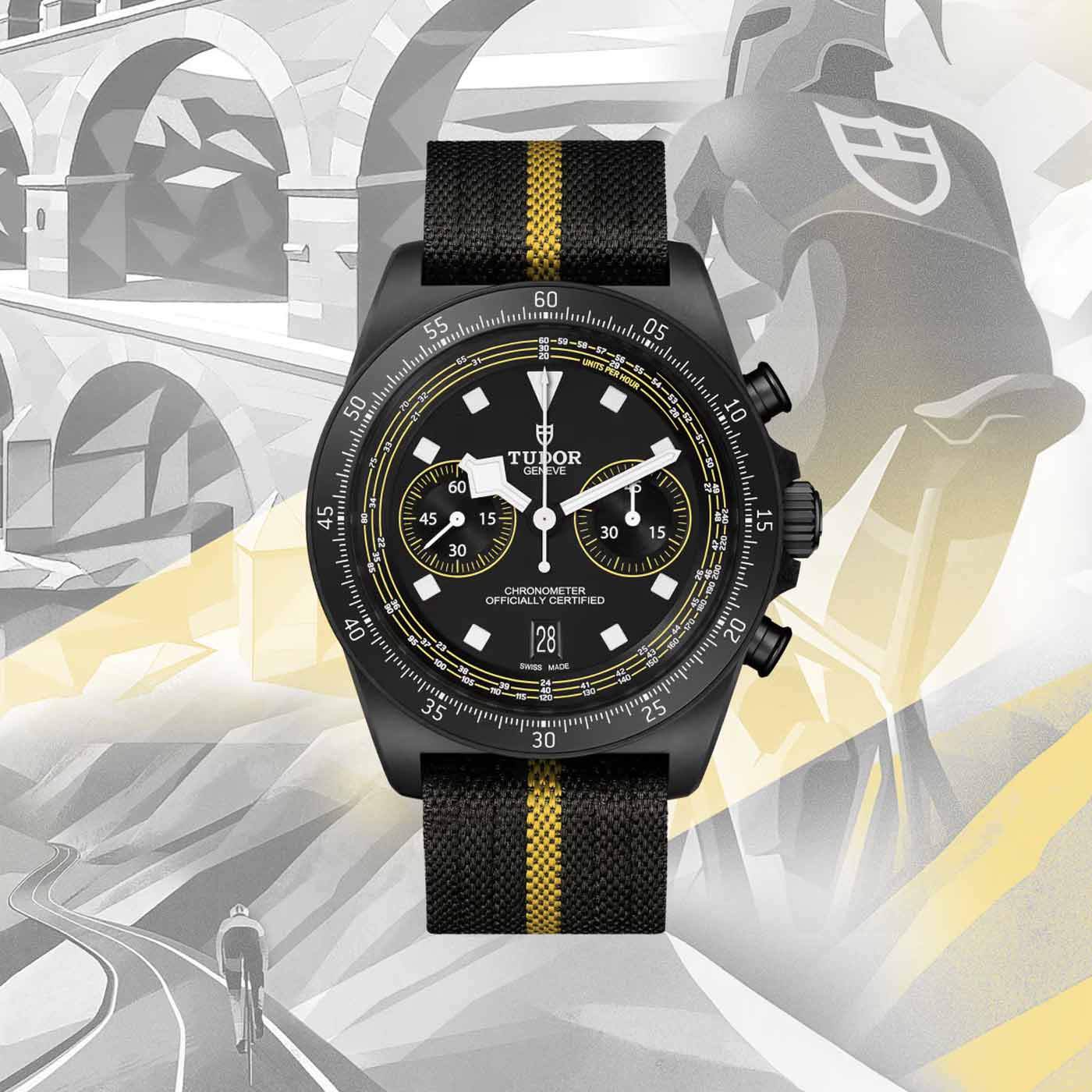 Fabian Cancellara earned the nickname Spartacus for the determination he showed during the 2004 Tour de France. To honor his legacy Tudor is issuing a special edition Pelagos FXD Chrono, with yellow accents inspired by Canellara’s days battling France’s most challenging roads in the brutal summer heat. Encased in carbon composite, the 43-mm Pelagos FXD Chrono ‘Yellow’ sports a yellow tachymeter scale specifically calibrated to speeds cyclists can sustain. Yellow accents also appear on the chronograph counters at 3 and 9 o’clock. Tudor’s MT5813 chronograph movement powers the watch. Available in a limited edition of 300 pieces.