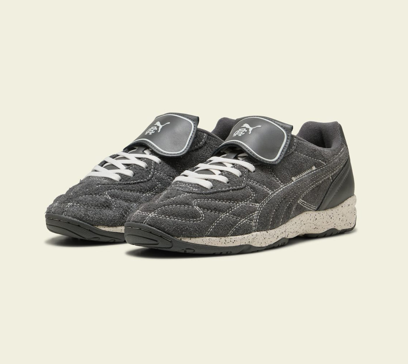 Obviously, the trainers are the standouts. Starting with the ‘terrace’ icon, the Puma x Reigning Champ Palermo G ($130.00). Retooled for the fairway, this is the first-ever Palermo made for golf – featuring a leather upper, suede heel counter and spike-less traction. While Puma’s classic football trainer, the King Indoor was reimagined for the streets. The Puma x Reigning Champ King IT Indoor ($140.00) features a hairy suede upper, speckled EVA mid-sole, and pitch-inspired lace shroud. Both shoes sport exclusive 1-of-1 colorways and collaborative branding.