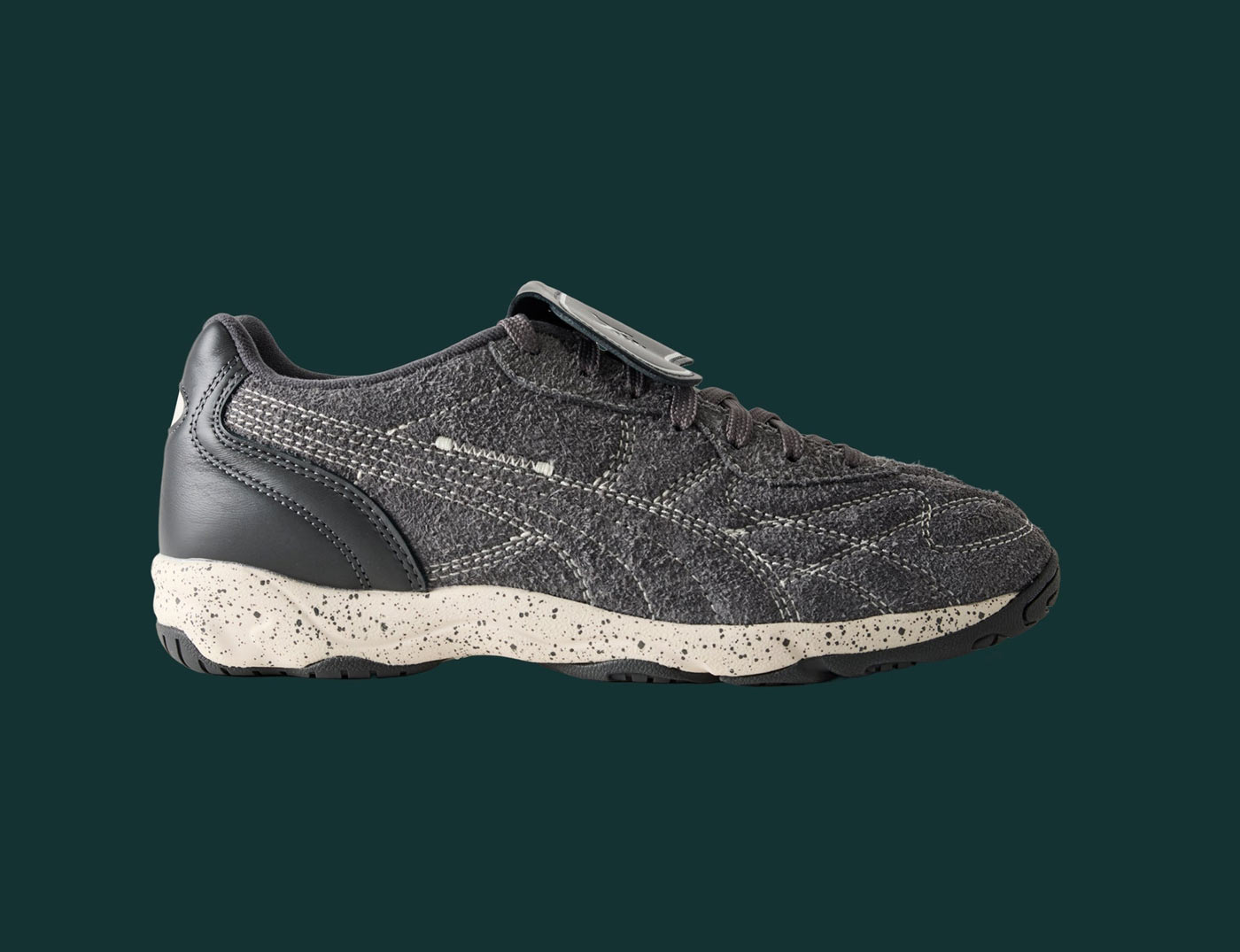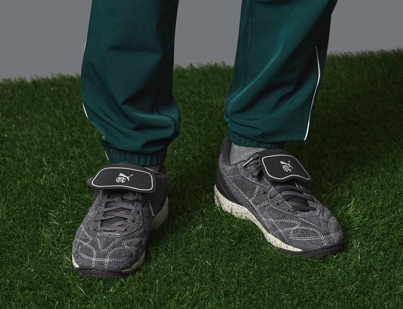 Obviously, the trainers are the standouts. Starting with the ‘terrace’ icon, the Puma x Reigning Champ Palermo G ($130.00). Retooled for the fairway, this is the first-ever Palermo made for golf – featuring a leather upper, suede heel counter and spike-less traction. While Puma’s classic football trainer, the King Indoor was reimagined for the streets. The Puma x Reigning Champ King IT Indoor ($140.00) features a hairy suede upper, speckled EVA mid-sole, and pitch-inspired lace shroud. Both shoes sport exclusive 1-of-1 colorways and collaborative branding.