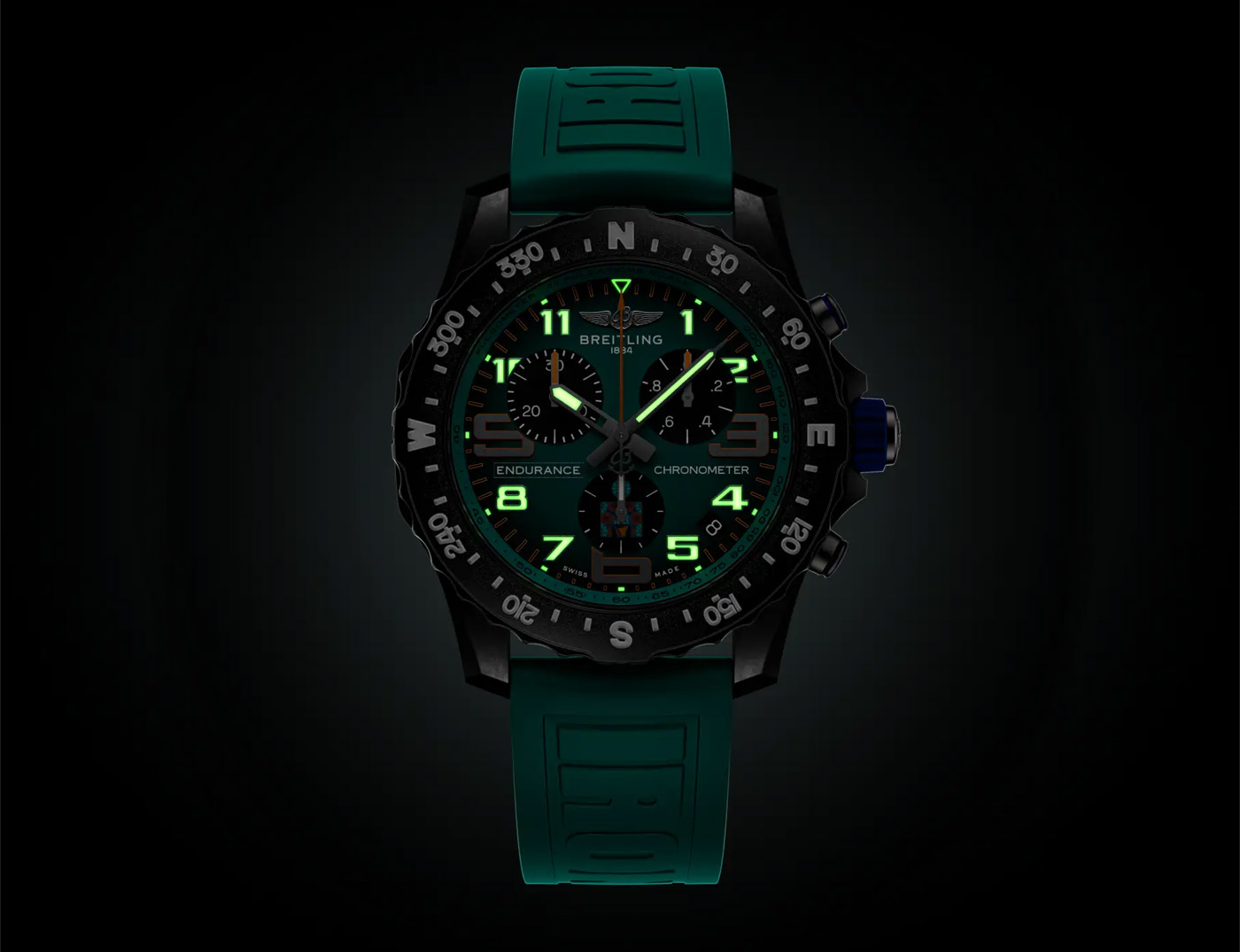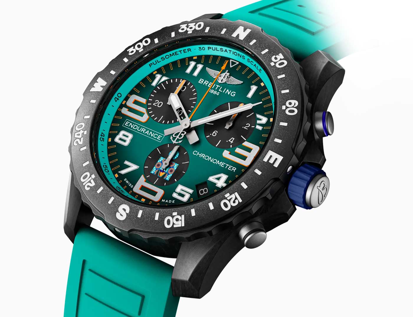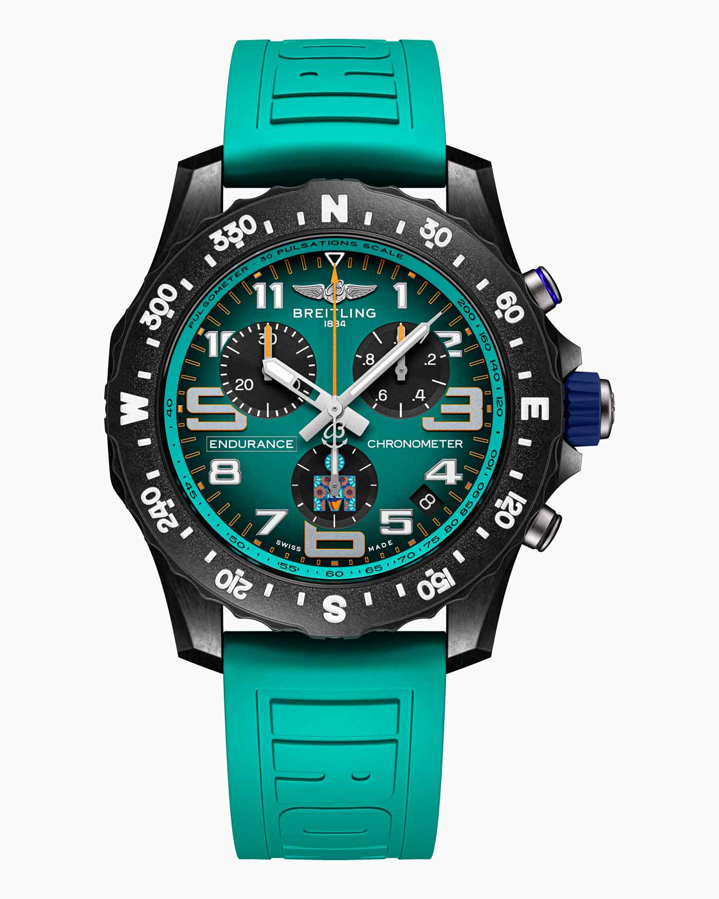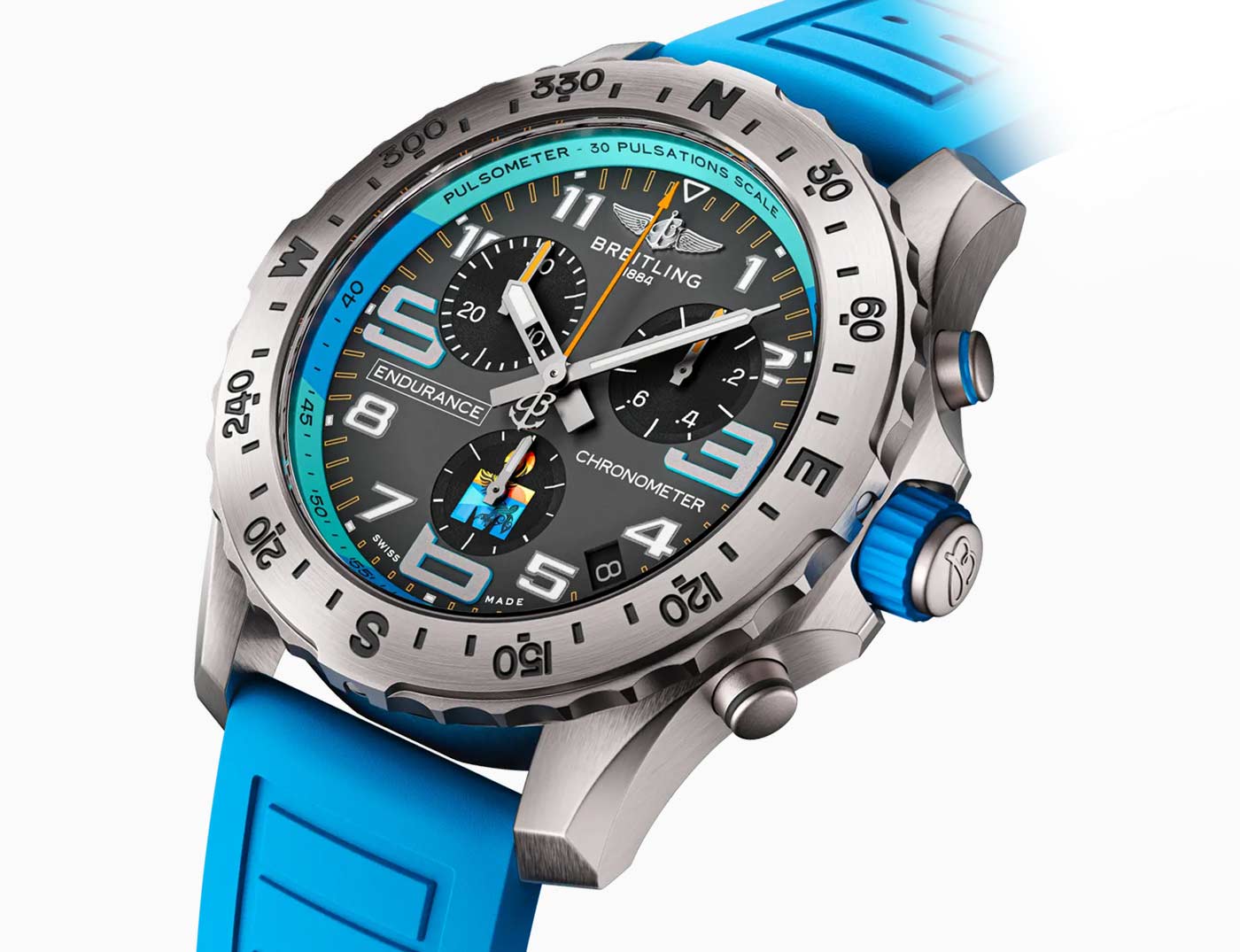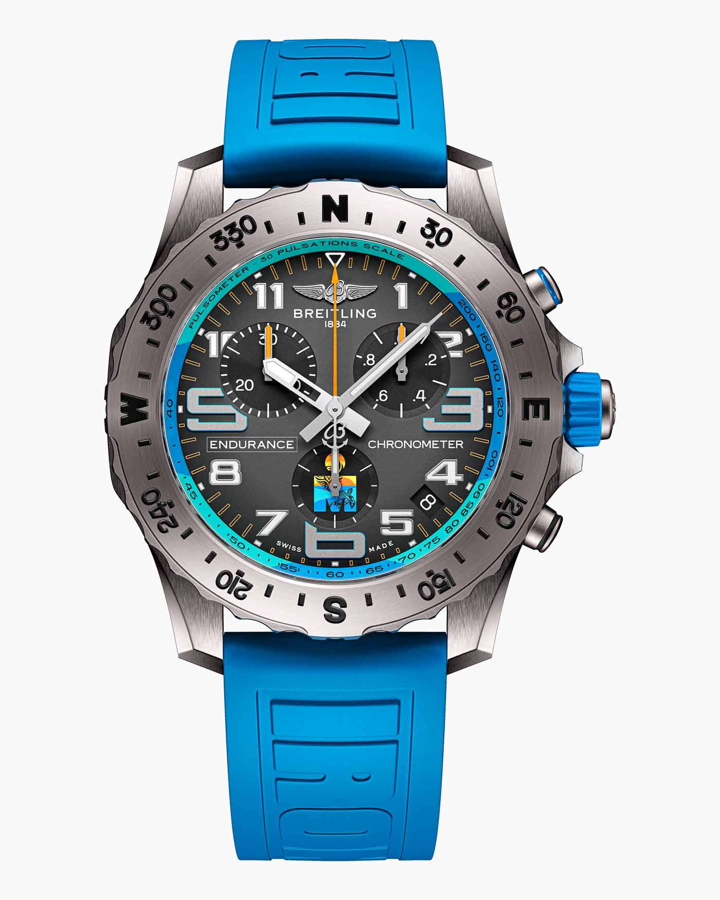 The Endurance Pro 44 IRONMAN 70.3 World Championship 2025 commemorates the Half Ironman championship in Marbella, Spain, with the women’s race on November 8 and the men’s race on November 9, 2025. Inspired by Marbella’s location on the Costa del Sol, the watch features a turquoise dial and strap. The dial incorporates the event’s logo at 6 o’clock. Using imagery evocative of local landscapes and architecture, the logo depicts an arched door with decorative tiles surrounded by nature. Limited to just 300 pieces, this 44-mm chronograph is made of Breitlight – a material 3.3 times lighter than titanium and 5.8 times lighter than steel. Non-magnetic and hypoallergenic, Breitlight is resistant to scratches and corrosion.
