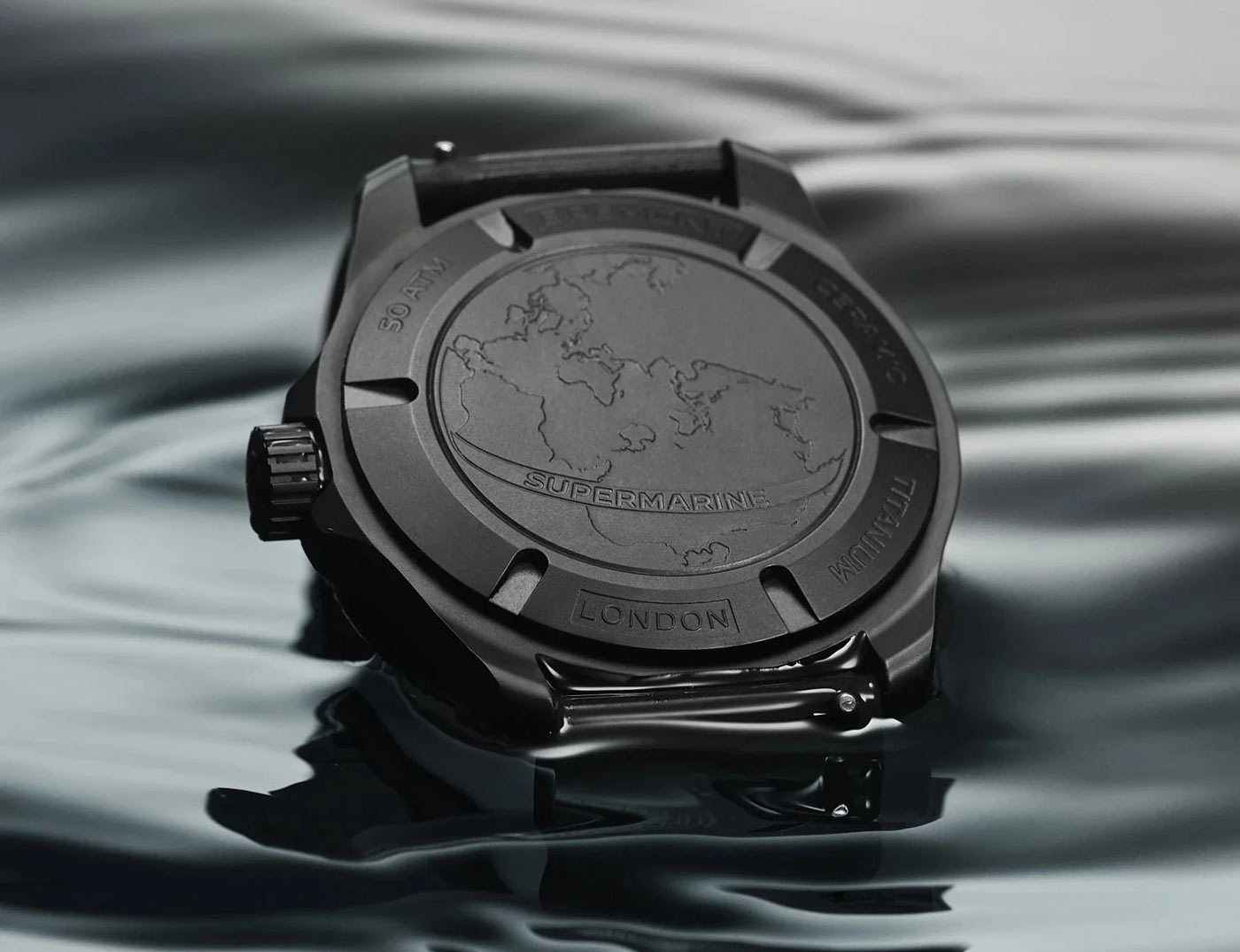 An evolution of the Supermarine 500M, the case was redesigned with a titanium movement container and a new knurled titanium bezel. The movement container is secured with a PVD coated titanium case back – engraved with the world’s oceans. The mono-block case structure starts as ceramic powder that is molded and then sintered at 1,450°C, shrinking by 23% to achieve perfect hardness. With an impressive 500-metre water resistance and a helium escape valve, it’s engineered to maintain precision at depth. Limited to 150 pieces, the watch comes fitted to a black rubber bracelet or black and grey NATO style strap.