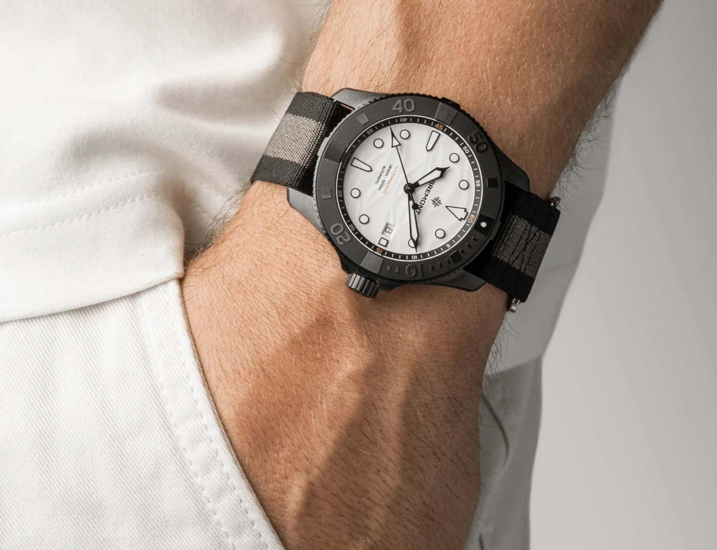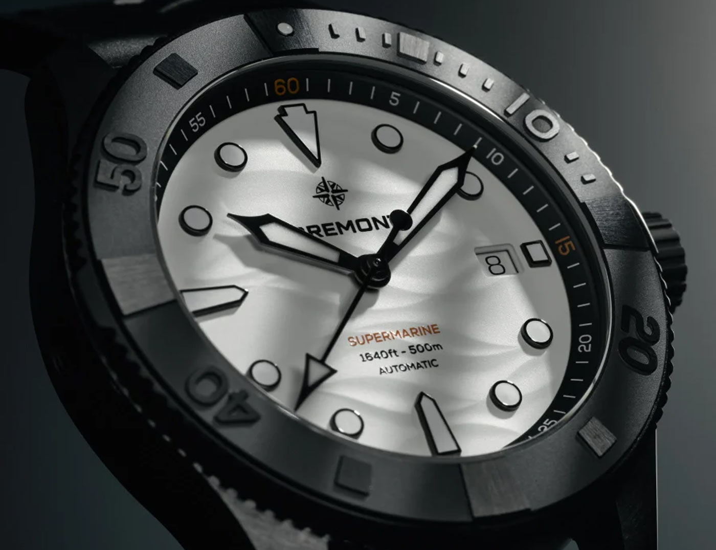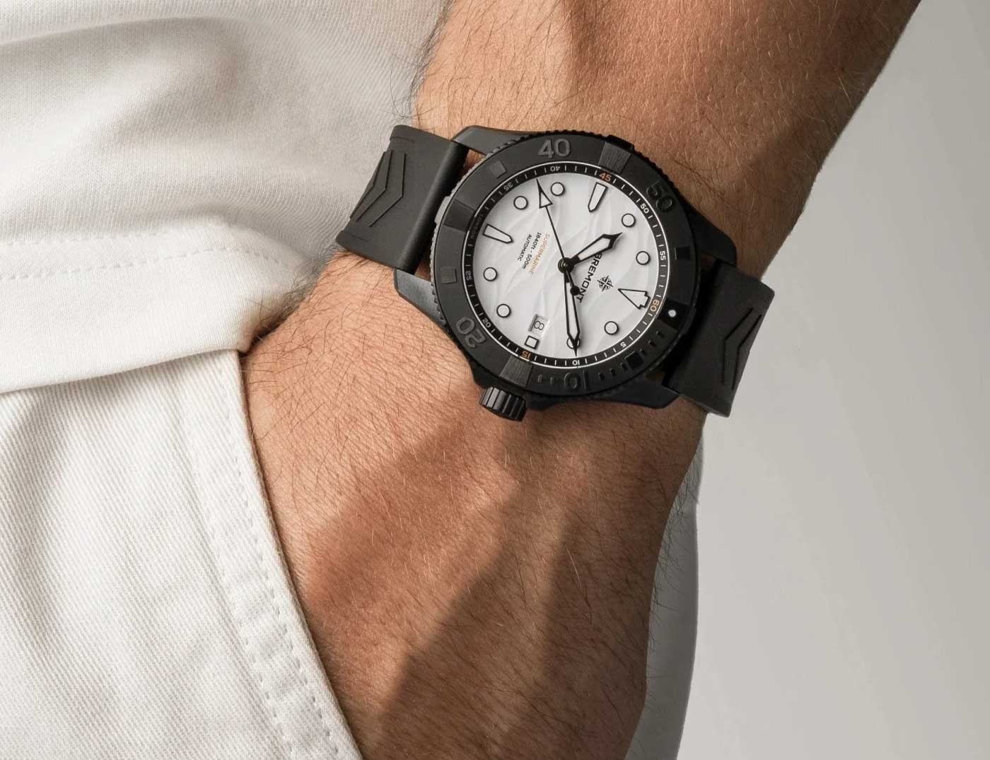 Bremont’s Supermarine Full Ceramic is now available with a crisp white dial encased in black ceramic. This monochromatic design introduces a clean, modern aesthetic to the Supermarine collection. Embossed with a 3D wave pattern, the ‘polar white’ ceramic dial has black hands and indexes infilled with white Super-LumiNova (blue emission). The date window is nestled in an aperture at 3 o’clock.