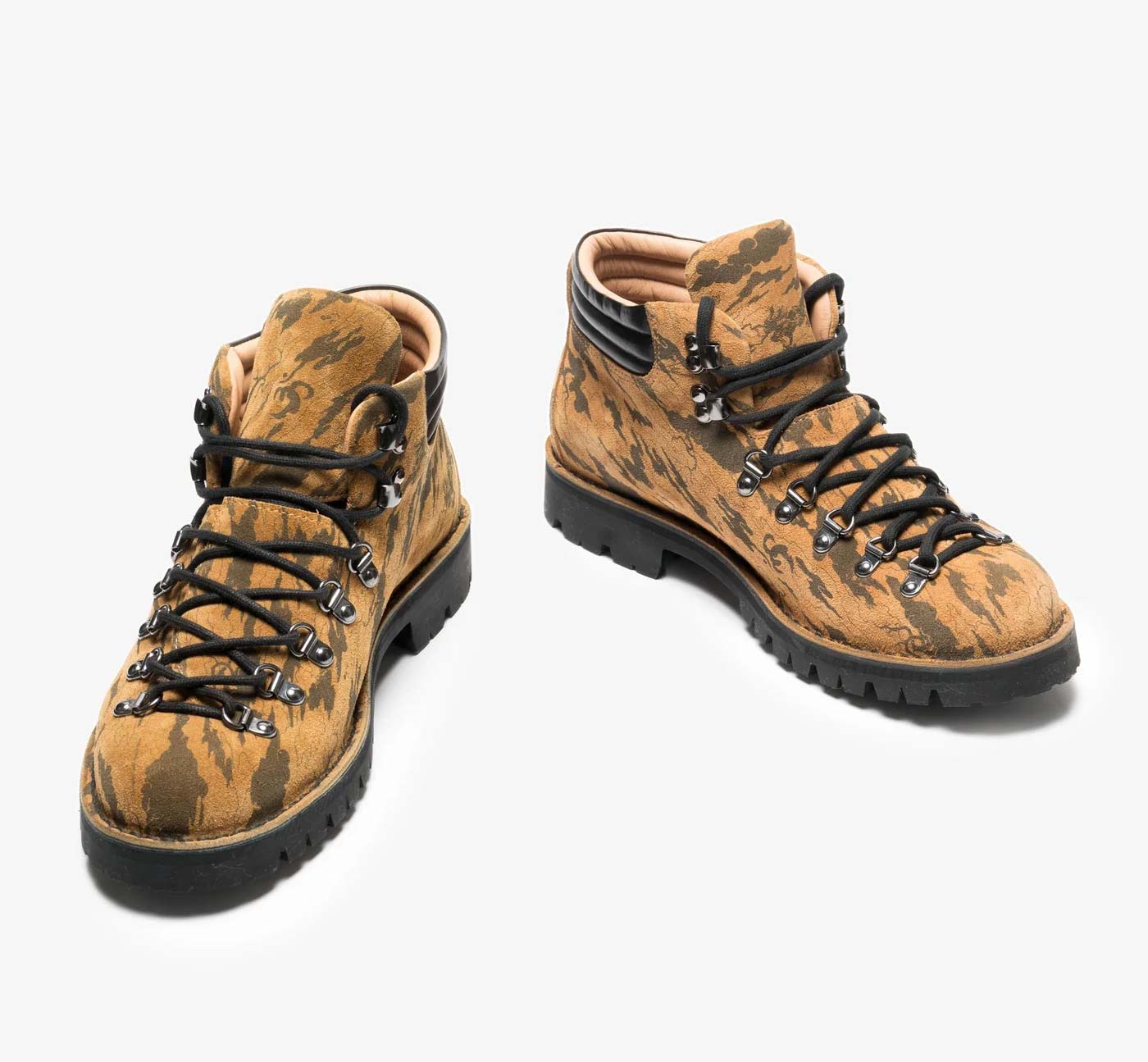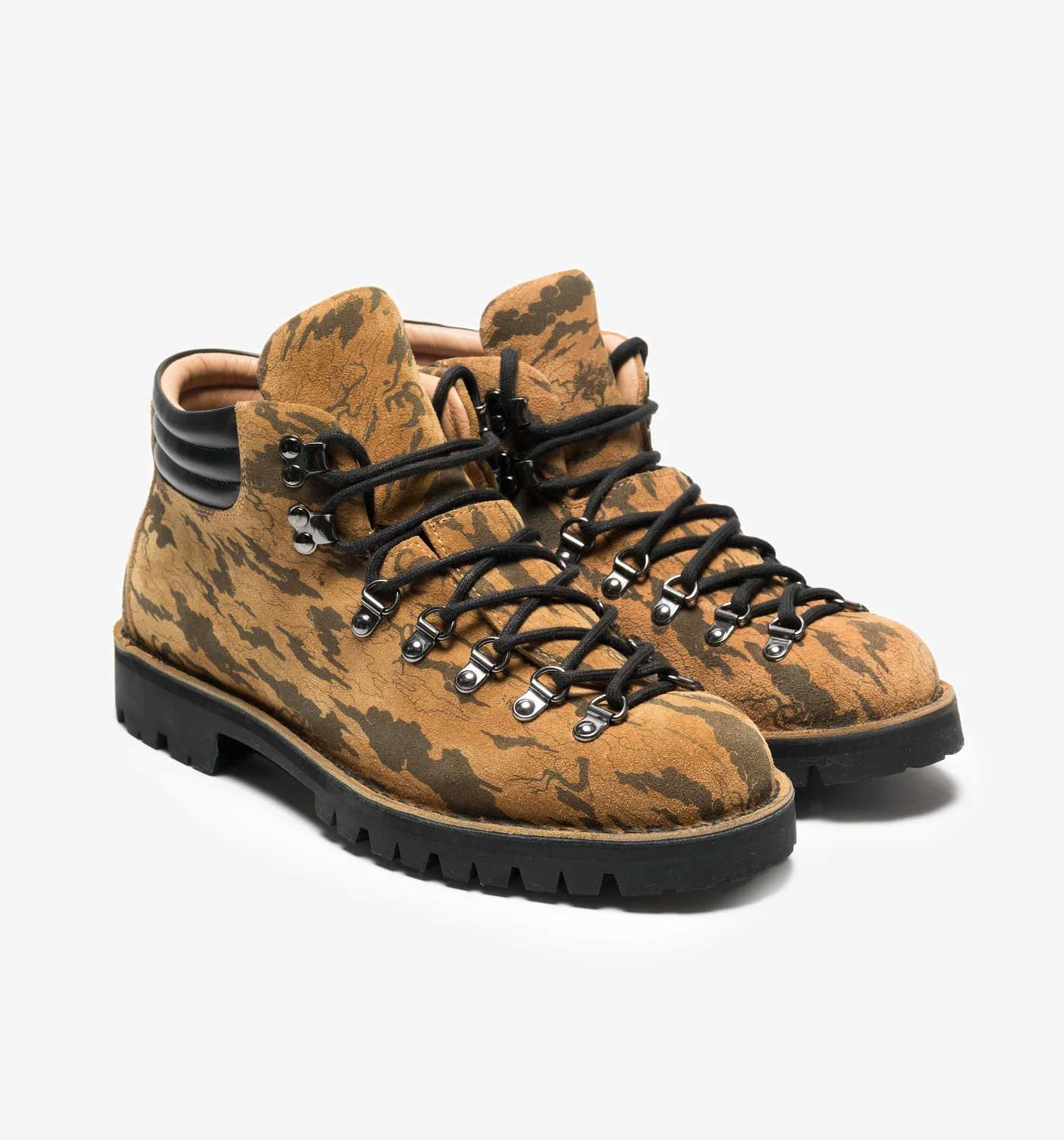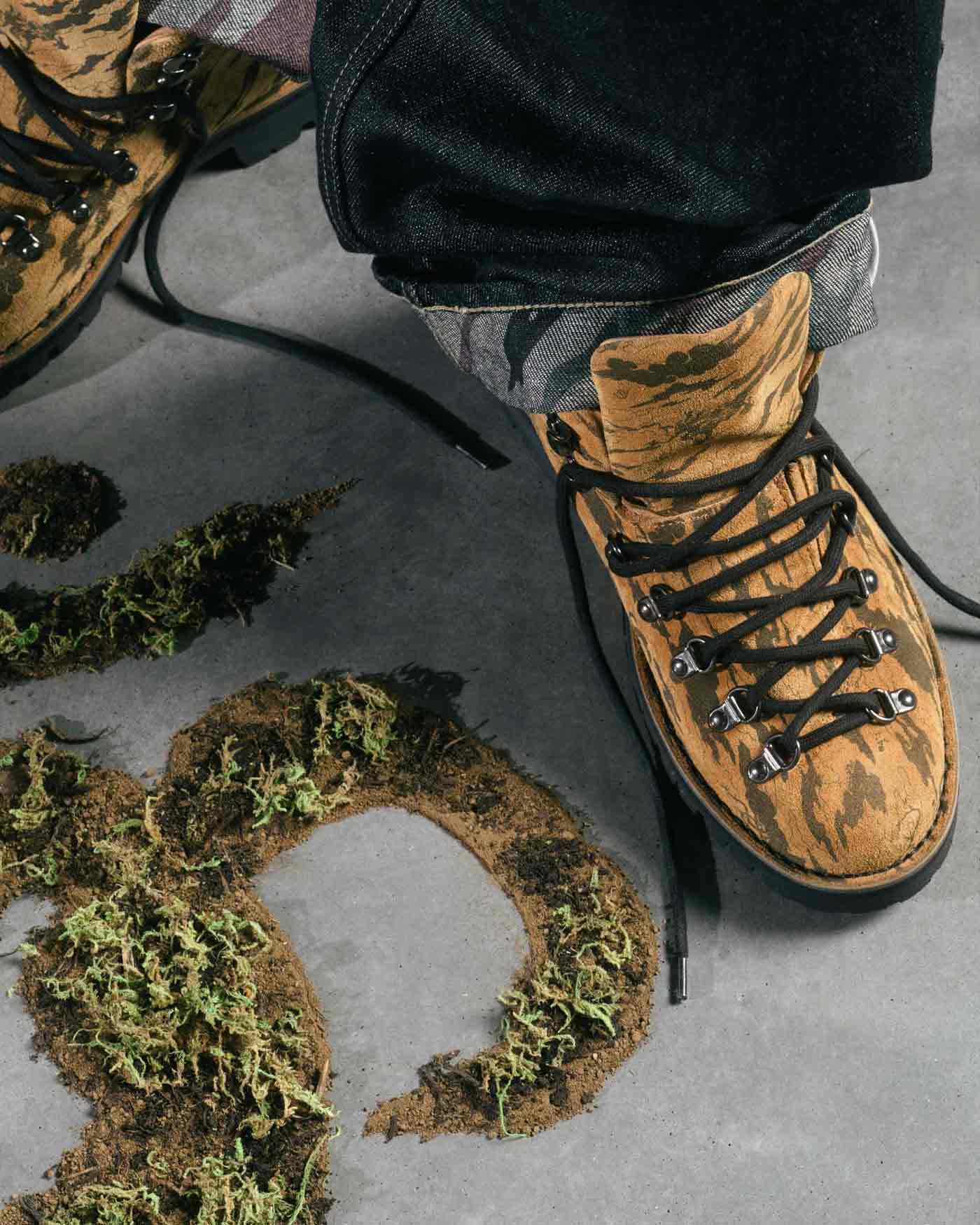 Maharishi and Fracap are reuniting to release a new interpretation of the Italian bootmaker’s M127 silhouette. Handmade in Italy, the Bonsai Mountaineer hiking boot is crafted from Italian suede, paired with a vegetable-dyed leather ankle cuff and calf-leather lining. The suede is laser-etched with Maharishi’s signature camouflage pattern, DPM: Bonsai Forest. This house pattern incorporates symbols of peace and nature such as bonsai trees growing from clouds, and dragons representing man’s spiritual journey. Bonsai Forest is a key part of Maharishi’s camouflage messaging. Reclaiming disruptive camo patterns (DPM) from their military associations and focusing on the pattern’s natural roots. The boot is completed with a Vibram commando sole, gunmetal eyelets, and two sets of laces – black and brown.