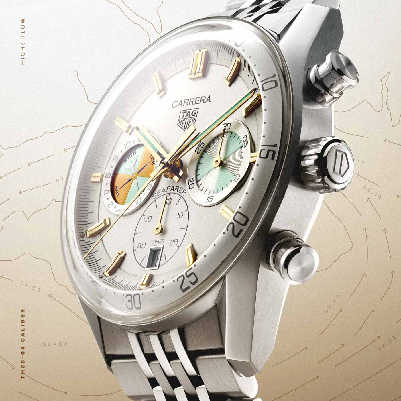 At the heart of the 42mm Carrera Chronograph Seafarer is the new in-house TH20-04 automatic movement – specifically developed to incorporate the tide indicator function. The function is easy to set using the special ‘TIDE’ button located at the 9 o’clock position on the case. While at 3 o’clock, the counter’s distinctive teal accents pay tribute to regatta timing. TAG dubbed the color ‘Intrepid Teal’ after the 1967 America’s Cup-winning yacht Intrepid. The 1967 race inspired Jack Heuer to create the original Skipper regatta chronograph the following year. Intrepid Teal highlights appear on the hour/minute hands, the 30-minute counter and on the tide indicator, where it is paired with a dark yellow. These teal and yellow accents take inspiration from the Heuer Seafarer model produced for Abercrombie & Fitch.