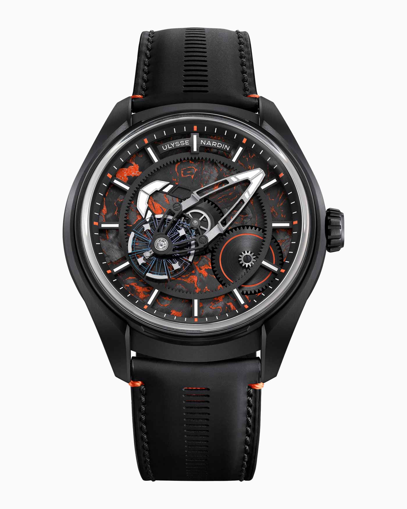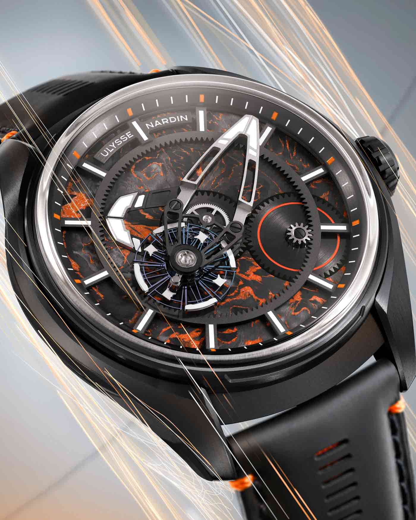 The Freak X Gumball 3000 – Edition 2 features a black and orange palette inspired by the energy and visual intensity of the festival. At the center of the design is an hour disc made from Carbonium, an advanced composite material produced with carbon fibers upcycled from aerospace industry. Ulysse Nardin mixes the carbon fibers with a vivid orange epoxy resin. No two Carbonium discs are alike. With no hands and no dial, the movement itself is the display. The rotating orange Carbonium disc completes one rotation every 12 hours to indicate the hours. While a flying carousel – held without an upper bridge – rotates once per hour to indicate the minutes. The minute wheel uses an orange Super-LumiNova ring for illumination, while the indexes and bridges use white emission Super-LumiNova.