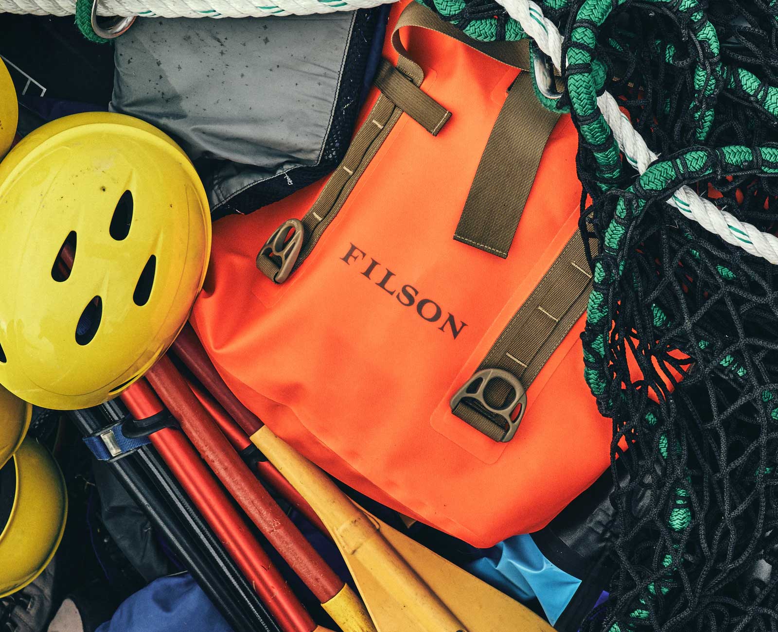 Filson expands its ‘dry bag’ range with the new Dry Roll-Top Tote. Built with TPU coated nylon tarpaulin fabric, the bag is 100% waterproof when the top is rolled down 3 turns and the side buckles cinched. It’s generous 28-liter capacity accommodates a weekend’s-worth of clothing, and the padded shoulder strap allows hands-free carry. For hand carry, the 2” wide webbing handles feature neoprene grips. The handles extend down the sides for added strength and feature MOLLE loops and D-rings for added utility. Like all Filson dry bags, the totes seams are sealed with radio-frequency welding, the same technique used in manufacturing white-water rafts. While the tough TPU coating makes it resistant to punctures, abrasion and the effects of UV light.
